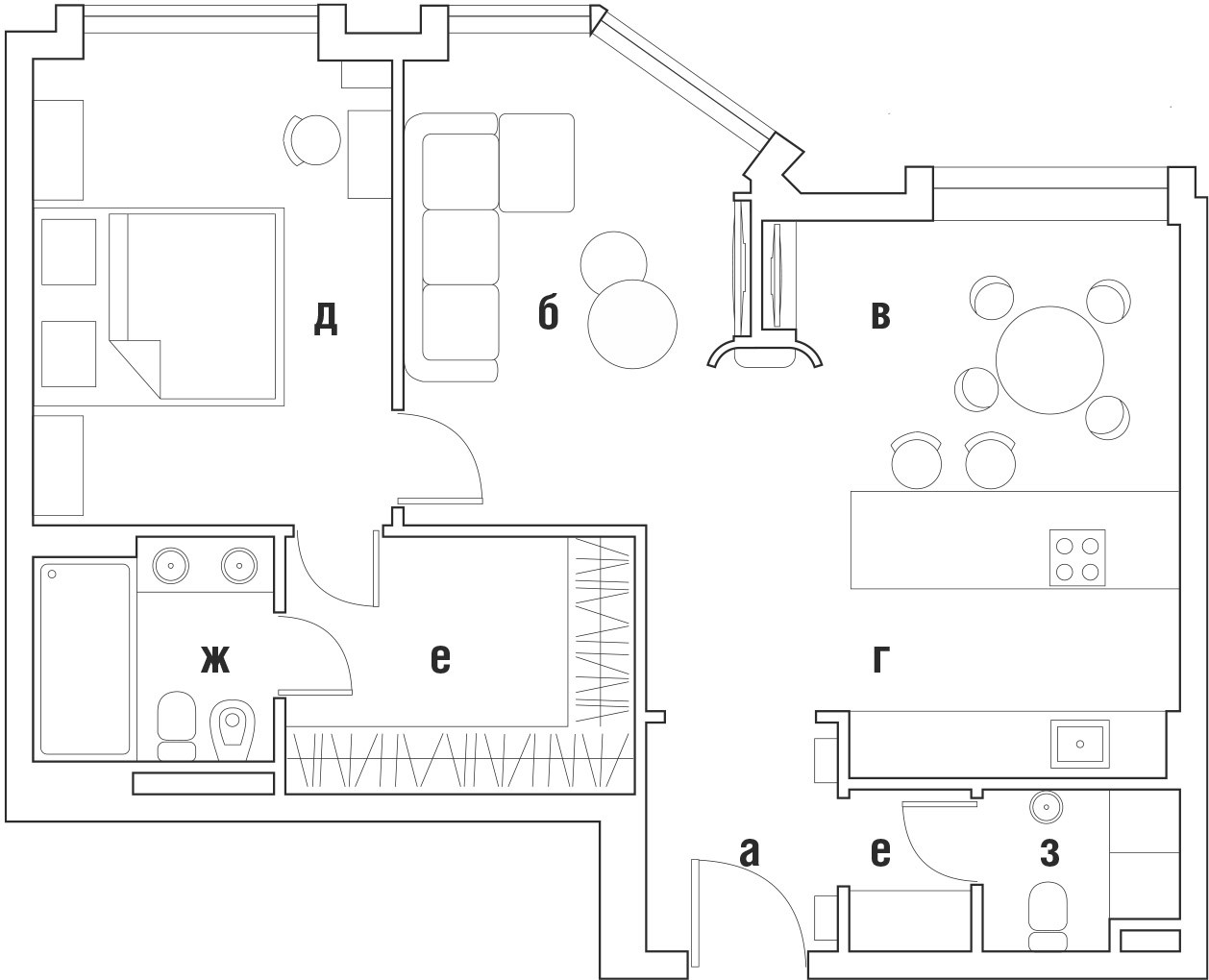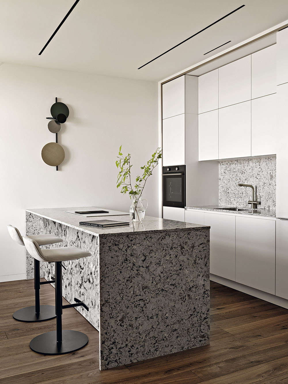 Все окна квартиры выходят на одну сторону, в связи с этим было принято решение разместить в «слепых» зонах все места хранения, вспомогательные помещения и санузлы, а гостиную, столовую и хозяйскую спальню выдвинуть к свету и раскрыть тем самым перспективу. Эффект пространства, пронизанного светом, был достигнут в полной мере. «Хозяйка квартиры прекрасно готовит, — рассказывает автор проекта Мария Фильштинская, — и как только мы попали на объект на этапе приемки его у застройщика, ею было высказано мнение, что было бы прекрасно готовить и созерцать всю красоту открывающегося паркового пространства за окном. Voilà — сделано. Кухня была спроектирована с учетом того, чтобы при занятии кулинарным искусством заказчица могла смотреть на открывающуюся панораму, и ничто не препятствовало этому». Это было одно из самых сложных проектных решений. Для него потребовались значительные усилия по согласованию переноса коммуникаций и устройству дополнительных инженерных узлов.