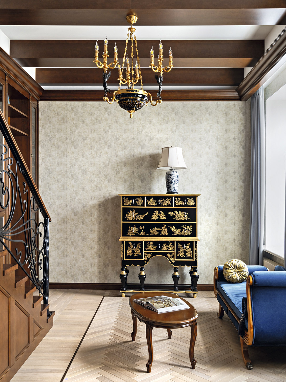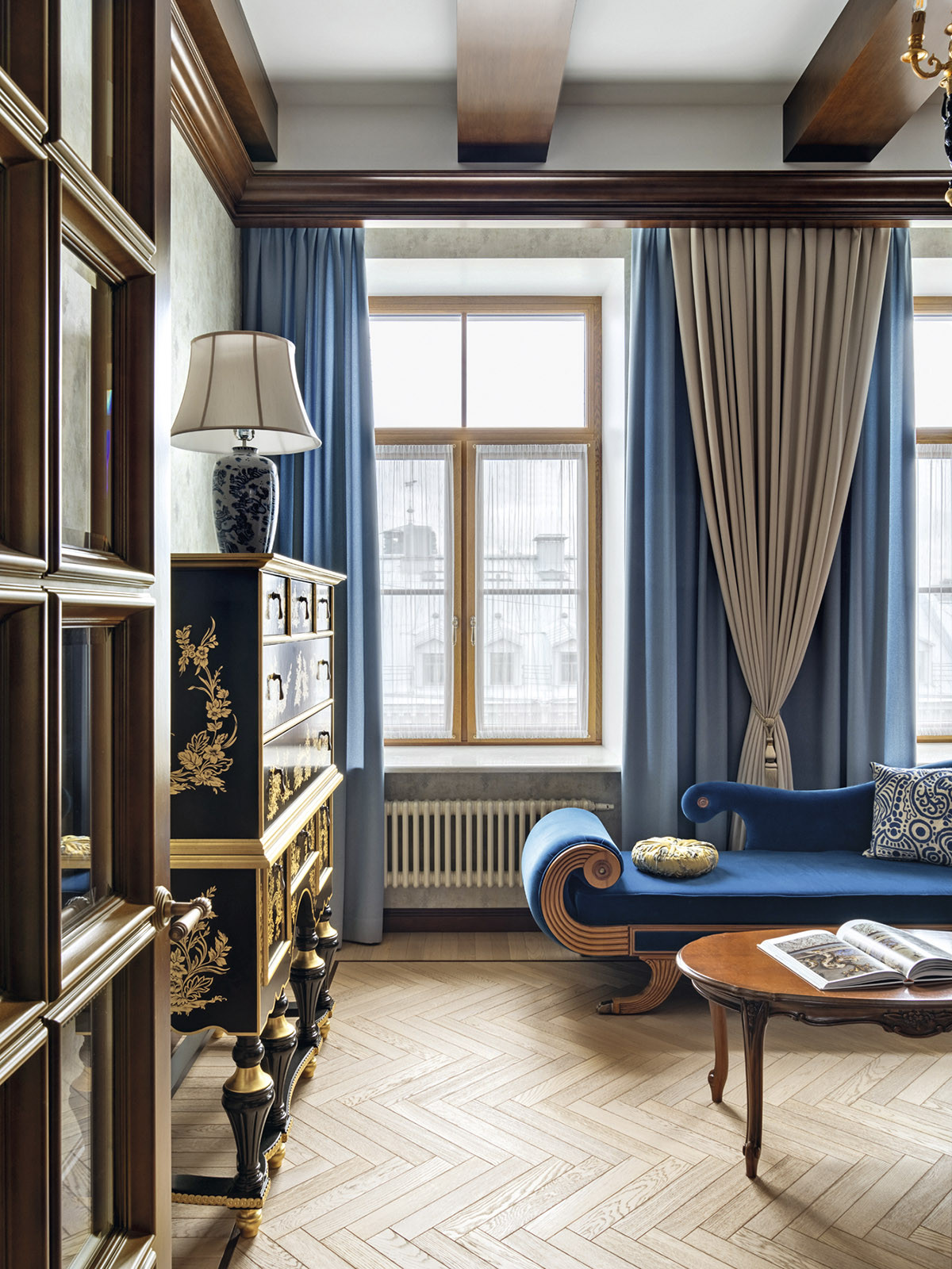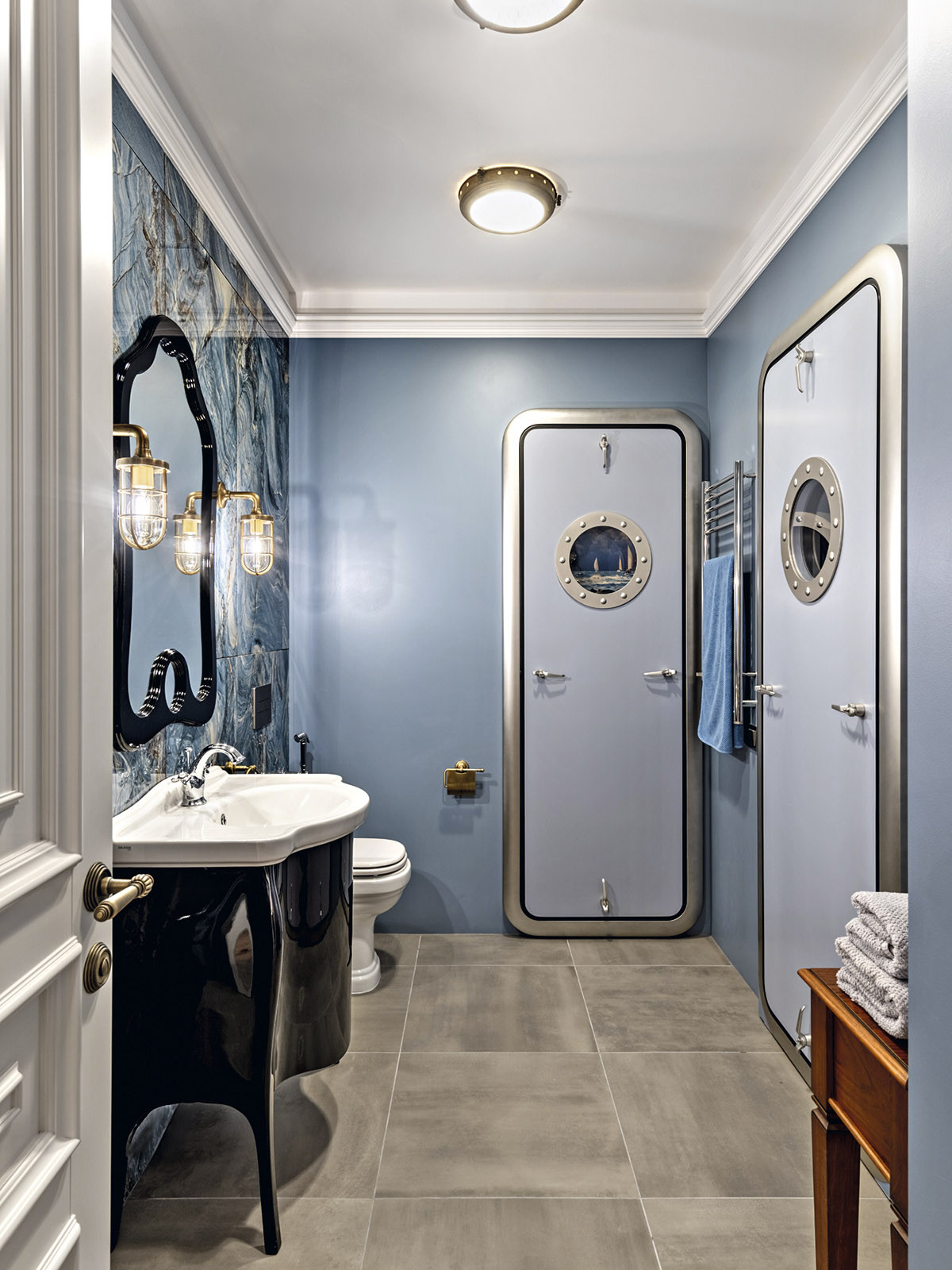 Квартира расположена в самом сердце Санкт-Петербурга на Малой Конюшенной улице, в здании, признанном объектом культурного наследия. Вдохновившись духом исторического особняка — яркого представителя классицизма, архитекторы Ксения Леон и Александра Черногор мастерски объединили эстетику ампира, модерна и современной элегантности. «Заказчики — семейная пара, истинные театралы с тонким вкусом, сохранившие детскую непосредственность, — рассказывает автор проекта Александра Черногор. — Поэтому к интерьеру своей квартиры они подходили играючи, предоставляя себе и нам большое поле для воображения и реализации самых разных идей. Так, например, при создании интерьера гостевого санузла за основу был взят образ вымышленного подводного корабля Наутилуса — межкомнатные двери стали корабельными, появились иллюминаторы с парящими чайками, а стену в зоне раковины облицевали керамогранитом, напоминающим морские волны. Завершил образ настоящий барометр».
