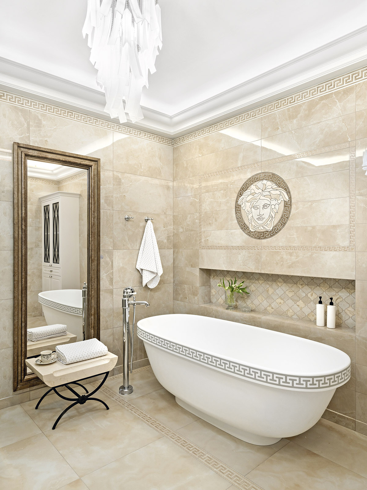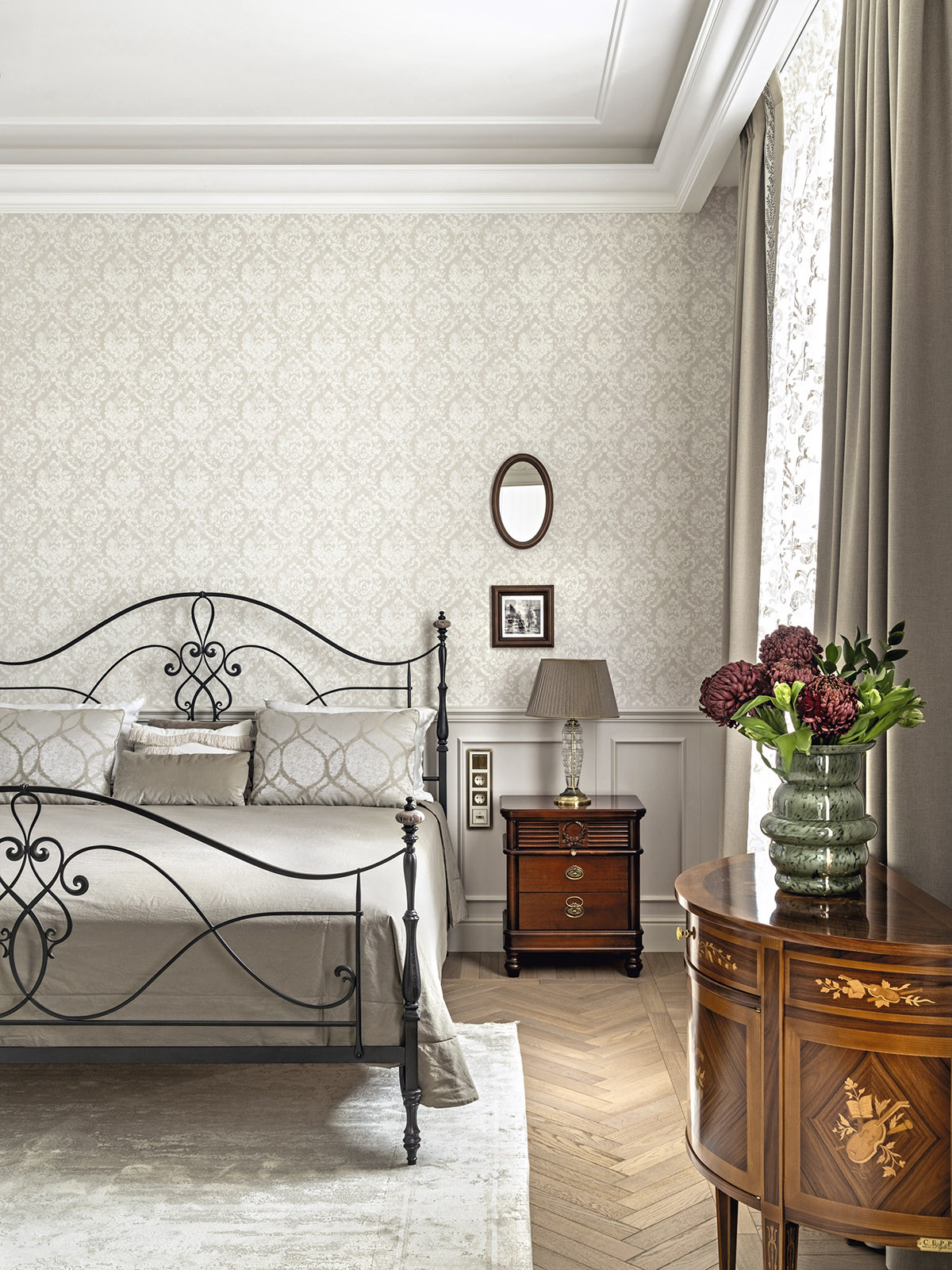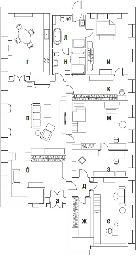 Квартира расположена в самом сердце Санкт-Петербурга на Малой Конюшенной улице, в здании, признанном объектом культурного наследия. Вдохновившись духом исторического особняка — яркого представителя классицизма, архитекторы Ксения Леон и Александра Черногор мастерски объединили эстетику ампира, модерна и современной элегантности. «Заказчики — семейная пара, истинные театралы с тонким вкусом, сохранившие детскую непосредственность, — рассказывает автор проекта Александра Черногор. — Поэтому к интерьеру своей квартиры они подходили играючи, предоставляя себе и нам большое поле для воображения и реализации самых разных идей. Так, например, при создании интерьера гостевого санузла за основу был взят образ вымышленного подводного корабля Наутилуса — межкомнатные двери стали корабельными, появились иллюминаторы с парящими чайками, а стену в зоне раковины облицевали керамогранитом, напоминающим морские волны. Завершил образ настоящий барометр».