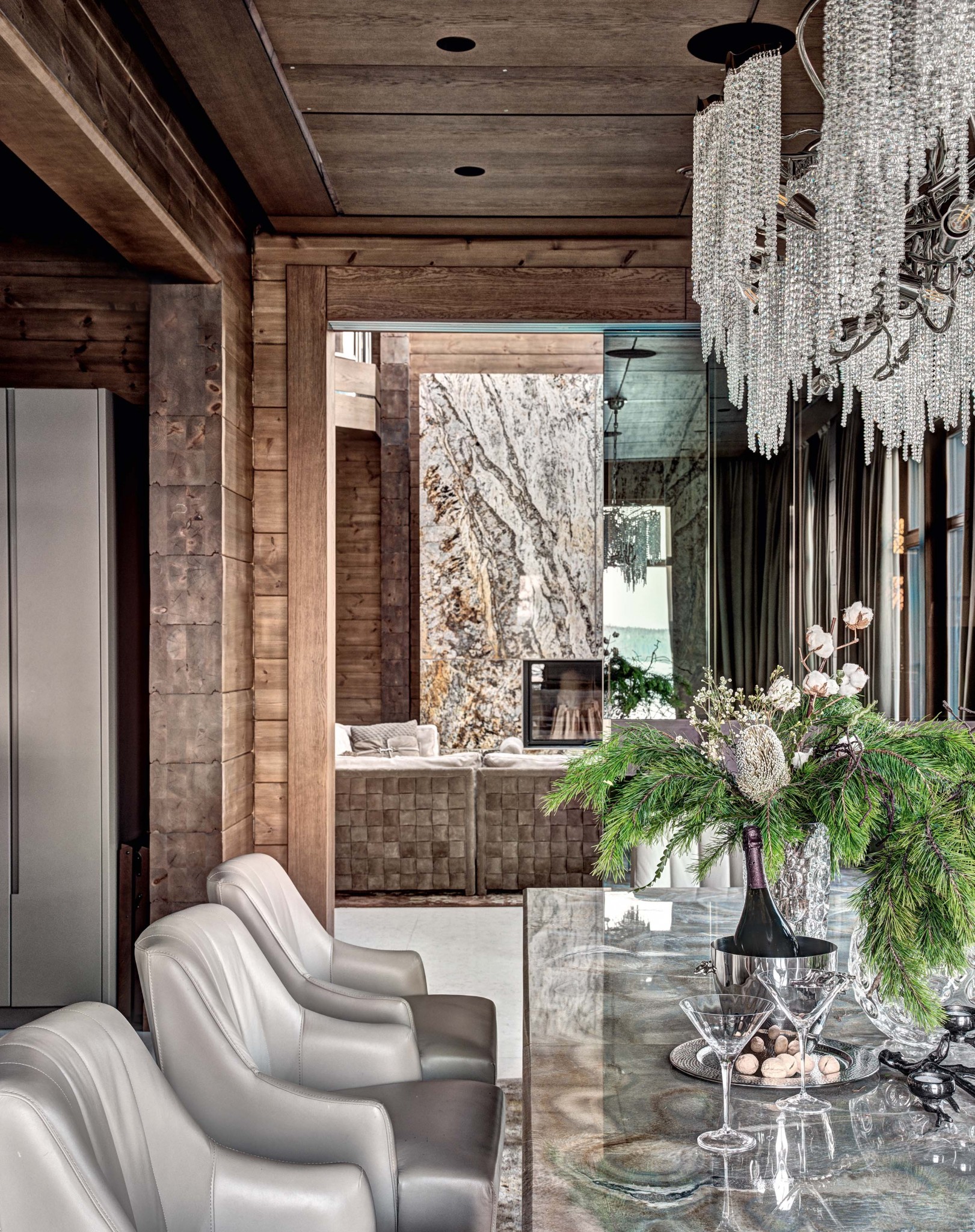 Этот проект впечатляет не только своим масштабом. Четырёхэтажное строение с нижними монолитными этажами и верхними жилыми, выполненными из бруса, расположено на склоне холма, в окружении леса. При этом оно выглядит лёгким и гармоничным за счёт больших окон и стеклянной крыши. Деревянную часть дома проектировала и собирала компания HONKA вместе с архитектором Владимиром Шороховым. Авторы интерьера Ирина и Юрий Вопшиновы подключились ещё на стадии проектирования, внесли изменения в планировку комнат и слегка скорректировали деревянный конструктив строения. Помимо предусмотренных больших витражных окон заказчик предложил сделать ещё и огромный зенитный фонарь во всю длину основной части дома. Эту задумку удалось реализовать, и теперь даже в пасмурную погоду в гостиной светло. Планировочное решение традиционно для загородных домов с поправкой на природный рельеф. Так, с одной стороны дома можно сразу войти на третий, парадный этаж с гостиной, столовой и кухней, а с другой расположен вход в бассейн и спа–зону уровнем ниже. Первый, цокольный этаж — технический, большая его часть находится под землёй. На четвёртом этаже — спальни для членов семьи и гостей, а в башне — кабинет хозяина. Все четыре этажа объединены лифтом, к лифтовой шахте крепится и лестница. У домов из бруса даже самого высокого уровня есть свои нюансы. В них приятно живётся и легко дышится. Но дерево — материал, реагирующий на изменения влажности и температуры, и любые конструкции внутри дома необходимо фиксировать на особые «скользящие» крепежи. Тем неожиданнее увидеть в окружении деревянных стен модный современный интерьер с элементами ар–деко. Активную и грубую фактуру дерева решено было уравновесить изысканными фактурами: гладким натуральным камнем, блестящим хромированным металлом, прозрачным хрусталём и мягкими коврами, бархатом, замшей,