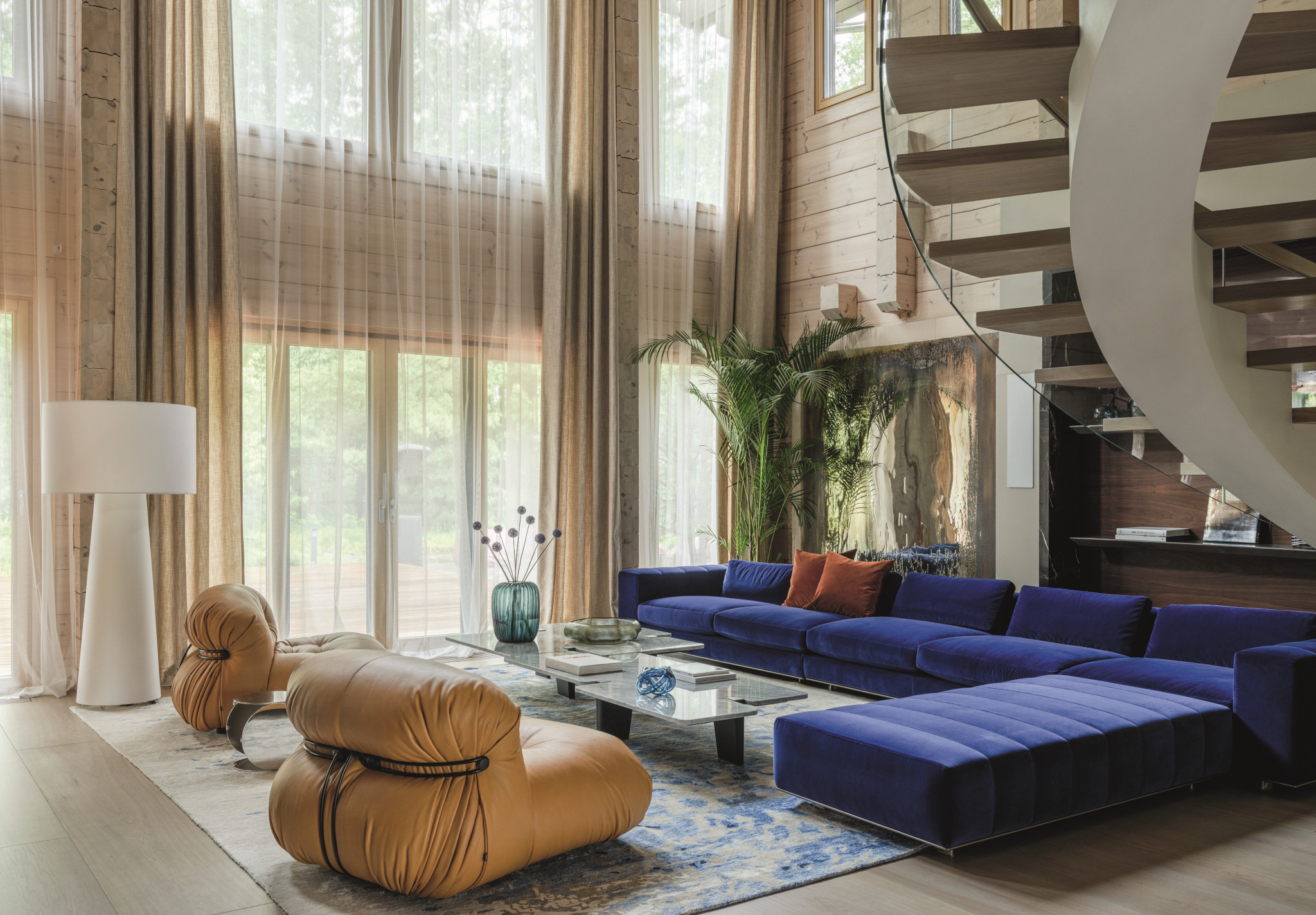Ключевой задачей было создание комфортной и удобной планировки в рамках нового каркаса. «Мы убрали все перегородки, предложенные застройщиком, улучшили логику и функциональность пространства. Но нашей главной целью было создание интерьера, способного вдохновлять, — рассказывает Мария. — Поэтому мы старались максимально понять внутренний мир, желания и потребности заказчиков, чтобы финальный результат подходил их образу жизни и мыслей». Дом приобрел удобную и при этом нестандартную планировку. Первый этаж отдали под просторную светлую гостиную, из которой можно попасть в зону столовой и кухни с выходом на террасу, а также в зону малой гостиной, предназначенной для более камерных встреч. И хотя интерьеры выполнены в едином стиле, каждая следующая комната рассказывает свою уникальную историю с помощью дизайна и искусства. Из малой гостиной можно попасть в детский игровой блок, оборудованный всем необходимым для активных и творческих занятий. А также в цокольный этаж, где оборудован полноценный домашний мини-клуб с профессиональным оборудованием, диджейским пультом и домашним кинотеатром. На втором этаже разместилась главная спальня с эффектной ванной комнатой, которая буквально растворяется в пейзаже благодаря панорамным окнам, будуар хозяйки дома и просторный рабочий кабинет супруга, а также детские спальни. В интерьере много оригинальных решений и стилистических приемов, делающих этот дом особенным и неповторимым.