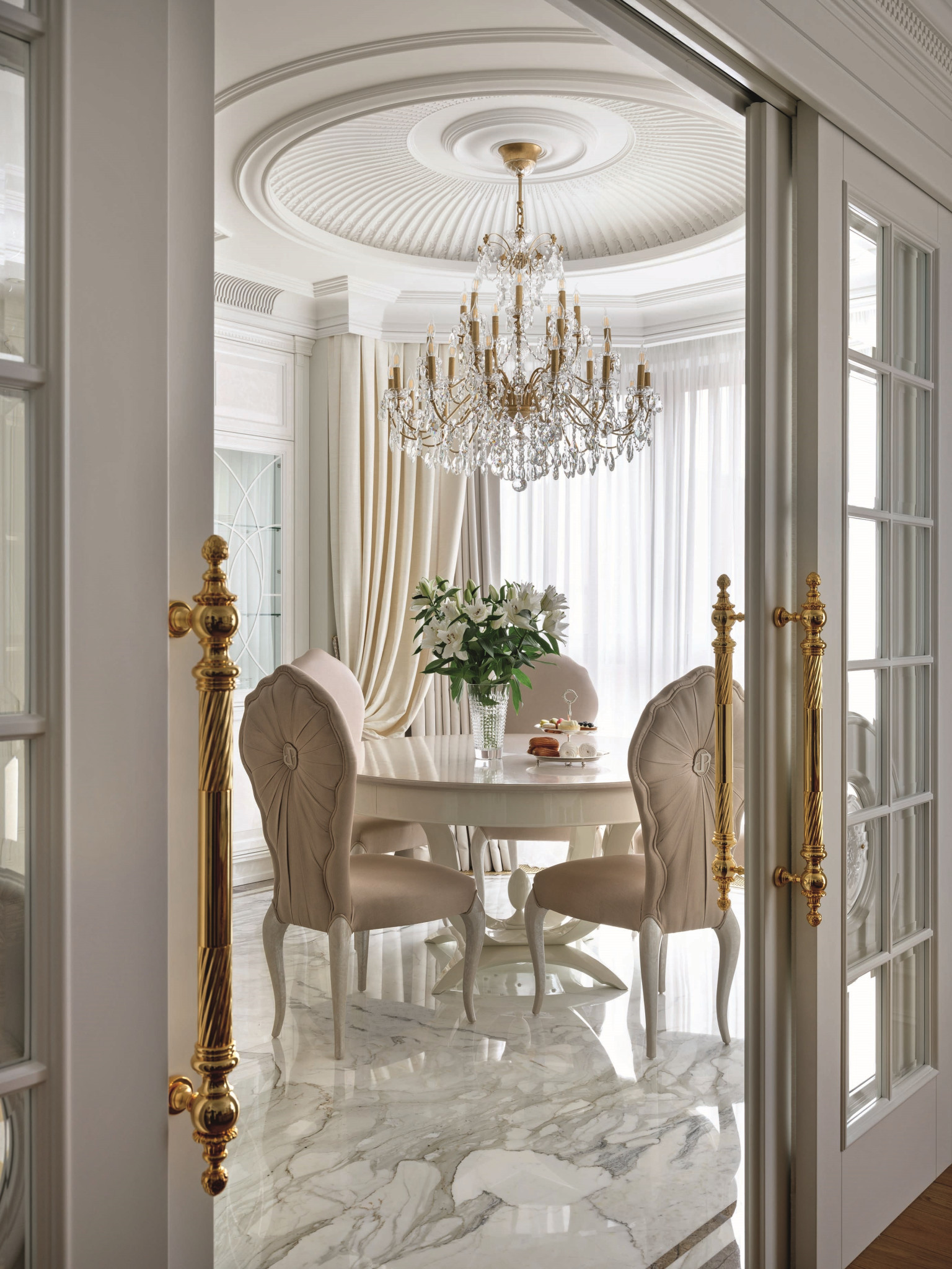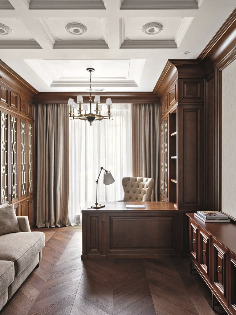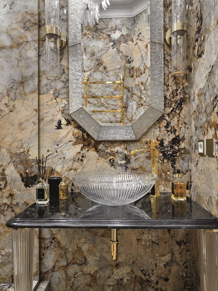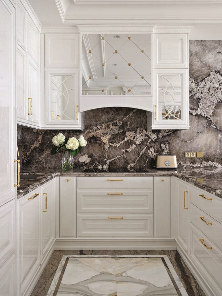Планировка квартиры ясная и комфортная: справа от входа — парадная зона, состоящая из гостиной и кухни-столовой, слева — приватная, со спальнями и кабинетом. В спальной зоне удалось выделить место для двух отдельных гардеробных и при этом сохранить большое пространство для ванной комнаты. В квартире три санузла, а также есть маленькая, но функциональная постирочная. На планировочное решение повлияли несущие колонны и расположение мокрых зон, поэтому не получилось избежать коридоров, но их задействовали для создания дополнительных мест хранения. А самое главное, что коридор между приватной и парадной частями квартиры удалось превратить в элегантный, классический по стилю холл — за счет узора на полу, выполненного в технике инкрустации латунью, и архитектурно выразительного потолочного купола. «Он получился вследствие грамотной работы с высотами, — объясняет управляющий проектом Александр Пригодич. — Часть потолка в коридоре пришлось занизить для прокладки системы вентиляции, но в центральной точке мы сохранили высоту 3,5 метра и подчеркнули ее куполом». Дополнительным акцентом в этой зоне служит знаковая хрустальная люстра Baccarat. В этой квартире есть и второй подобный купол — он расположен на потолке в столовой над обеденным столом: центр купола и стола находится на единой оси. Акцент сделан на работе с природным рисунком мрамора: с помощью раскладки и естественного узора камня на полу создали центр композиции, который совпал с центром стола и купола. Благодаря таким деталям интерьер выглядит безупречно, а чтобы придать ему живость, его дополнили красивыми акцентными вещами. Это, например, золоченая резная консоль и камин в гостиной. Или, допустим, люстра в столовой: в солнечном свете кристаллы создают фантастическую игру бликов. «Этот интерьер по сути эклектичный, с элементами современной классики, — объясняет Диана. — Мы уже давно не ориентируемся на чистые стили, а стараемся создать гармоничное пространство, исходя из запроса заказчика. Тренды скоротечны; мы же стремимся сделать интерьер, который будет оставаться актуальным на протяжении многих лет — такой, который не захочется менять еще лет двадцать». Технологически эта квартира исключительно современна: она оснащена системой «умный дом», которая отвечает за канальное кондиционирование, увлажнение воздуха, акустику, сценарии освещения, сюда же подключены система безопасности и видеонаблюдение. Казалось бы, здесь уже есть всё для комфорта хозяев, но интерьер продолжает улучшаться. Недавно, уже после того, как объект был сдан и проведена съемка, авторы подобрали в столовую сервиз Bernardaut, компаньоны от Baccarat, Lalique, менажницы Villari, кофейные пары, вазы Lalique и бокалы, а интерьер кабинета дополнили скульптурами от Villari.