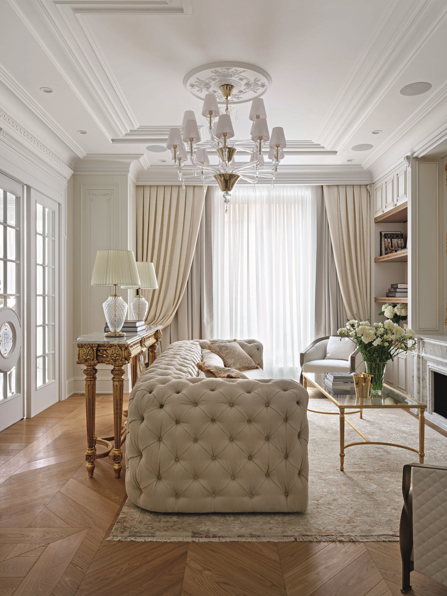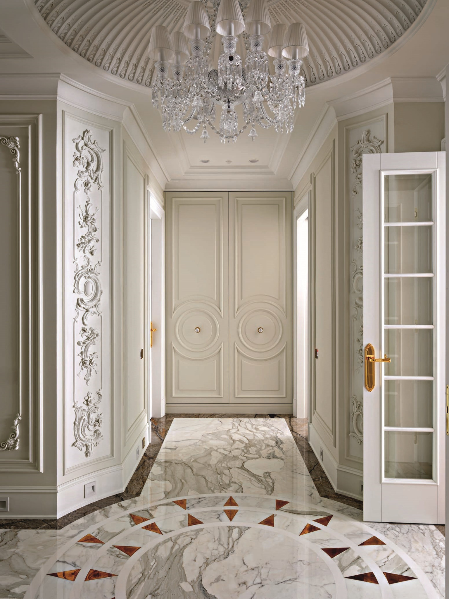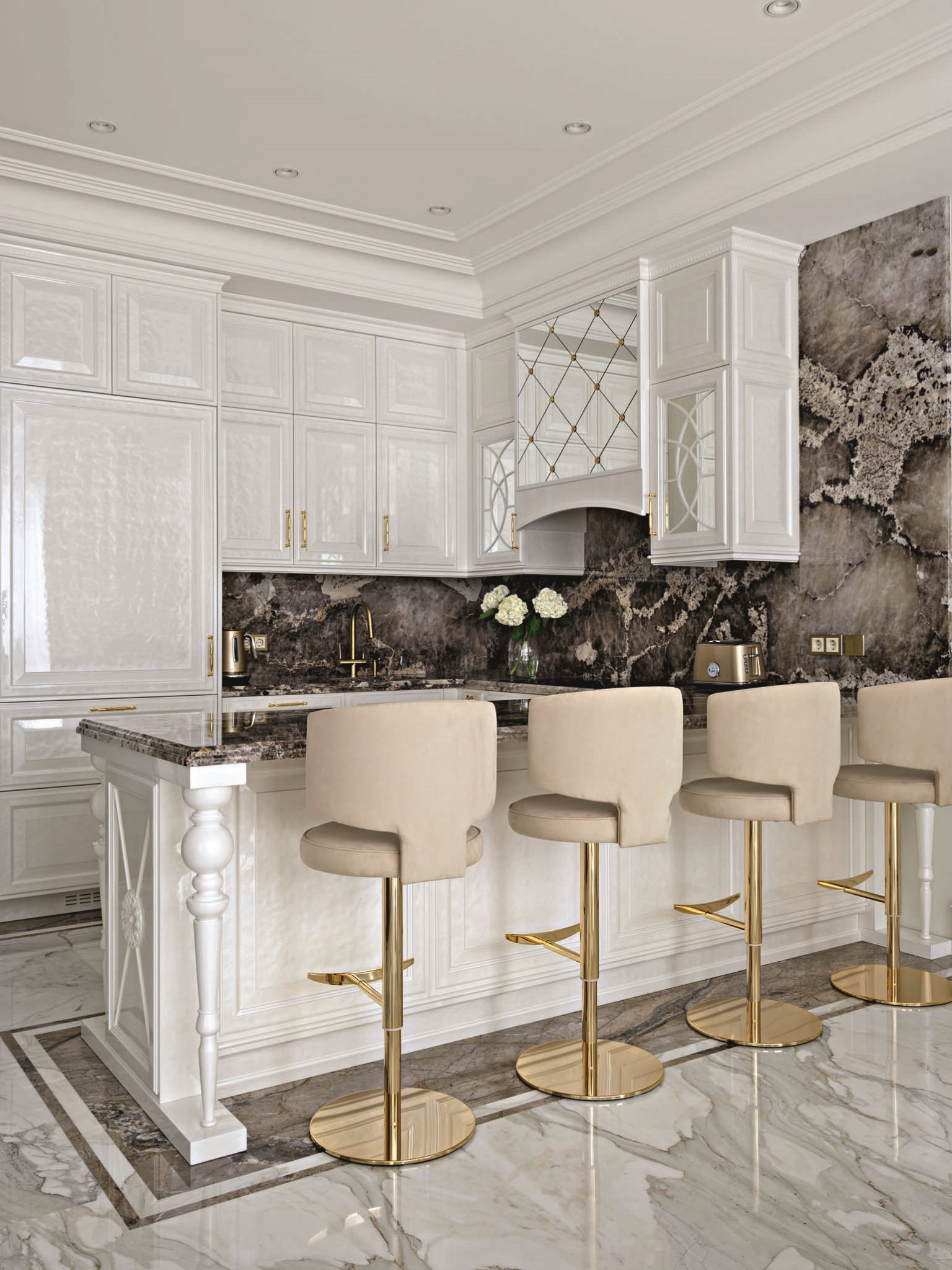 Планировка квартиры ясная и комфортная: справа от входа — парадная зона, состоящая из гостиной и кухни-столовой, слева — приватная, со спальнями и кабинетом. В спальной зоне удалось выделить место для двух отдельных гардеробных и при этом сохранить большое пространство для ванной комнаты. В квартире три санузла, а также есть маленькая, но функциональная постирочная. На планировочное решение повлияли несущие колонны и расположение мокрых зон, поэтому не получилось избежать коридоров, но их задействовали для создания дополнительных мест хранения. А самое главное, что коридор между приватной и парадной частями квартиры удалось превратить в элегантный, классический по стилю холл — за счет узора на полу, выполненного в технике инкрустации латунью, и архитектурно выразительного потолочного купола. «Он получился вследствие грамотной работы с высотами, — объясняет управляющий проектом Александр Пригодич. — Часть потолка в коридоре пришлось занизить для прокладки системы вентиляции, но в центральной точке мы сохранили высоту 3,5 метра и подчеркнули ее куполом». Дополнительным акцентом в этой зоне служит знаковая хрустальная люстра Baccarat. В этой квартире есть и второй подобный купол — он расположен на потолке в столовой над обеденным столом: центр купола и стола находится на единой оси. Акцент сделан на работе с природным рисунком мрамора: с помощью раскладки и естественного узора камня на полу создали центр композиции, который совпал с центром стола и купола. Благодаря таким деталям интерьер выглядит безупречно, а чтобы придать ему живость, его дополнили красивыми акцентными вещами. Это, например, золоченая резная консоль и камин в гостиной. Или, допустим, люстра в столовой: в солнечном свете кристаллы создают фантастическую игру бликов. «Этот интерьер по сути эклектичный, с элементами современной классики, — объясняет Диана. — Мы уже давно не ориентируемся на чистые стили, а стараемся создать гармоничное пространство, исходя из запроса заказчика. Тренды скоротечны; мы же стремимся сделать интерьер, который будет оставаться актуальным на протяжении многих лет — такой, который не захочется менять еще лет двадцать». Технологически эта квартира исключительно современна: она оснащена системой «умный дом», которая отвечает за канальное кондиционирование, увлажнение воздуха, акустику, сценарии освещения, сюда же подключены система безопасности и видеонаблюдение. Казалось бы, здесь уже есть всё для комфорта хозяев, но интерьер продолжает улучшаться. Недавно, уже после того, как объект был сдан и проведена съемка, авторы подобрали в столовую сервиз Bernardaut, компаньоны от Baccarat, Lalique, менажницы Villari, кофейные пары, вазы Lalique и бокалы, а интерьер кабинета дополнили скульптурами от Villari.