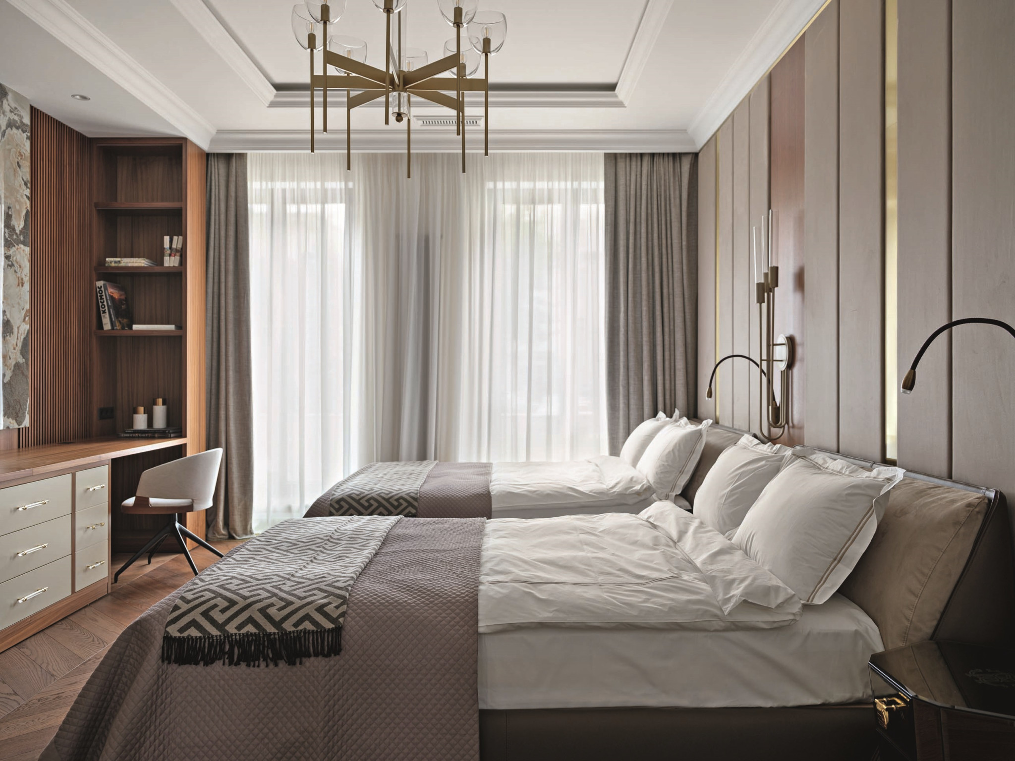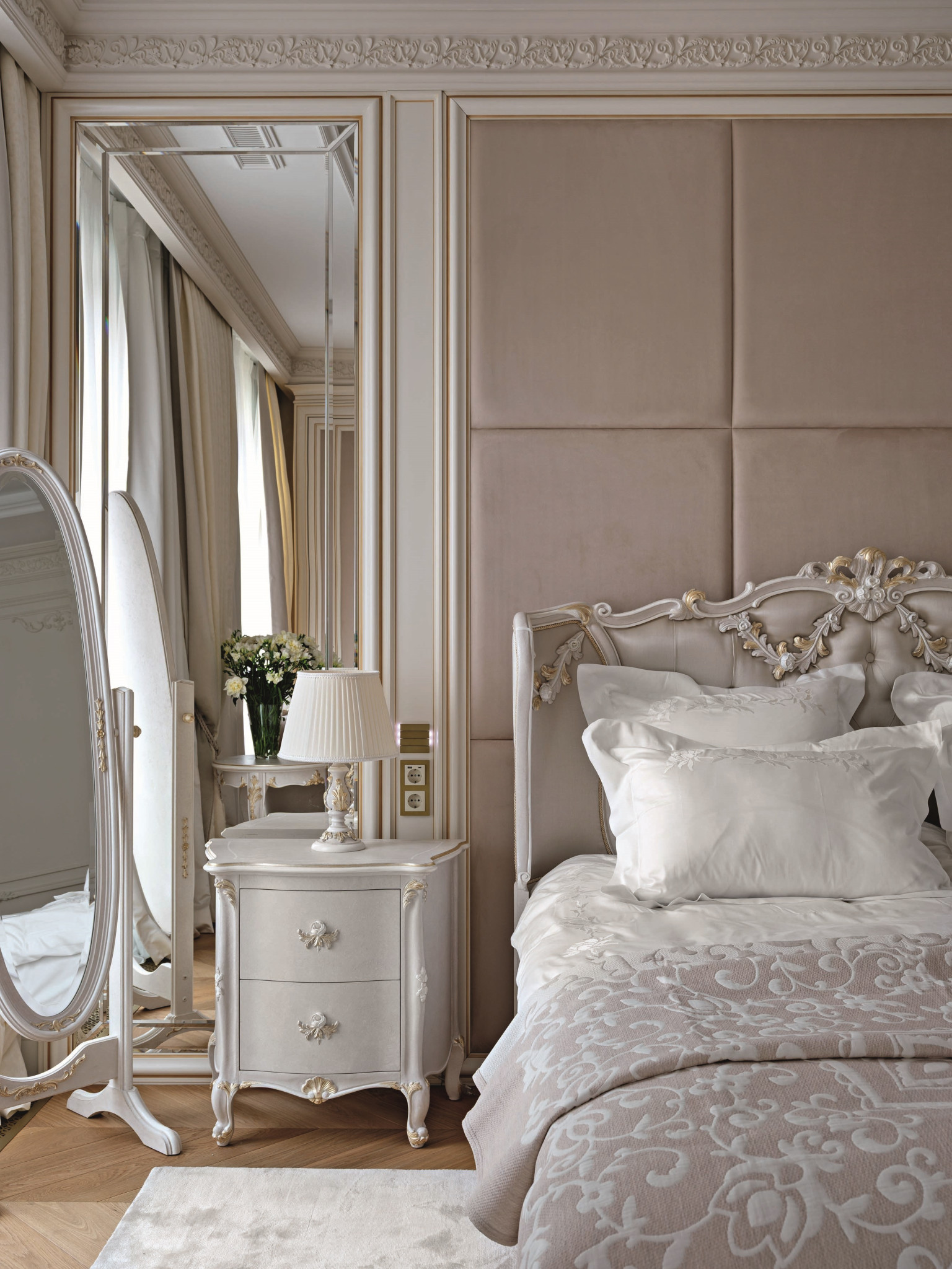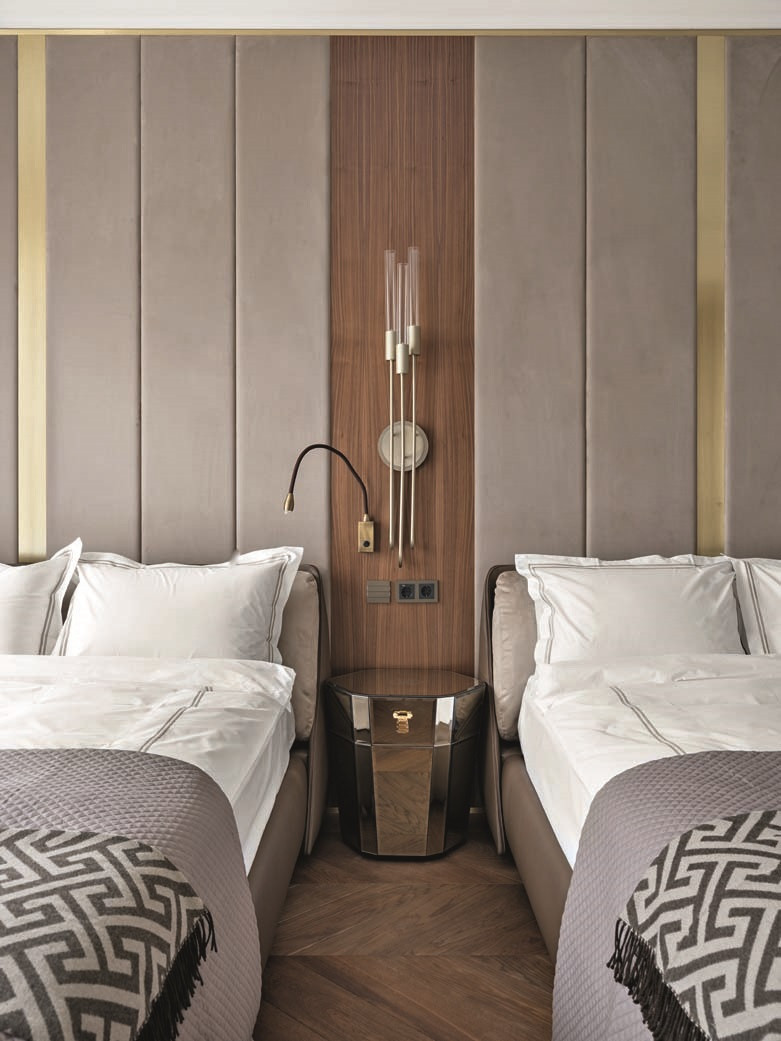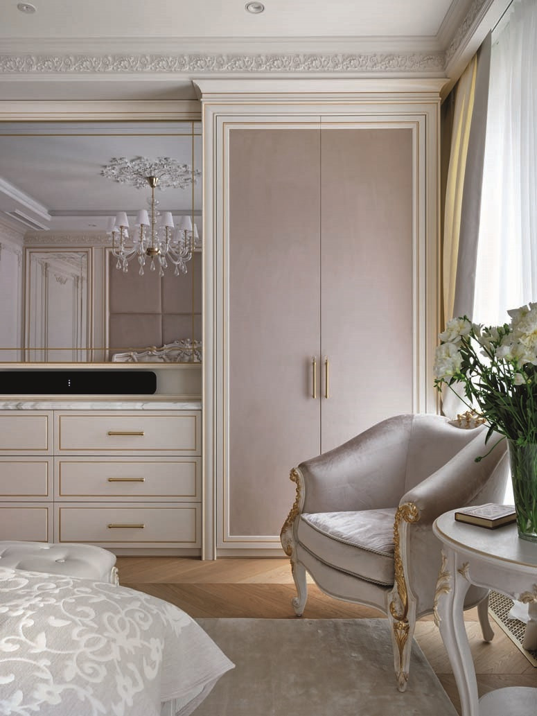 Идеальный интерьер для отдыха супружеской пары — таков характер этого элегантного светлого пространства, созданного командой бюро DesartDecor. Мягкие формы, приятные фактуры, теплые оттенки, деликатное золото, лепнина и полированный мрамор — здесь царит атмосфера релаксации и утонченной чувственности. И время тут течет по-особенному: ведь это драгоценное время «для себя». «Заказчики — семья с двумя детьми, — рассказывает арт-директор бюро Диана Тараканова. — Дети учатся в зарубежных школах и приезжают в Москву нечасто, поэтому для них была спроектирована одна комната с двумя кроватями, ванной и гардеробной. Создавать две детские, которые будут пустовать, сочли нерациональным».