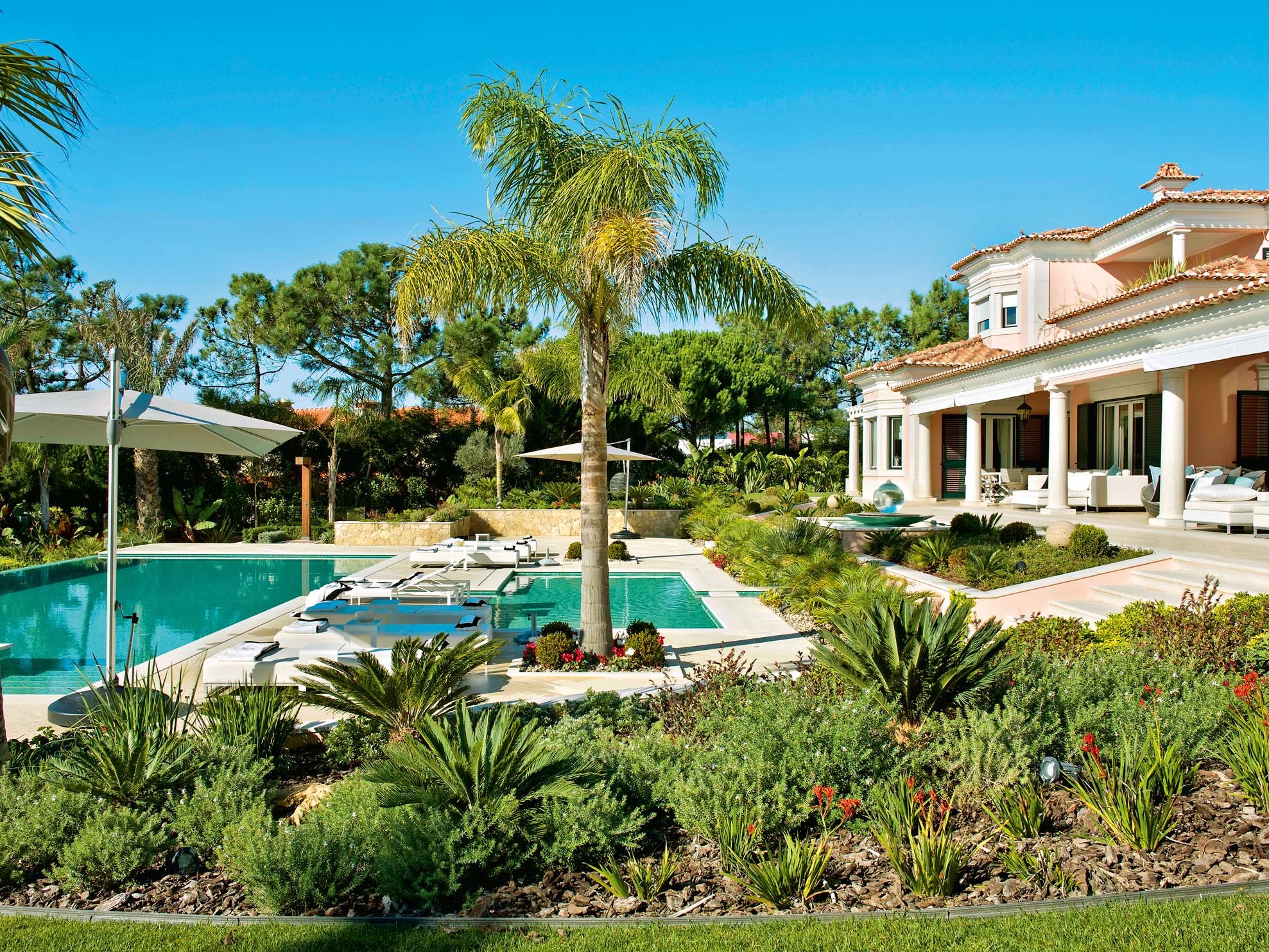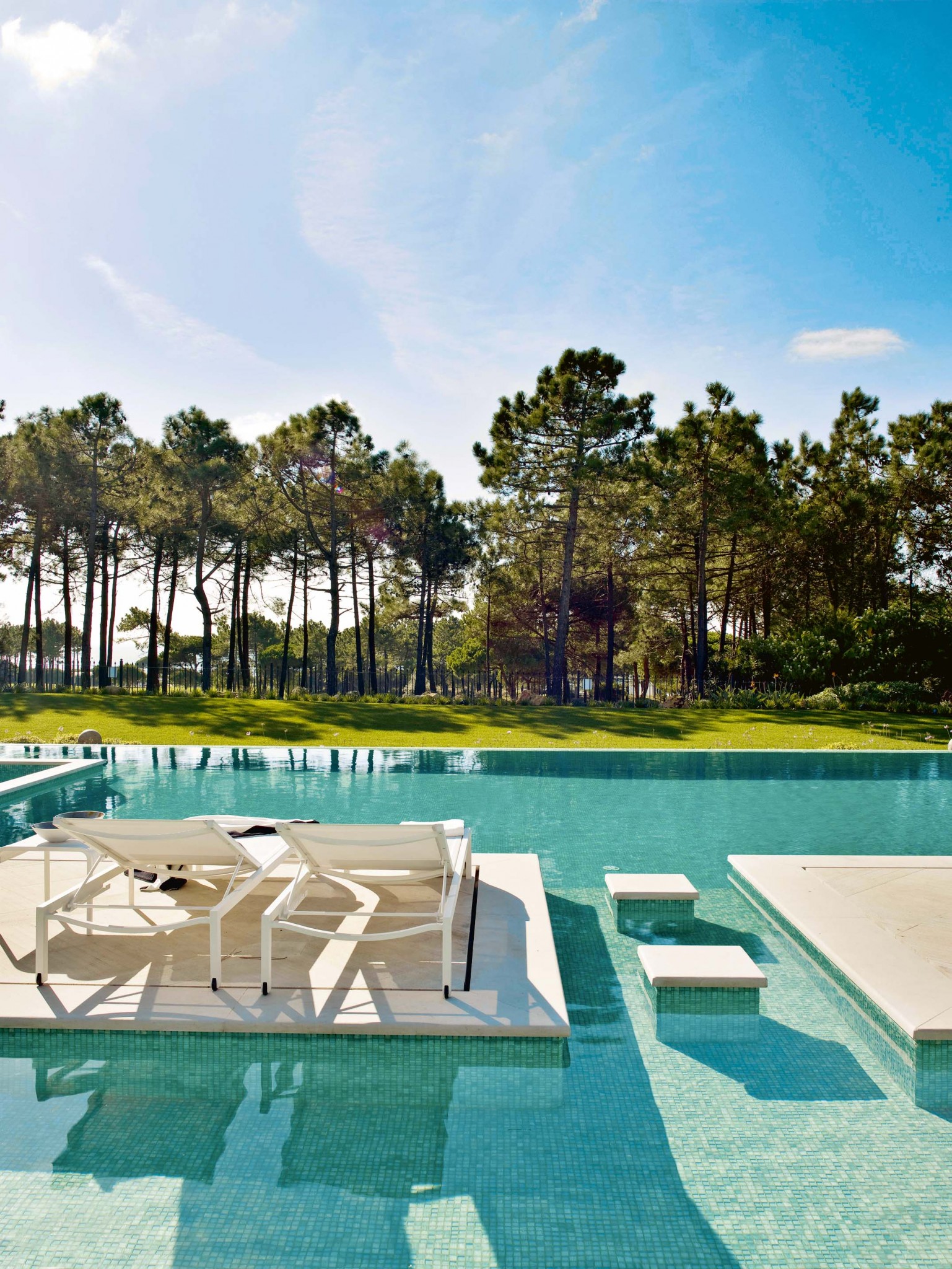 Бассейн под открытым небом, конечно, больше подходит для регионов и стран с тёплым климатом, в средних широтах им можно пользоваться только в летнее время. Но в любом случае такие бассейны проектируются как часть цельного архитектурного облика загородного дома, и в те периоды, когда их не получается использовать, даже с учётом систем подогрева воды, они служат украшением экстерьера