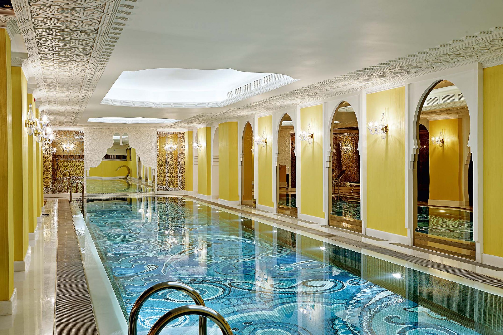 Для заказчика, человека светского, любителя путешествий и специалиста в области современного искусства, был создан эклектичный интерьер, замешанный на разных культурах: русской, арабской и европейской. Расположенная в цокольном этаже спа–зона выдержана в арабских традициях и напоминает современные люксовые отели Дубая. Здесь присутствуют традиционные стрельчатые и сводчатые элементы, мозаики, майоликовые панно, лепные детали потолка и ниш. Общая золотая палитра помещения дополнена ультрамариновыми и бирюзовыми деталями. В отделке помимо мозаики, плитки и мрамора использованы оникс и зеркала».