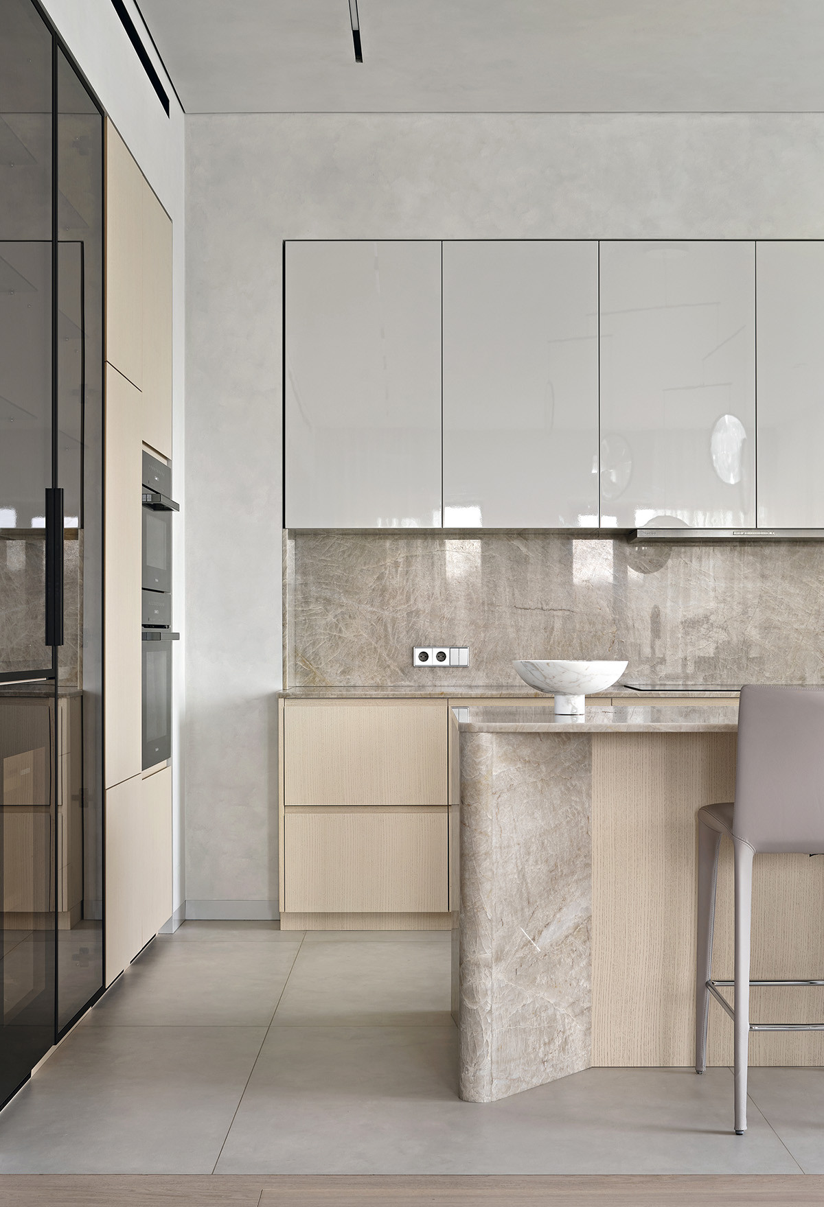 У интерьера интересная предыстория: заказчики попросили архитекторов создать здесь идеальное пространство для коллекции произведении искусства. Так в интерьере появились светло-серый, как в галерее, оттенок стен и потолка, скульптурные формы дизайнерской мебели со скругленными углами, эффектная подсветка. И всё вместе это участвует в создании атмосферы тишины и гармонии, где искусство выходит на первый план. Но эстетика не отменяла задач функционального зонирования, поэтому авторы проекта разделили пространство на зоны кухни-гостиной, главной спальни с гардеробной и ванной комнатой, детской, кабинета, входную и постирочную. Преимущества квартиры — панорамный вид на город и большая лоджия рядом с гостиной. На лоджии решили создать зимний сад, и теперь природа словно стирает границы между интерьером и городом, а открытое, перетекающее пространство кухни-гостиной кажется еще просторнее.