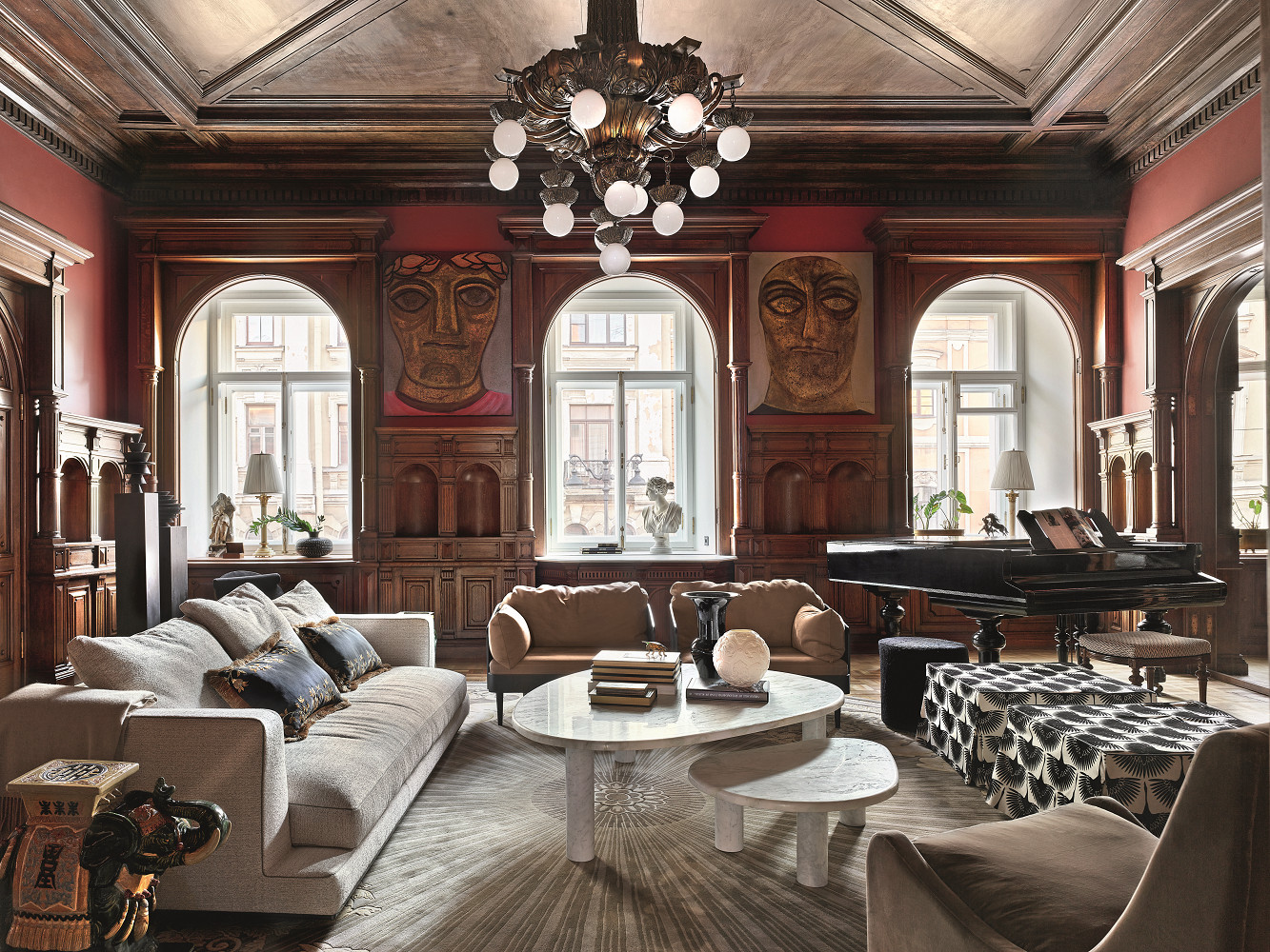 Например, стены в гостиной обшиты дубовыми панелями, выполненными еще в 1880‑х годах в знаменитой столярной мастерской А. Вунша, а потолок расписан «под дуб» вручную. Эти исторические артефакты соседствуют с лаконичной мебелью и современным искусством — живописью Глеба Богомолова, скульптурами Златы Корниловой. В столовой взгляд сразу привлекают витражи в готическом стиле с геральдическими символами, созданные в 1884 году в легендарной мастерской «Эрленбах и Ко». «Если верить научным источникам, витражи были в нескольких комнатах в виде внутренних ставен с подсветкой, но до наших дней они сохранились