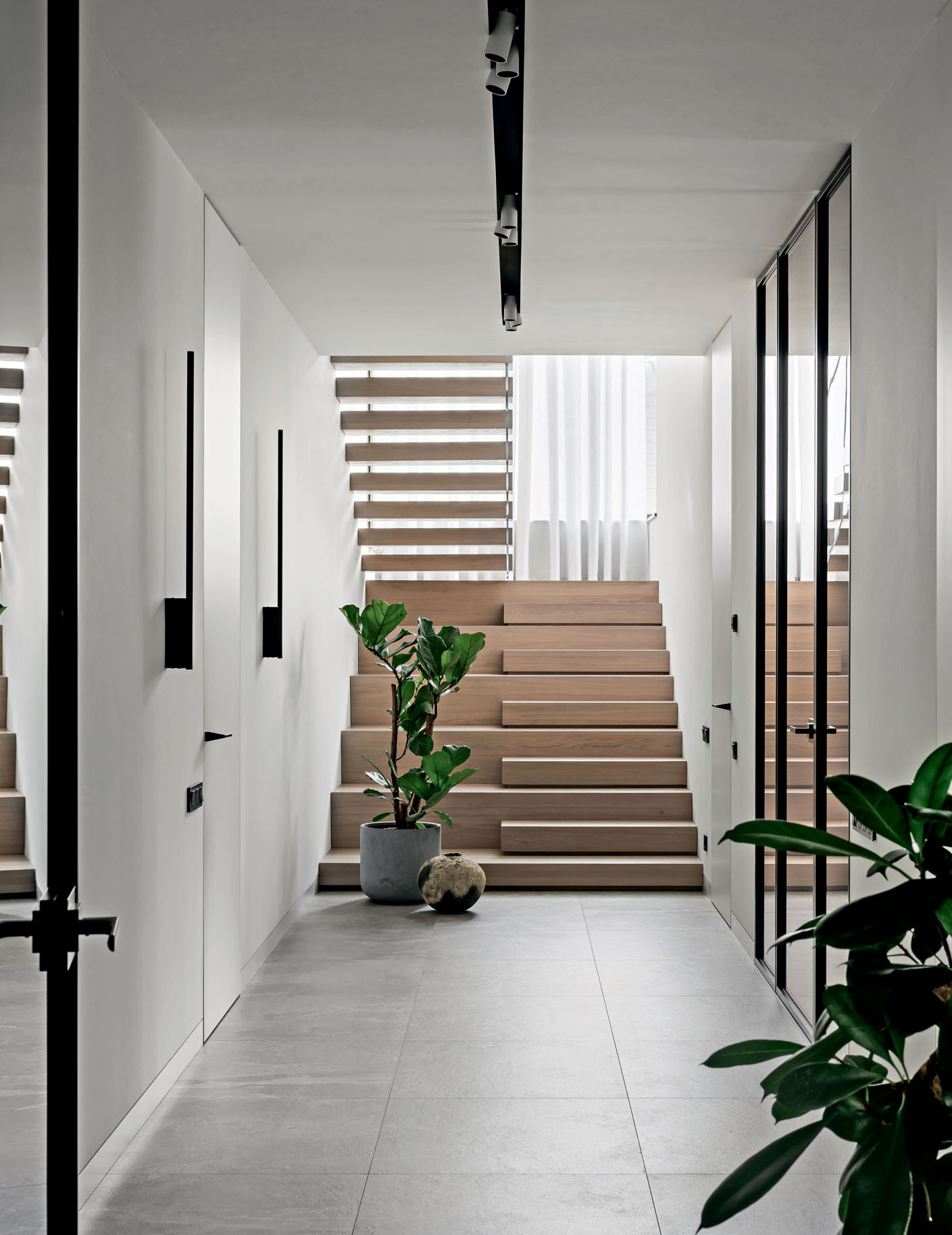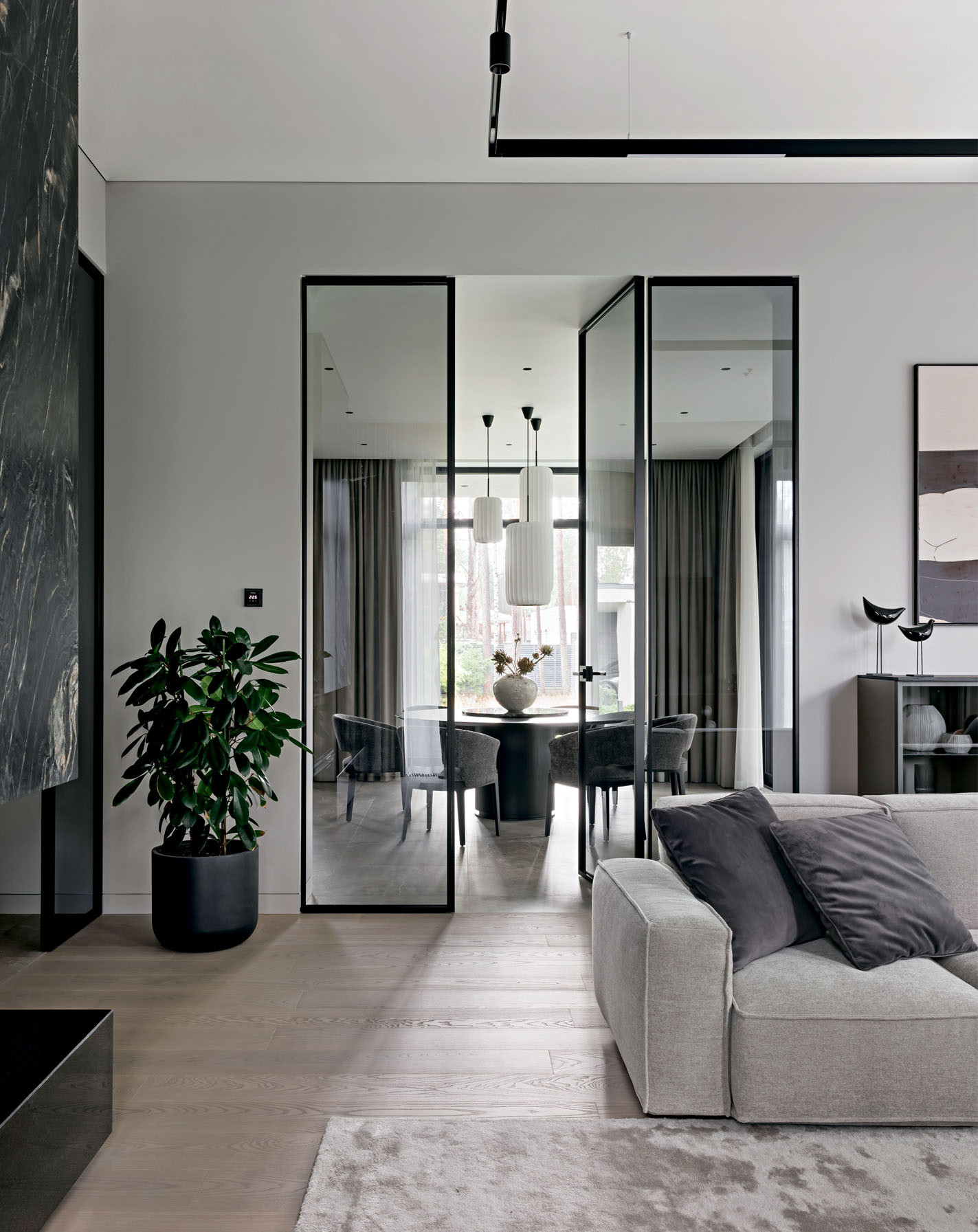 Дом состоит из нескольких основных архитектурных объемов, которые подчеркнуты при помощи разных материалов: черного кирпича, фасадной штукатурки оттенка серого питерского неба и брутальной коричнево-рыжей кортеновской стали в цвет стволов сосен. Отделки фасада перекликаются с окружающим ландшафтом и с интерьером. Так, основной объем стен также решен в светло-сером оттенке, а акценты расставлены при помощи мебели: она черная, из матового дерева. Например, одна часть фасадов кухни выполнена из темного обожженного дерева, а другая — с цементным текстурированным декором. Покрытие — натуральное, на фасады нанесено вручную. «Выбирая кухонный гарнитур, я учитывала сочетание качества, функциональности и дизайна, — объясняет архитектор, — и подходящую по всем характеристикам кухню нашла у NOLTE KÜCHEN. Кроме того, у этой фабрики богатые, интересные фактуры дерева и бетона, добавляющие глубины интерьеру». А еще Юлии нравится, что она реализовала в собственном доме один из самых своих любимых приемов: консоль как тип конструкции. Над террасой — большой, в три метра, консольный свес кровли, а в интерьере — лестница с консольными ступенями, визуально очень легкая. Эту лестницу создали на заказ по чертежам Юлии на столярном производстве «СЕНДЕГА». На вопрос, почему же в таком случае архитектор не стала сама проектировать и мебель для собственного дома, она отвечает, что проектировать надо, когда нужно то, чего пока не существует: «Мне же хотелось выбрать из того, что уже придумали дизайнеры: красивый стол, красивый диван. И в этом мне очень помогли наши петербургские салоны: POLLINI CASA — поставщик европейской мебели и сантехники, ALF ITALIA HOME — салон-представитель итальянского бренда ALF DAFRE». Но главный центр притяжения в интерьере — камин в отделке слэбом бразильского мрамора (камин изготовила на заказ компания «МАГИЯ КАМИНА»). Юлия так продумала конструкцию, что кажется, будто огромный тяжелый слэб парит в воздухе, и это завораживает. «Можно придумать что-то красивое, но обязательно нужно объяснить это решение с точки зрения функции, — объясняет она. —Такого подхода я придерживаюсь и в своей рабочей практике».