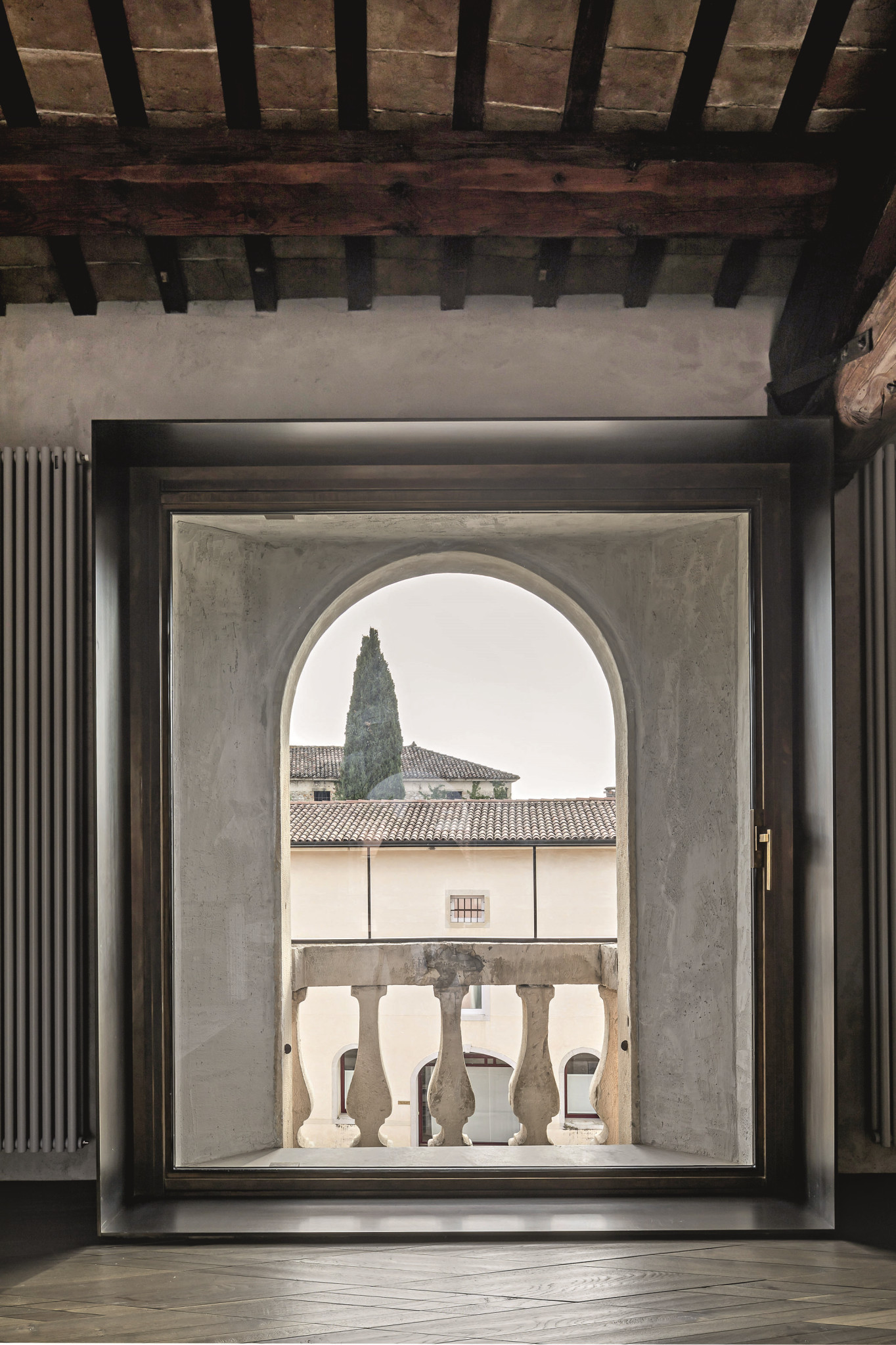 Резиденция находится в бывшем зернохранилище, затерянном среди холмов Тревизо, вокруг реки Солиго. Это самый север Италии, известный, например, своим просекко. Владельцы лофта, однако, не виноделы, а cоздатели мебели и предметов интерьера. Квартира принадлежит Паоло Тормена и Изабелле Дженовезе, возглавляющим известный нишевый бренд Henge. Профиль фабрики — крафтовая мебель ранга современных артефактов. И квартира Паоло и Изабеллы служит своего рода иллюстрацией к портфолио марки. Они собрали здесь все лучшее, чем гордятся, и в окружении чего им самим хотелось бы жить. Вещи Henge, будь то мебель, светильники или даже кухни, — это всегда уникаты, штучные произведения крафтового искусства, с акцентом на редких и необычных материалах и их сочетаниях. В оформлении этой квартиры, например, использован мореный дуб и реликтовая древесина с включениями древних организмов. В сочетании с винтажной бронзой, окисленным железом и дубленой кожей (на фабрике используют только растительные составы). Тут есть и редкие, фактурные сорта мрамора. Кстати, древесина — даже если это, скажем, привычный дуб — также подвергается бережной и самой тщательной подготовке: прежде чем начать с ней работать, ее долго просушивают при низких температурах. Предметы интерьера, созданные с помощью таких материалов, прекрасно вписываются в вековой интерьер. Прошлое, органично сосуществующее с настоящим, — так сами хозяева определяют стиль и дух этого проекта. Само здание относится к семнадцатому столетию. Изначально его использовали как зернохранилище, потом как контору предприятия. Паоло и Изабелла используют как жилое помещение верхний, мансардный этаж.