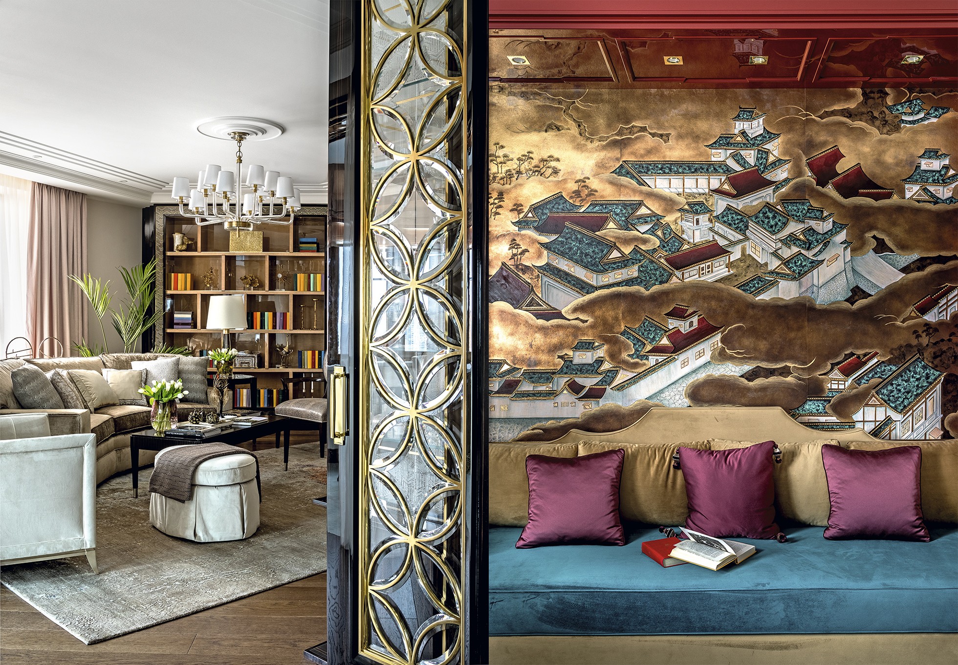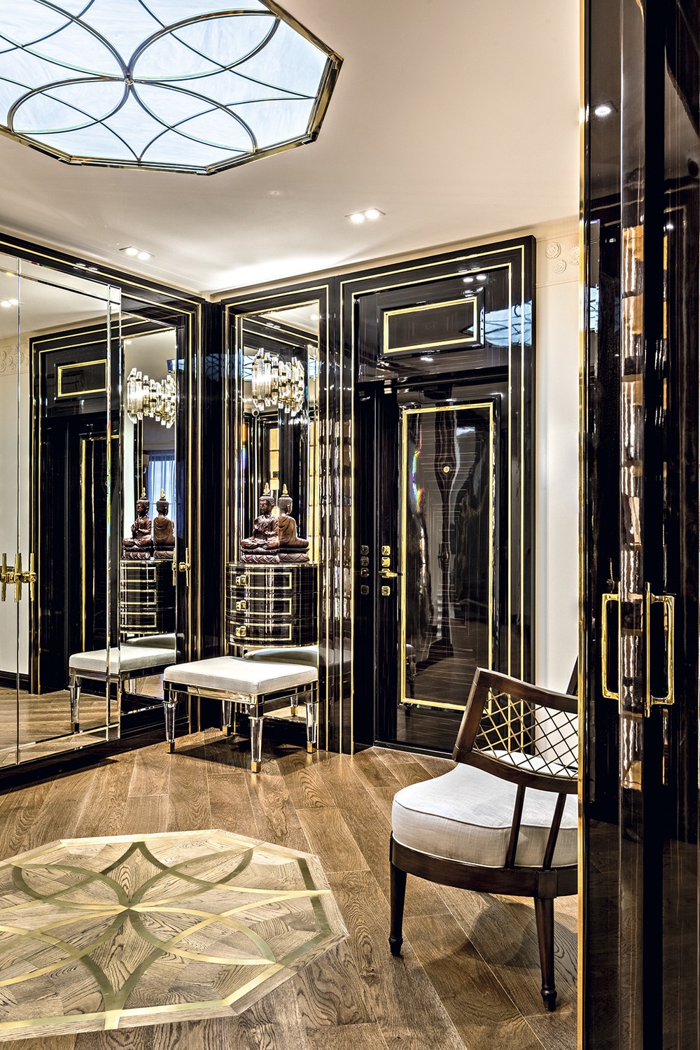 Автор проекта Екатерина Лебедева: «Мои заказчики, обладающие утончённым вкусом, пожелали создать интерьер без оглядки на модные тенденции. Передо мной стояла задача спроектировать «родовое гнездо», интерьер, сочетающий дворцовую роскошь и современные интеллектуальные технологии. Меня вдохновил образ резной китайской шкатулки, а ключом к решению интерьера стал стиль ар–деко, в котором шик и роскошь азиатской культуры переплетаются с элементами неоклассики и функционализма»