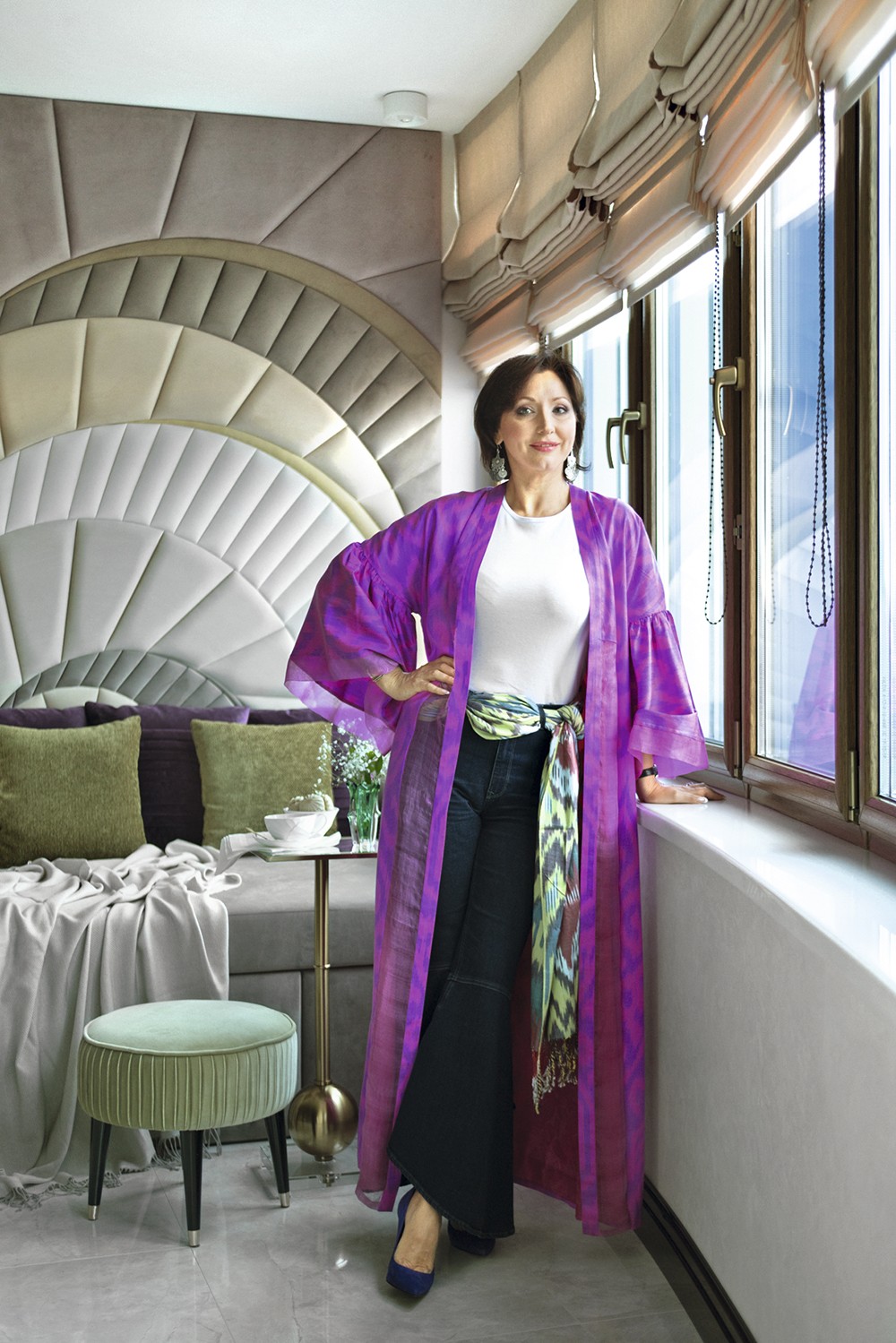 Одно из них — библиотека в гостиной, которая представляет собой неправильный пятиугольник. «Ядро гостиной — книжный шкаф, вокруг которого разворачивается интерьер, — рассказывает Екатерина Лебедева. — Я спроектировала его боковые стороны в виде пирамиды: она ступенями спускается к стенам. Это позволило визуально связать объём шкафа с пространством гостиной». Шкаф из шпона макасара и сикомора и с отделкой латунью перекликается по стилю с ТВ–зоной, межкомнатными дверями, потолочным витражом и корпусной мебелью в прихожей. Всё это и многое другое, включая витрины в гостиной и корпусную мебель в спальне, сделано по чертежам Екатерины Лебедевой на российском производстве «СОФИЯ ДЕКОР». «Это в буквальном смысле ювелирная работа, — говорит дизайнер. — Так, в межкомнатных дверях стекло с радиусным фацетом вставлено в раму из латуни, а фацет двойной, то есть срезана кромка с каждой стороны». На солнце фацетированные стёкла сверкают, как бриллианты. Геометрический узор латунной рамы символизирует экзотический цветок. Аналогичный узор также встречается в потолочном витраже прихожей и в рисунке пола. Витраж сделан из литого, проработанного вручную стекла с мотивами в духе знаменитой ширмы Эдгара Брандта — с цветами пассифлоры и розами. Эти же мотивы в декоре встроенных шкафов. Технологически непросто было установить огромные полотнища литого узорного стекла в рамы из латуни, но мастера с этим справились. Столь же непростой путь прошли витрины в гостиной — из стекла, декорированного в технике пике, и латуни. Макасар, сикомор, оникс, литое обработанное вручную стекло — дорогие материалы абсолютно отвечают стилю респектабельного шика, в котором оформлена квартира. Завершающим штрихом служит текстиль пудровых оттенков и тактильно приятных благородных текстур. Это целый ряд люксовых брендов: FABRICUT, JAMES HARE, HOULÈS, CHRISTIAN FISCHBACHER, JAB, NYA NORDISKA.