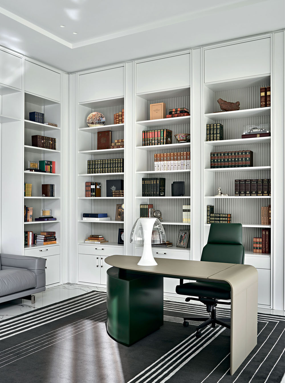 Кабинет — уютное пространство для работы и отдыха. Строгая геометрия библиотеки «собирает» его воедино, ей вторит рисунок ковра KULTURAKOVROV. Библиотека, компания «Гарант 100». Рабочий стол SIENA (дизайн Ludovica + Roberto Palomba), диван (дизайн Daniele Lo Scalzo Moscheri), рабочее кресло (дизайн Umberto Asnago), всё — фабрика i4 MARIANI