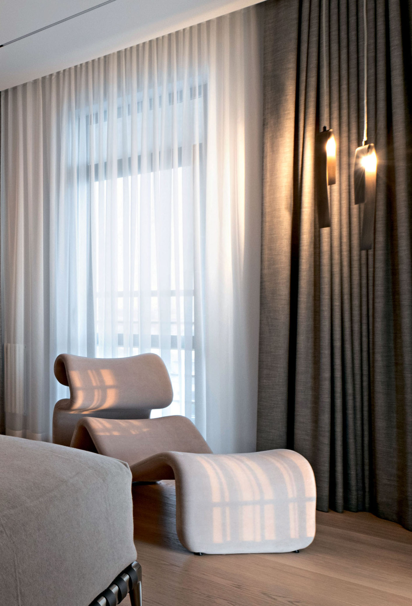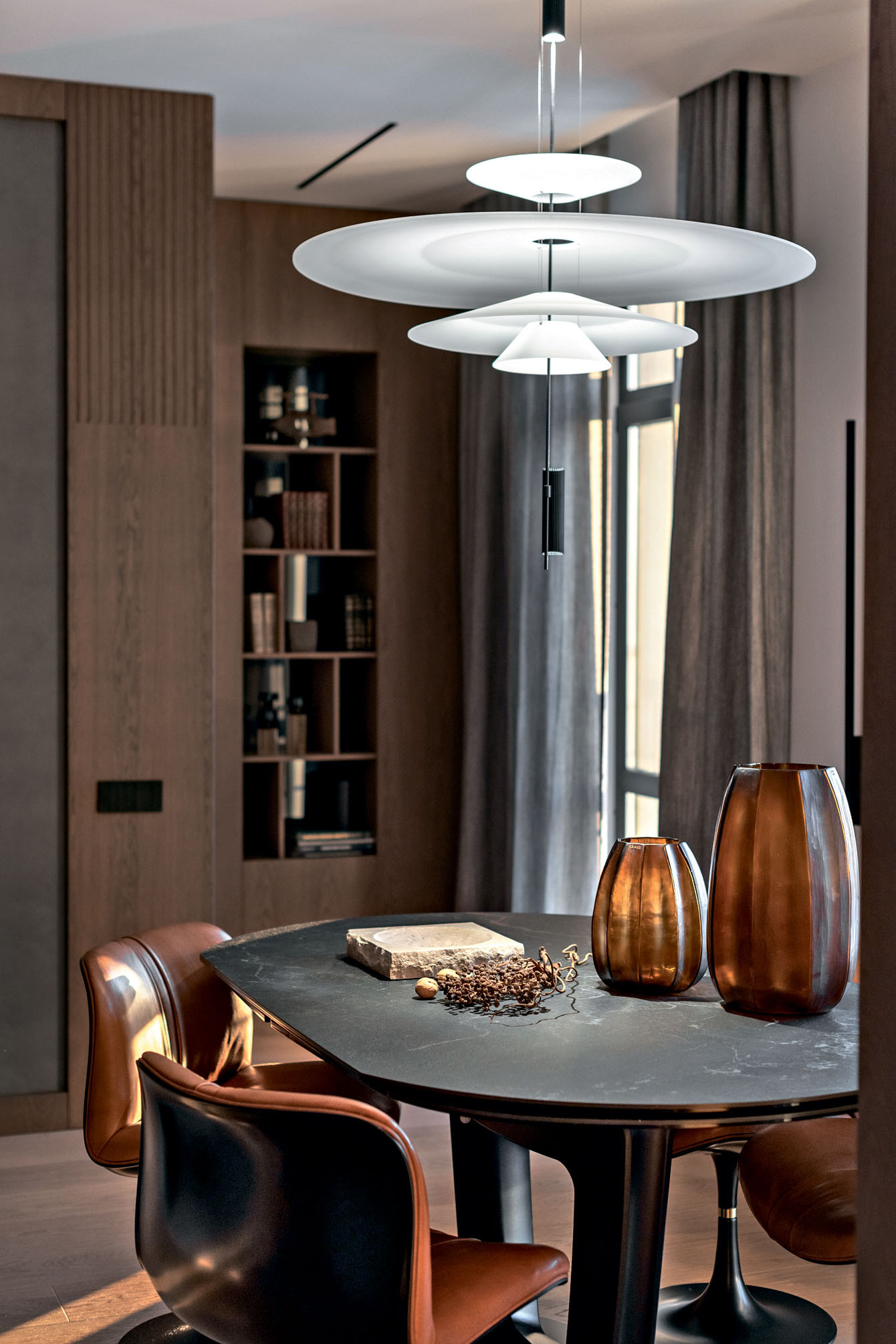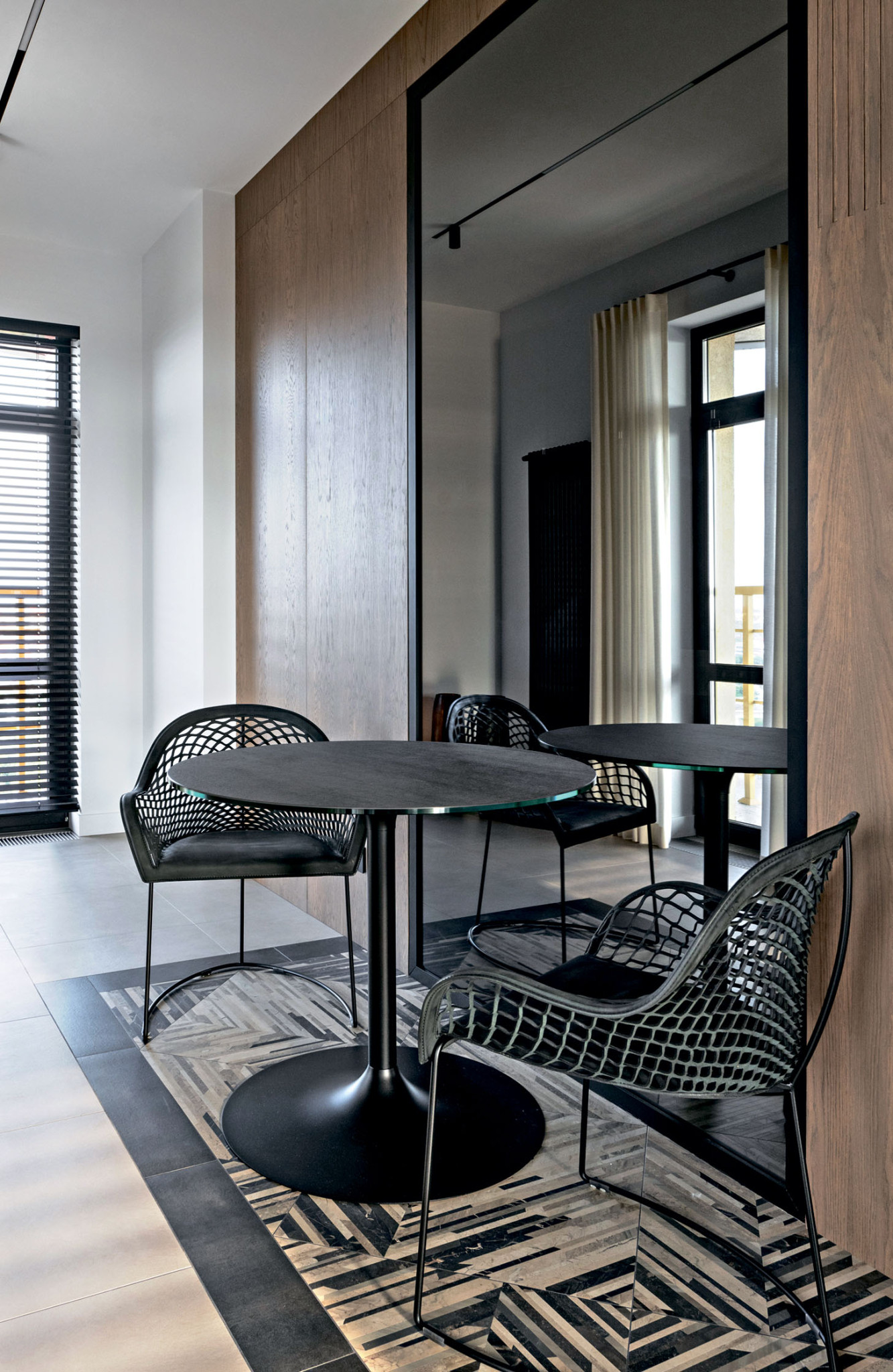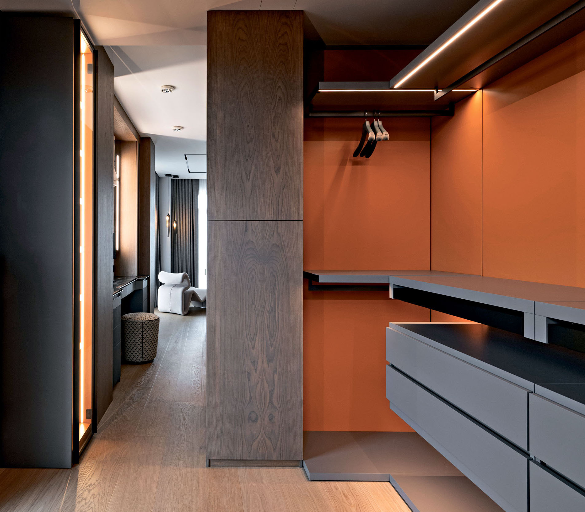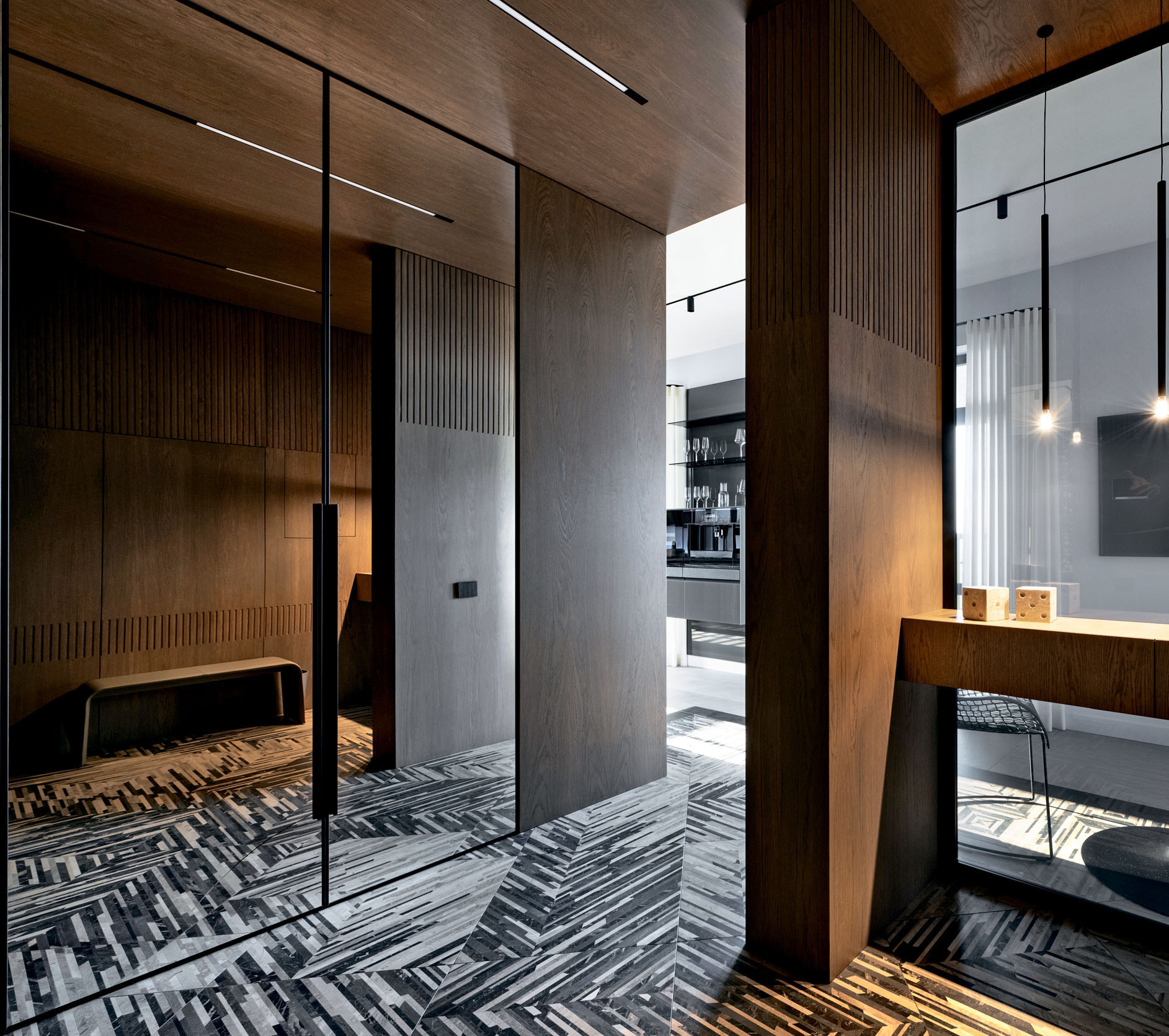 Е. Б.: Мы всегда отдаем предпочтение натуральным материалам. Системы хранения в прихожей, а также гардероб, зеркала и двери мы интегрировали в шпонированные дубом панели, которыми отделаны стены и потолок. Даже текстиль здесь подобран из натуральных материалов: на кухне использовали пластичные шторы из шерсти и вискозы от Espocada, а в гостиной и спальне — от бренда Galleria Arben.