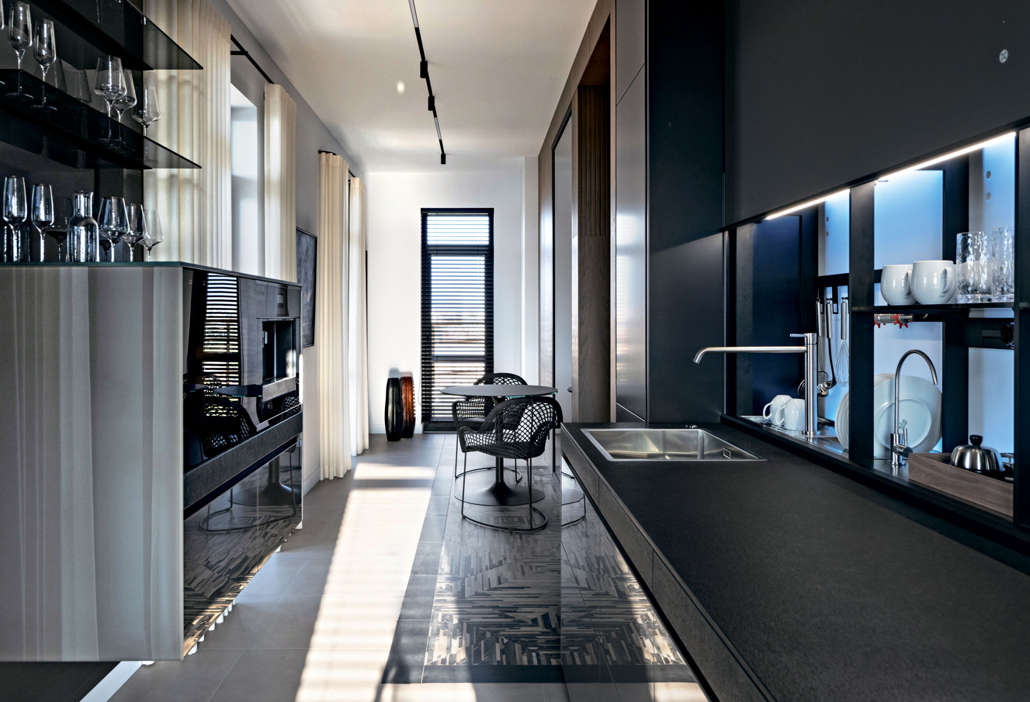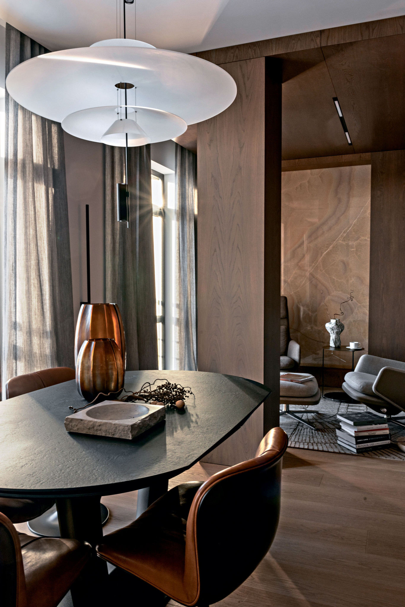 Е. Б.: Зонирование гостиной определило расположение несущих конструкций. Пространство состоит из трех частей: места для отдыха и релакса с диваном Mascheroni, столовой и зоной тет-а-тет с креслами Vitra от дизайнера Антонио Читтерио. Стены и потолок этой камерной зоны мы обшили деревянным панелями. Такой прием помог скрыть решетки для вентиляции, кондиционирования и увлажнения воздуха, которые занимают немало места. Лишь на одной из стен мы разместили панно из оникса бежевого цвета с подсветкой. Для вытянутого и узкого помещения кухни мы выбрали модель Air Logica от Valcucine. Философия Габриэля Чентацо, автора этой кухни для мегаполиса, нам очень близка.