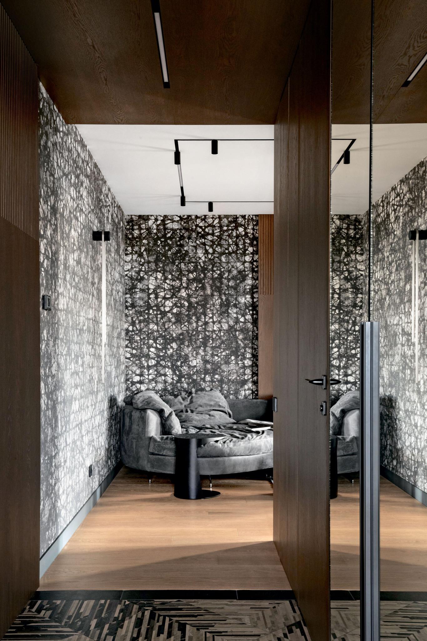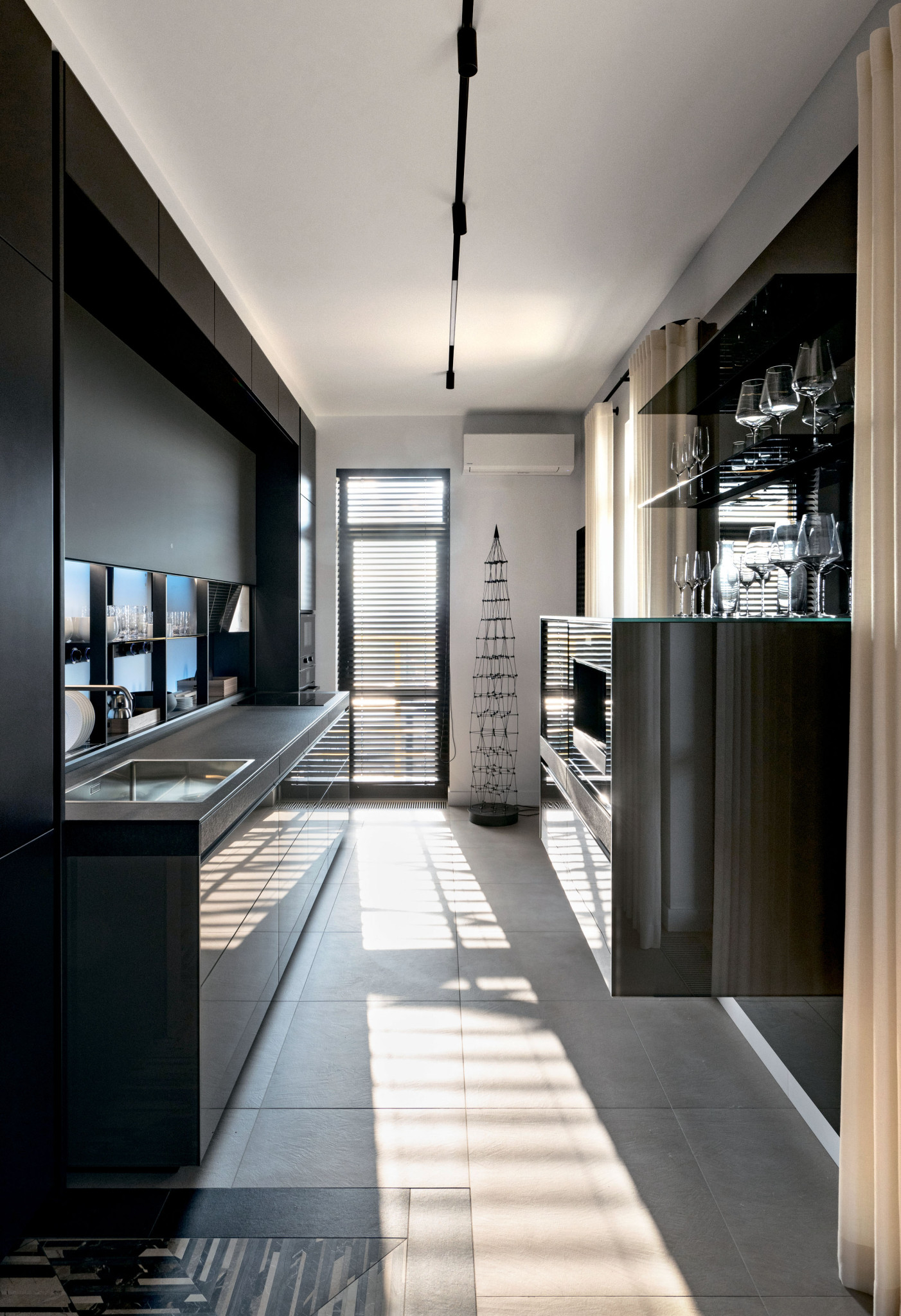 Е. Б.: В квартире смонтировано сложное и современное климатическое оборудование и электрокарнизы, которыми с легкостью можно управлять через мобильное приложение либо голосом через колонки «Алисы». Для основного освещения мы использовали трековую световую систему Infinity Air с возможностью размещения светильников внутри одной из линий интегрированных вентиляционных каналов. Воздух от систем приточно-вытяжной вентиляции, кондиционирования и увлажнения поступает в помещение благодаря специальным дефлекторам.