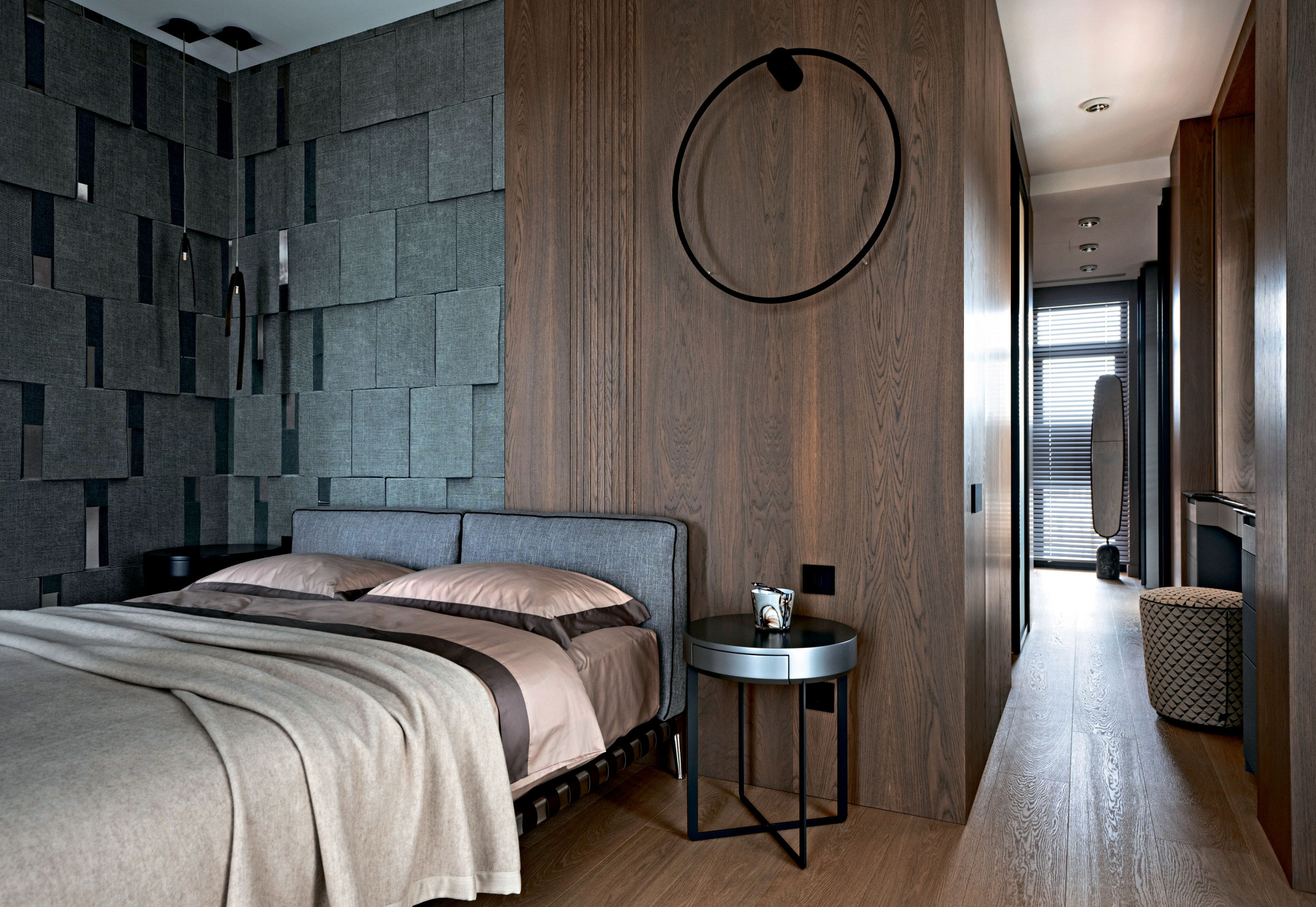 Е. Б.: Зона спальни, ванной и гардеробной скрыта от посторонних глаз за дверью, встроенной в настенные деревянные панели. Здесь нам не хотелось делать лишних дверей, поэтому помещения плавно перетекают из одного в другое. Кровать Flexform с мягким низким изголовьем буквально парит на тонких металлических ножках. В проходе из спальни в гардеробную вдоль окна разместился туалетный столик с мраморной столешницей, выполненный по чертежам нашей дизайн-студии. Ванная комната находится напротив окна за стеклянной перегородкой, благодаря чему в помещение проникают первые утренние лучи солнца.