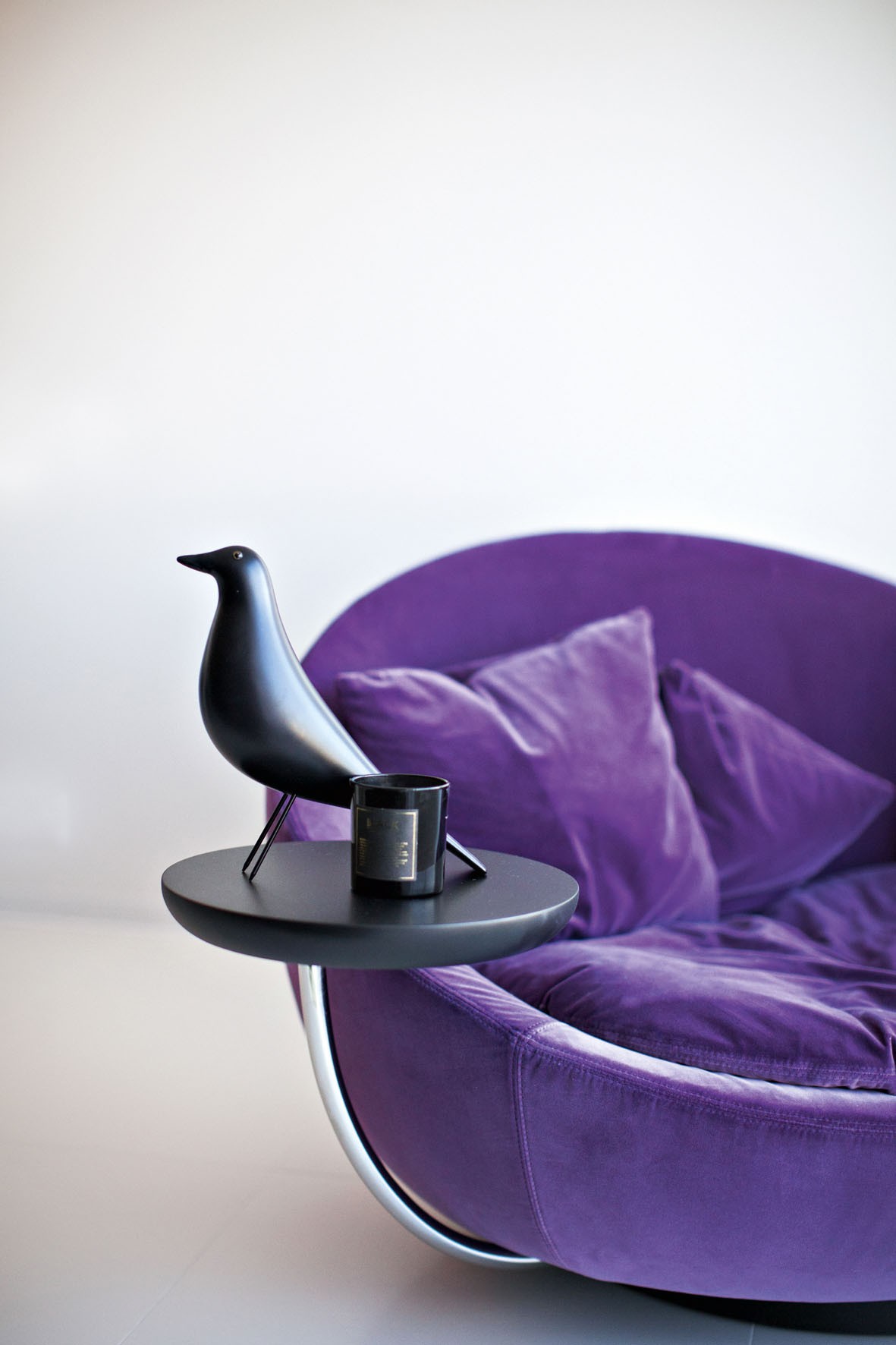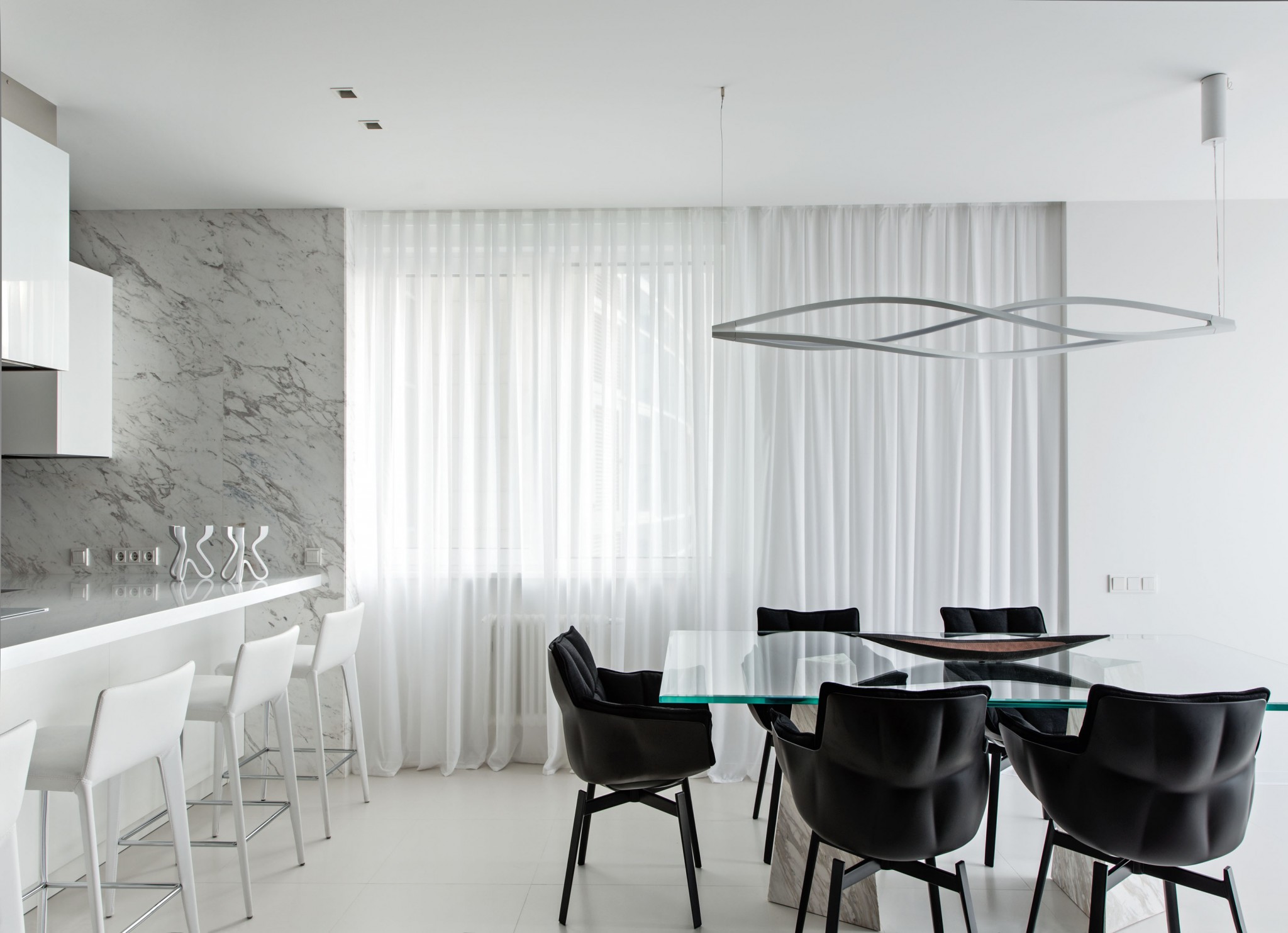 Основной цвет гостиной — белый, на нём хорошо «читаются» правильно расставленные акценты, как, например, чёрный диван или сиреневое кресло Désirée — яркие пятна в монохромном пространствеЗона кухни. Архитекторы долго искали идеальный камень для кухонного фартука и остановились в итоге на бело–сером мраморе Volakas, однако делать из него столешницу рабочей поверхности не стали. «Дизайнеры любят этот приём, — замечает Элен, — но мы выступаем не только за эстетику, но и за практичность. Проведя множество экспериментов с мрамором, химическими обработками и агрессивными продуктами типа кофе и вина, мы пришли к выводу, что столешница из светлого мрамора может быть только на кухне, на которой никто не готовит! Поэтому взяли искусственный камень, совпадающий по оттенку с основным цветом мрамора». Навесные шкафы на ломаной конструкции изготовлены по эскизам авторов проекта. Кухня, Cesar. Барные стулья, Bonaldo