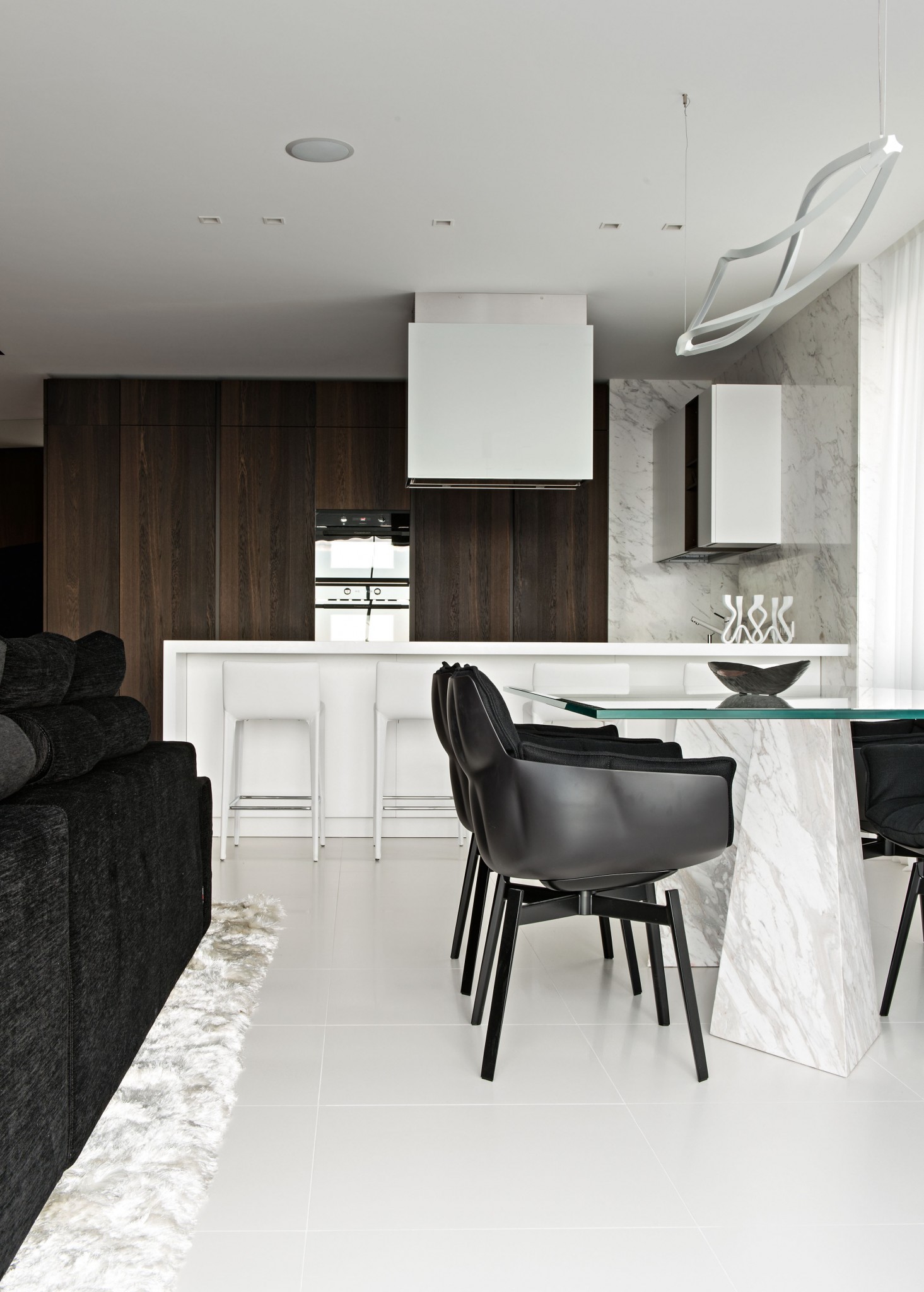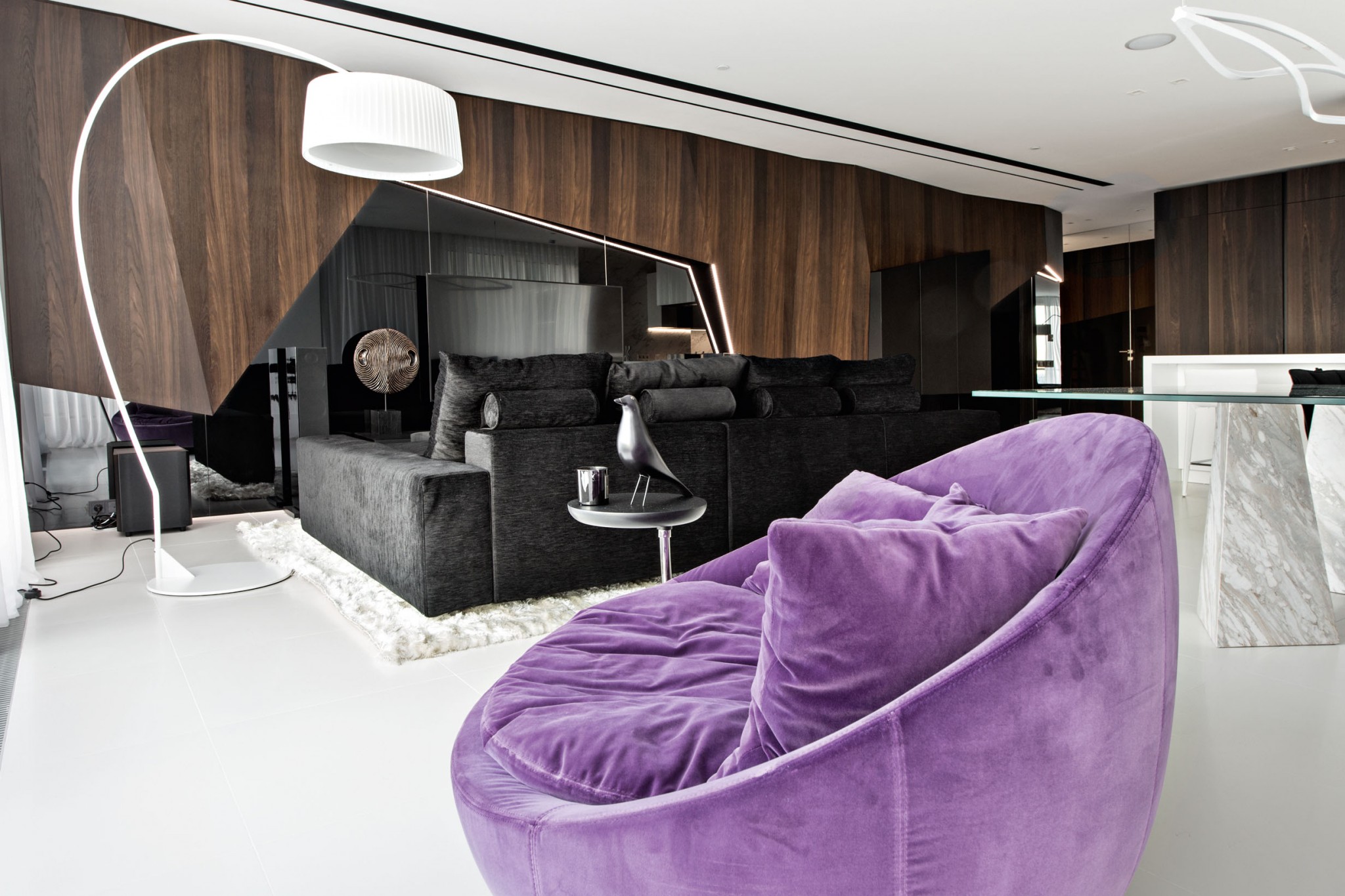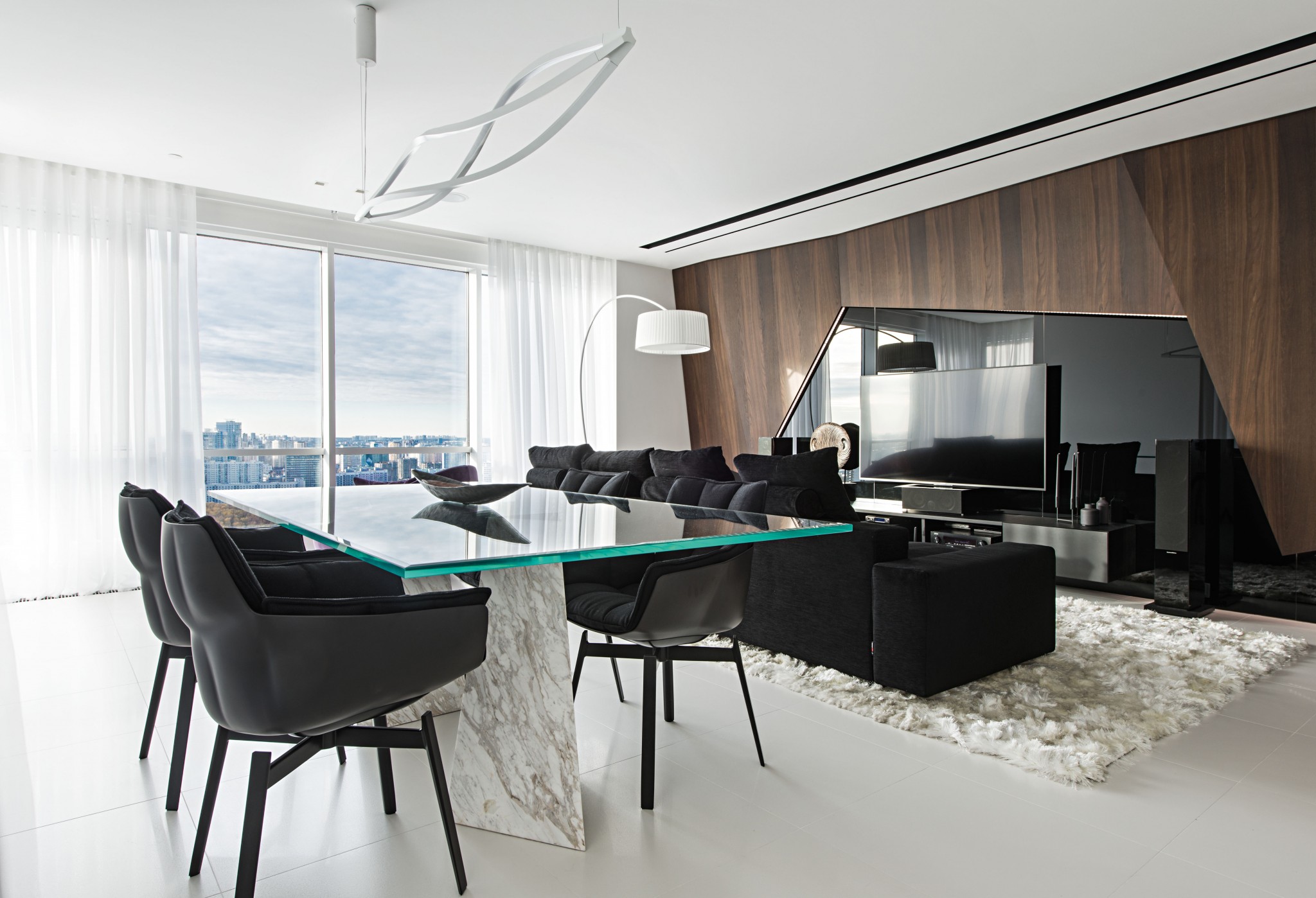 Центр композиции гостиной — конструкция из ломаных деревянных панелей, стыкующихся под разными углами, и декоративной вставки из чёрного стекла со встроенной подсветкой, которая эффектно подчёркивает её сложную геометрию. Обеденный стол со стеклянной столешницей и ножками, отделанными мрамором, выполнен по эскизам архитекторов. Обеденные стулья, B&B Italia. Диван, Désirée