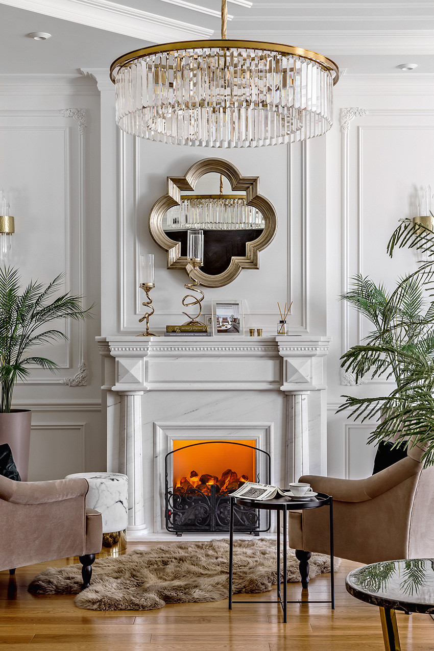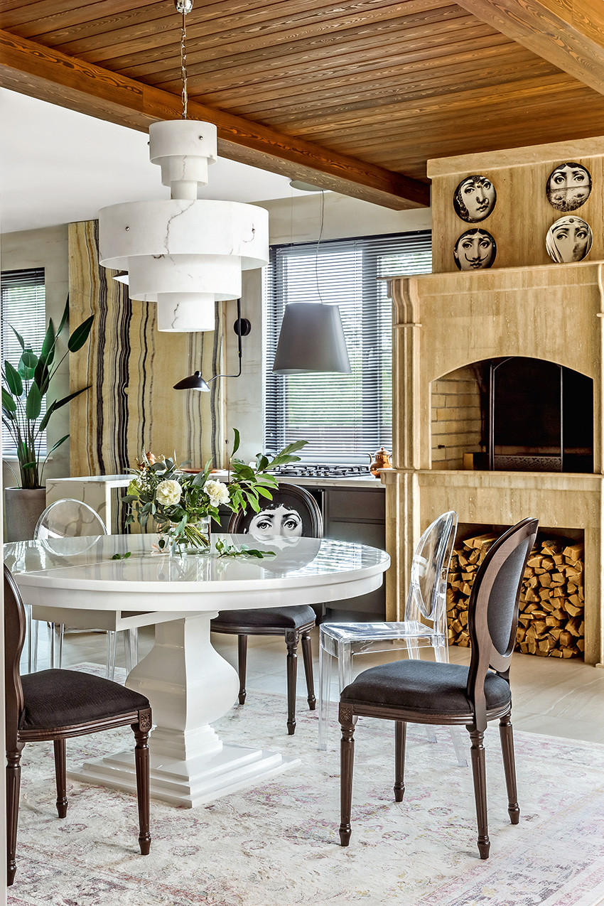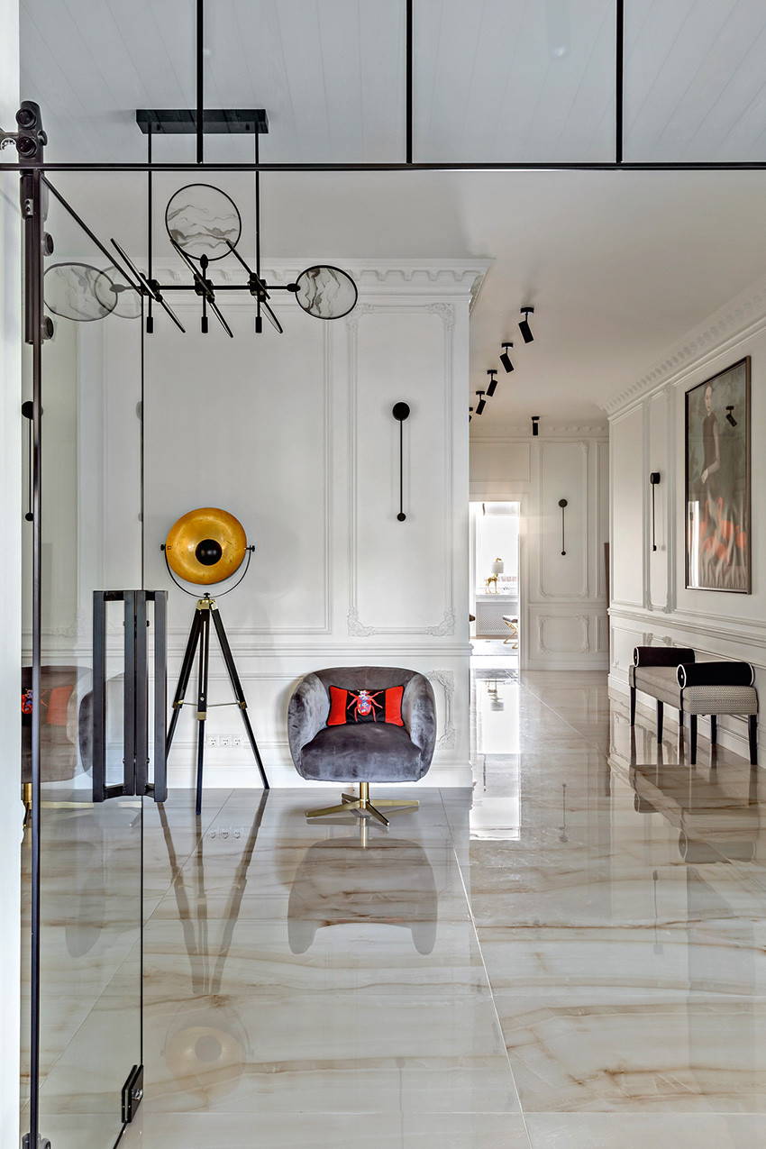 Заказчики — молодая пара с двумя детьми (мальчиком двух лет и девочкой двенадцати лет) — любят всё нестандартное, креативное, оригинальное и дали Ирине полную свободу действий, что позволило ей реализовать интересные дизайнерские идеи. Тема концепции — уникальная и неповторимая атмосфера, интерьер вне времени с яркими и самобытными деталями и современной живописью в духе поп–арта. «Мы собрали некий микс, смешали новое и старое, где явно чувствуются отсылки к ар–деко, — продолжает Ирина. — Этот стиль эклектичен сам по себе и представляет собой гармоничное и при этом броское сочетание модерна и неоклассицизма. Добавили яркие крупноформатные репродукции под стеклом в деревянных рамах с лаковой финишной отделкой. Озорные, немного хулиганские сюжеты на тему классической живописи придают пространству особый шарм, делают его более ироничным, живым». Замиксовали и материалы — в интерьере много как матовых, так и лаковых, глянцевых поверхностей. Игра фактур натурального камня, дерева, кожи, меха, различных оттенков металла смотрится выигрышно и всегда роскошно. В цветовой гамме использовали белые, светло–серые и нюдовые оттенки — они отлично гармонируют между собой и с базовыми тонами стен. Немаловажную роль в интерьере играет освещение — в каждом помещении есть возможность менять световой сценарий сообразно настроению. Торшеры, бра, люстры, встроенные потолочные светильники акцентируют каждый свою зону на потолке или стенах, создают удивительно тёплую, уютную атмосферу в доме.