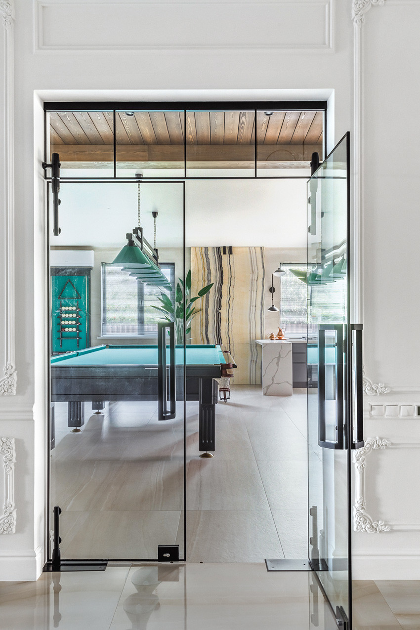 Когда к Ирине Скоробогатовой попал объект, полным ходом шла работа по реорганизации объёма. К дому площадью 250 квадратных метров хозяева пристраивали ряд новых помещений: бассейн, хаммам, террасу, детские комнаты, три санузла, гардеробные и технические помещения. Поэтому первое, что нужно было сделать дизайнеру, — грамотно «собрать» пространство, продумать логистику, функционал и интегрировать вновь возводимые комнаты в исходную планировку. «Это была сложная и вместе с тем интересная задача, — поясняет Ирина. — Столовую мы совместили с террасой, барбекю, спа–зоной и бильярдной, она стала центром притяжения семьи, превратилась в многофункциональное пространство для отдыха и развлечений. Для детей сформировали отдельный блок со спальнями, игровой, гардеробной, ванной и санузлом. Главную гостиную объединили с каминной группой и местом для игры в шахматы, а кухню отделили высоким порталом, украшенным лепным декором и зеркалами, которые визуально стирают границы между помещениями. Обычный дом изменился до неузнаваемости: мало того что площадь увеличилась почти в два с половиной раза, он теперь соответствует самым высоким современным стандартам».
