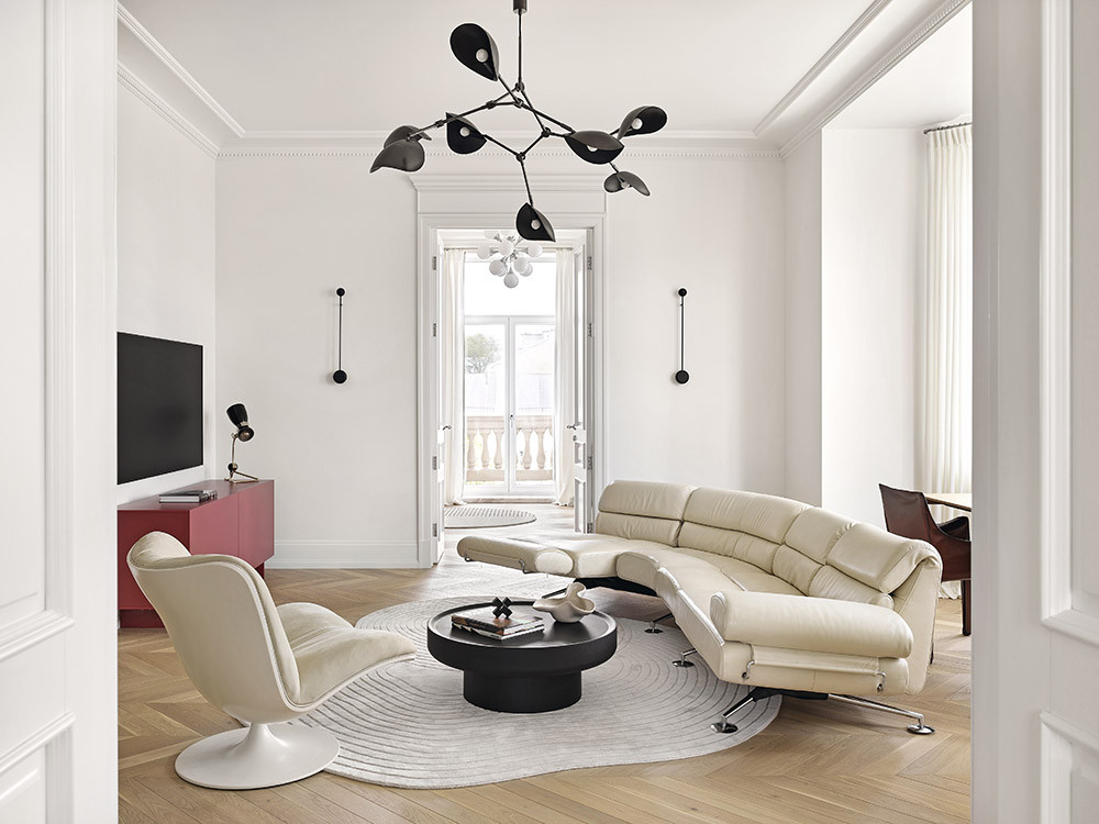 Окна квартиры выходят на три стороны света, и владельцам хотелось максимально сохранить пронизанный светом объем, его сияние и прозрачность, поэтому все комнаты оформлены в светлых тонах, а большие распашные двери позволяют дневному свету беспрепятственно перетекать из одного помещения в другое. «В данном случае, как и в других своих проектах, я отталкивалась от архитектуры, но в выборе мебели и освещения предпочитаю смешивать времена, стили и страны. Получившийся интерьер выглядит достаточно современно, хотя и расположился внутри классического обрамления, обусловленного временем постройки дома», — отмечает дизайнер.