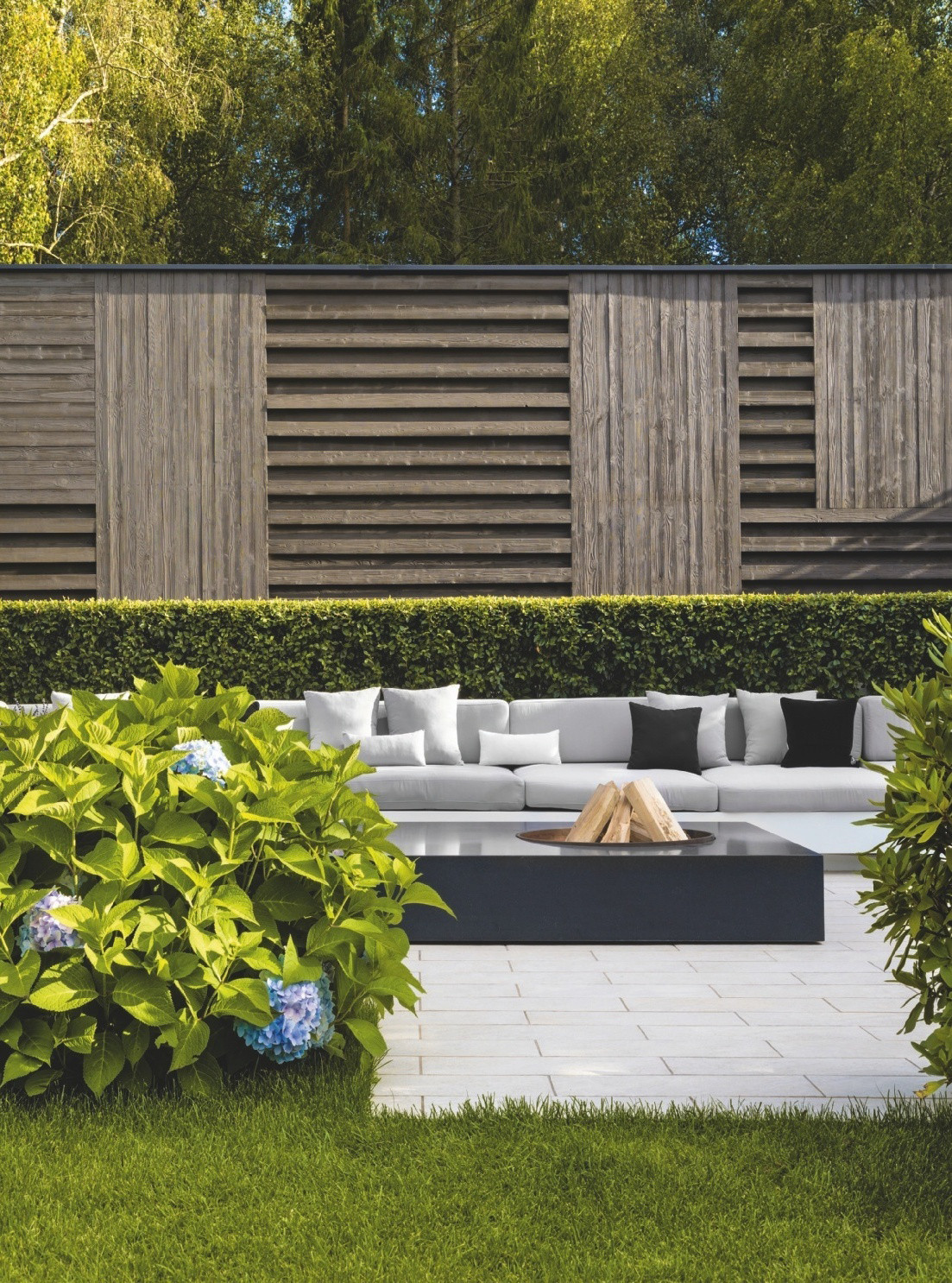 Сам участок состоит из нескольких зон отдыха. Неслучайно авторы проекта называет его проектом формата lounge garden («сад–лаундж»). Какие-то зоны можно использовать для семейных развлечений, где-то собраться с друзьями или устроить вечеринку. А есть и «деловая» часть, которую хозяин дома использует для переговоров в неформальной обстановке. Перед домом разбита своего рода welcome–зона с рододендронами (так как они цветут уже в мае!), «частоколом» сосен, служащих фоном всей композиции, и стрижеными кустарниками, обрамляющими клумбы