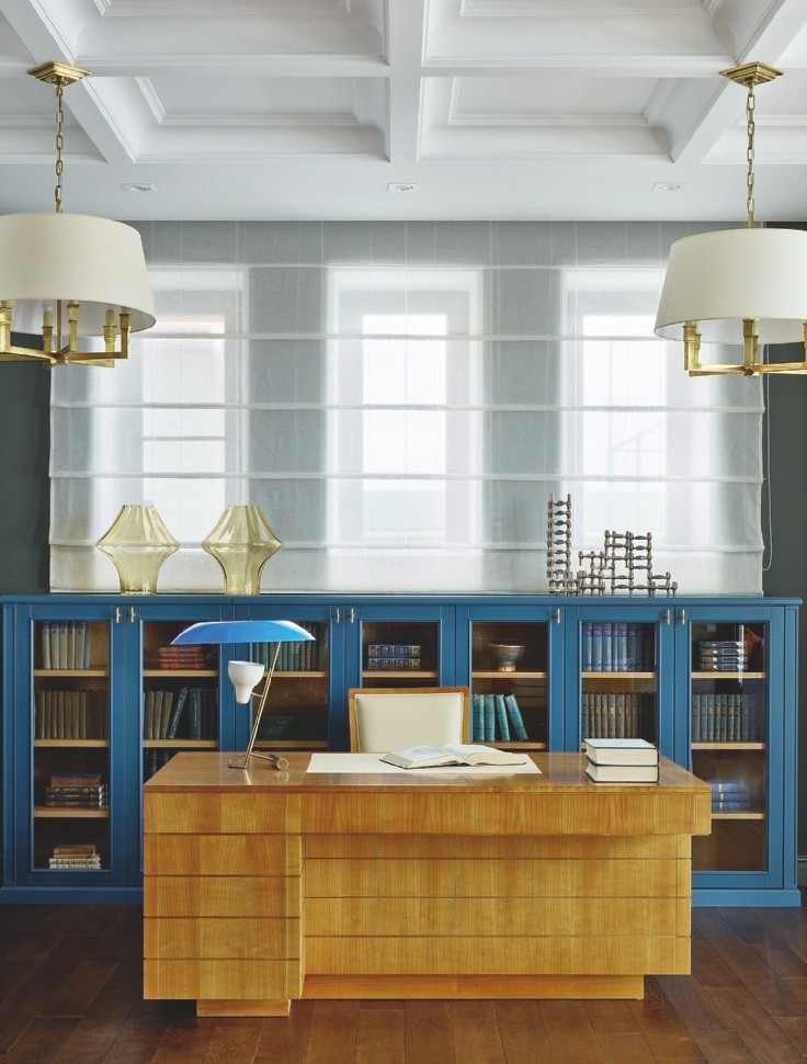 Несмотря на спокойную цветовую палитру, в целом интерьер выглядит удивительно тёплым и красочным за счёт декора, предметов искусства, ярких оттенков в обивке и текстиле. «Один из основных моих приёмов — цвет, — продолжает Ксения. — Я всегда его использую, люблю миксовать, сочетать разные оттенки или, наоборот, работать на контрасте. Меня не пугают глубокие, насыщенные цвета, я умею с ними обращаться. Кабинет в этом проекте яркое тому доказательство».