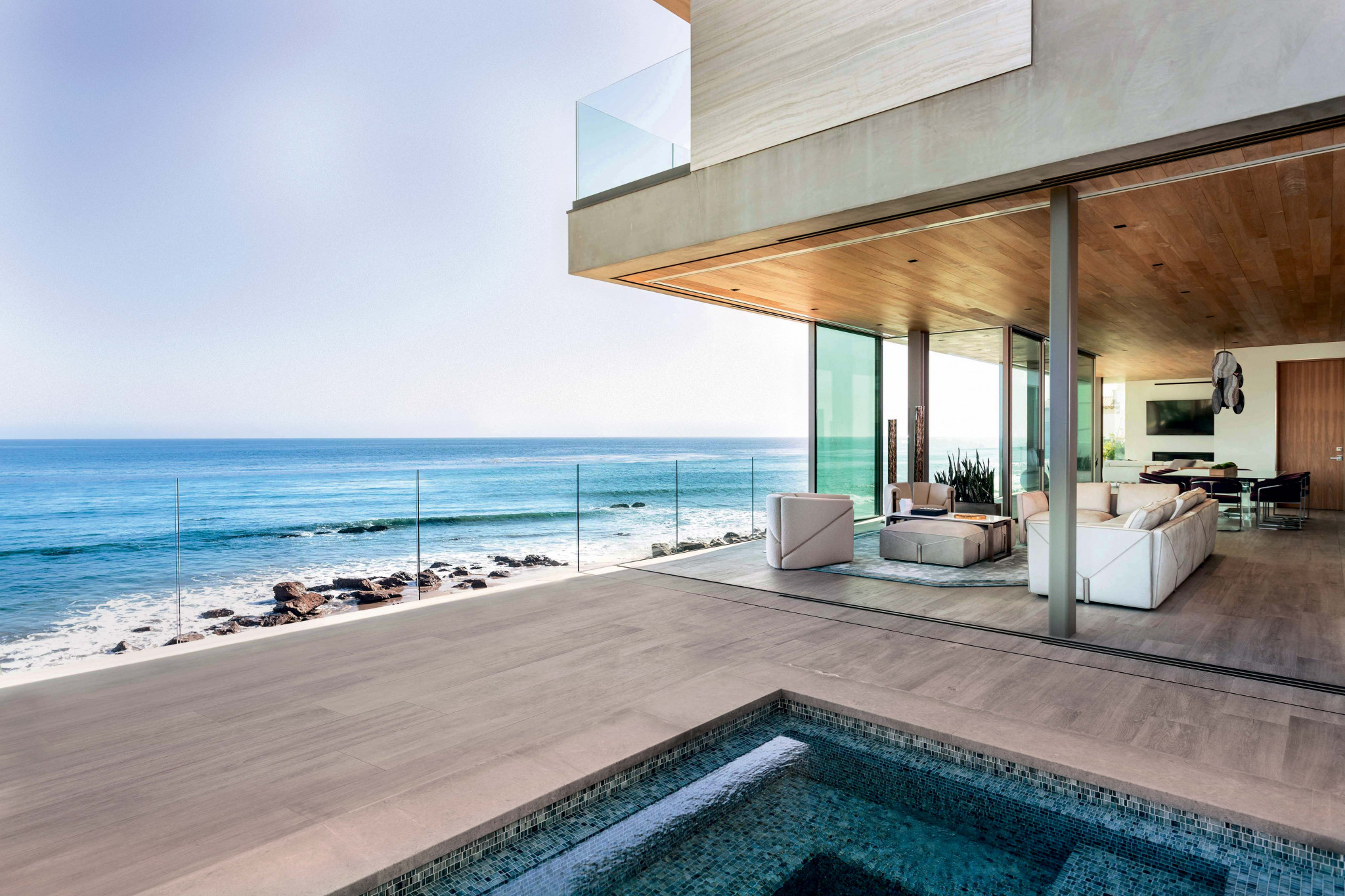 Основной этаж отведён под перетекающие друг в друга помещения гостиной, парадной столовой и кухни. Фактически это одно общее пространство, зонированное с помощью продуманной расстановки мебели. Оно органично завершается большой открытой террасой с бассейном. Если открыть все окна в пол и перегородки между интерьером и экстерьером (как в случае с гостиной и террасой с бассейном), то весь этаж превращается в одну бесконечную приморскую анфиладу, наполненную солнцем и воздухом. Этот же принцип выдержан в оформлении второго этажа, отведённого под спальни. Так, в главной спальне собственно кровать и прикроватная мебель находятся рядом с каминной зоной (ею пользуются в зимнее время года, когда бывают шторма), а та, в свою очередь, переходит в открытую террасу. Всё пространство же благодаря высоким раздвижным окнам легко объединяется с балконом, выходящим на океан.