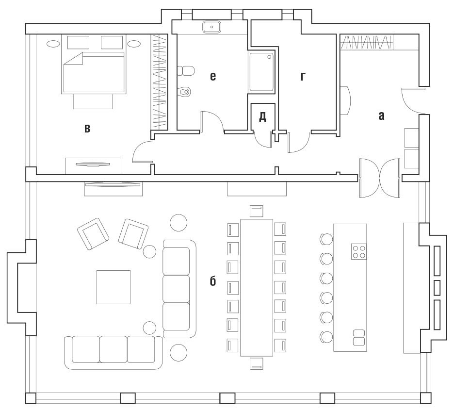 Заказчик поручил Елене разработать интерьер гостевого дома, основной функционал которого планировался как ивент–пространство. Именно поэтому большую часть площади архитектор отдала под просторную общественную зону. Помимо гостиной с мягкой диванной группой здесь есть столовая с большим столом на шестнадцать человек, кухня с казаном, настоящим дровяным мангалом и даже тандыром. Раздвижные окна–перегородки в пол с трёх сторон помещения наполняют пространство светом и при необходимости превращают гостиную в уличную беседку, откуда можно выйти на открытую террасу у воды. «Основные центры притяжения в доме — два «очага»: камин и мангал, — поясняет автор проекта. — Мы расположили их напротив друг друга, на фронтальных стенах, подчеркнув таким образом их главенствующее положение. Обеденный стол — ещё одна значимая деталь в интерьере. Он выполнен по нашему проекту. Для его создания использовали спилы из ствола карагача длиной более пяти метров. Как оказалось, ствол такой длины — большая редкость, и мы его искали почти полгода».