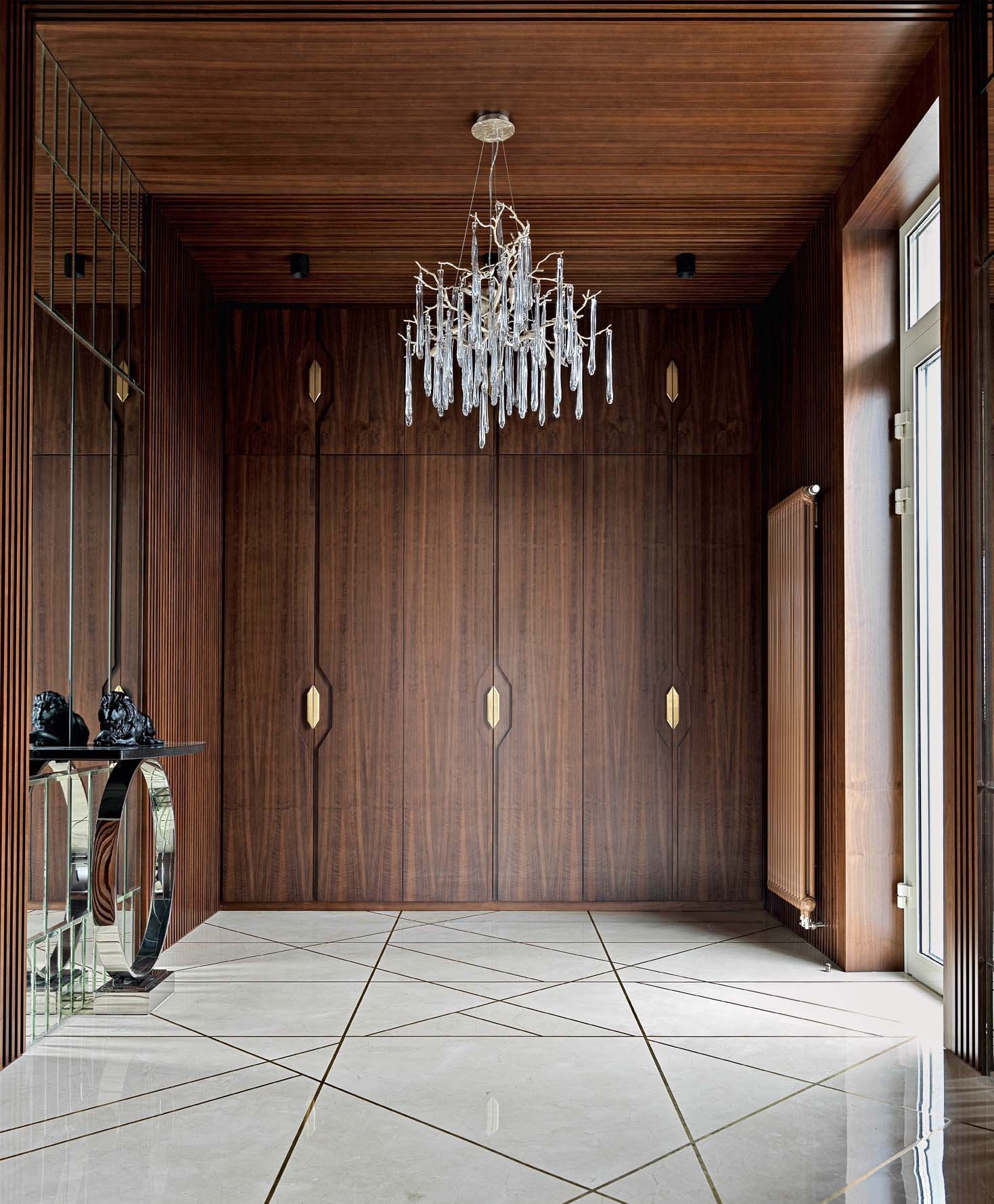 В оформлении использованы дорогие, статусные марки мебели, натуральные, природные материалы и приятные фактуры, которые создают, с одной стороны, атмосферу отдыха, а с другой — динамичную среду для домашних праздников. Пол в гостиной и спальне выложен паркетной доской из тонированного дуба, в холле и коридоре —мрамором с инкрустацией из латуни. Стены декорированы деревянными буазери и рельефными наборными панелями из мрамора, а потолок — деревянными панелями и балками. Пристальное внимание архитектор уделила тактильности предметов. Это мягкие и уютные обивки мебели, ковры, тёплые поверхности дерева, к которым приятно прикасаться. В свою очередь натуральный гранит с колотым краем и холодные гладкие поверхности мрамора привносят в интерьер эффектный контраст. Стилистика пространства в меру современная с налётом лоска и респектабельности выбрана не случайно, ведь по заданию заказчика гостевой дом должен был стать логическим продолжением основного дома как во внешнем облике, так и во внутреннем. «У хозяев довольно часто бывают гости: партнёры по бизнесу, медийные личности,— замечает Елена.— Шумные и весёлые застолья могут помешать маленьким детям, поэтому заказчик решил создать отдельное пространство, позволяющее отдыхать и детям, и взрослым, не мешая друг другу. Даже несмотря на некую функциональную легкомысленность дома, мы старались сделать всё, чтобы интерьер соответствовал статусу хозяев».