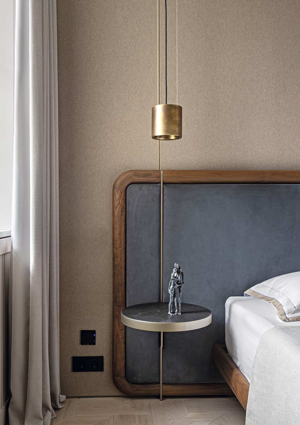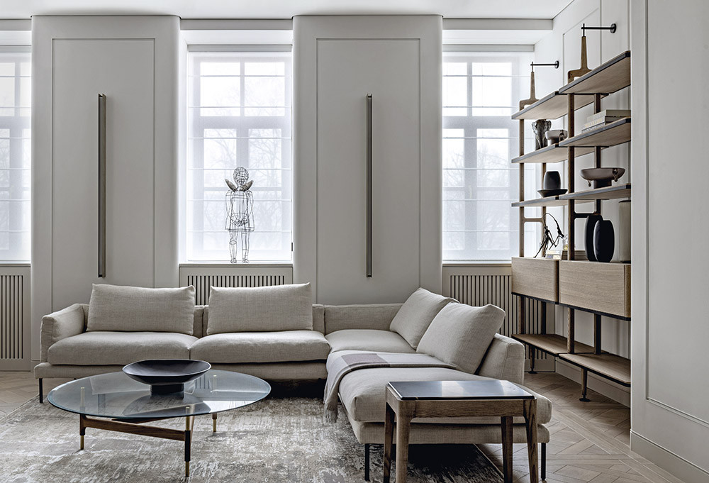 Винтерьере авторы проекта отразили образ города на Неве, переосмыслив его в контексте современности. «Базовая концепция объединяет эстетику классических мотивов и минималистичных, — объясняет Андрей Юдин, — и это придает современное звучание традиционным классическим элементам. Так, например, стеновые панели с теневым швом по периметру заменяют здесь классические гипсовые филенки.