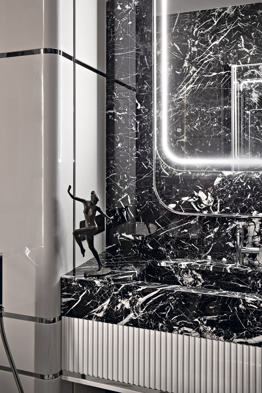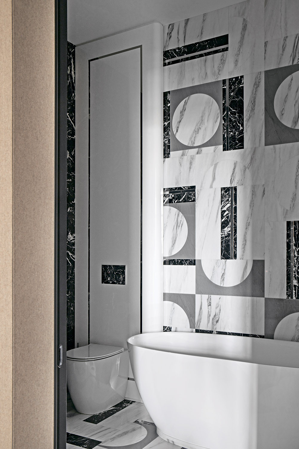 В данном случае интерьер делали для семьи с двумя детьми, что повлияло на планировку: квартира имеет определенное функциональное зонирование и состоит из кухни-гостиной, мастер-зоны с гардеробной и ванной комнатой, детской зоны, входной и постирочной. Из систем «умного дома» по желанию заказчика было реализовано умное управление климатом. Цветовую гамму выбрали монохромную: это и дань лаконизму, и оммаж любимому городу с его неяркой природой. Но черно-белая история при всей своей кажущейся сдержанности может быть яркой и эффектной. Так, из небольшого, полностью черного холла мы попадаем в белую гостиную, наполненную светом и воздухом. Благодаря цветовому контрасту подчеркивается контраст пространств, создается «вау-эффект», эмоциональный заряд. Мастер-спальня также решена в монохромной цветовой палитре, но сочетания подобраны более мягкие: тут использовали серо-бежевые текстильные панели из шерсти в сочетании с бежевыми столярными панелями. Светлый шпон в детской разбавляет и смягчает строгое сочетание серого и белого. Авторы проекта учли и то, как будут проявлять себя в проекте разные фактуры, разные материалы. Так, тактильно приятные текстильные панели в изголовье кроватей создают законченный образ уютных спален. А в парадной по характеру прихожей — другая комбинация материалов: на полу — белый мрамор, на стенах — текстильные обои, шкаф выполнен из кожи черного цвета, на глянцевом лаке в отделке дверей, плинтусов и порталов играют блики.