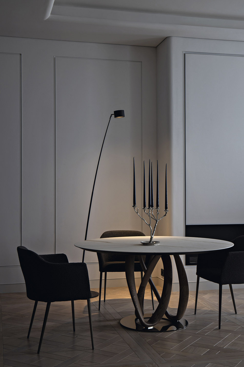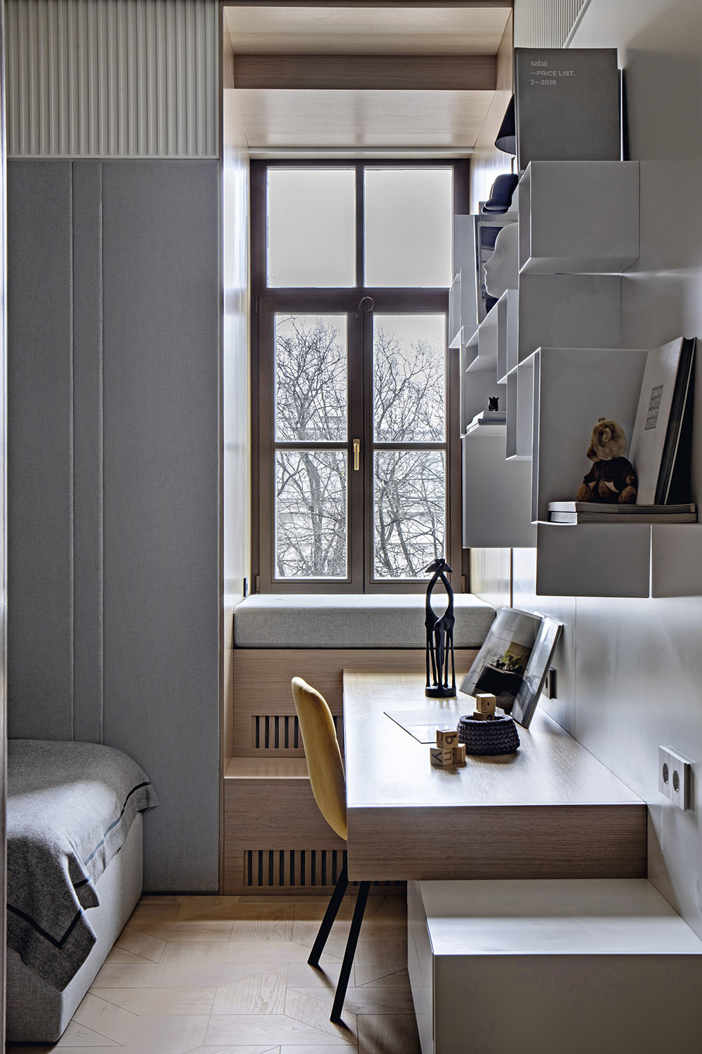 Тандем минимализма и классики создает в интерьере нужный временной контекст, а значит — актуальный и функциональный дизайн». Здесь есть и прямые «цитаты», но их немного. Например, наборный паркет «версальского» плетения: подобный нередко можно было встретить в исторических или дореволюционных санкт-петербургских квартирах.