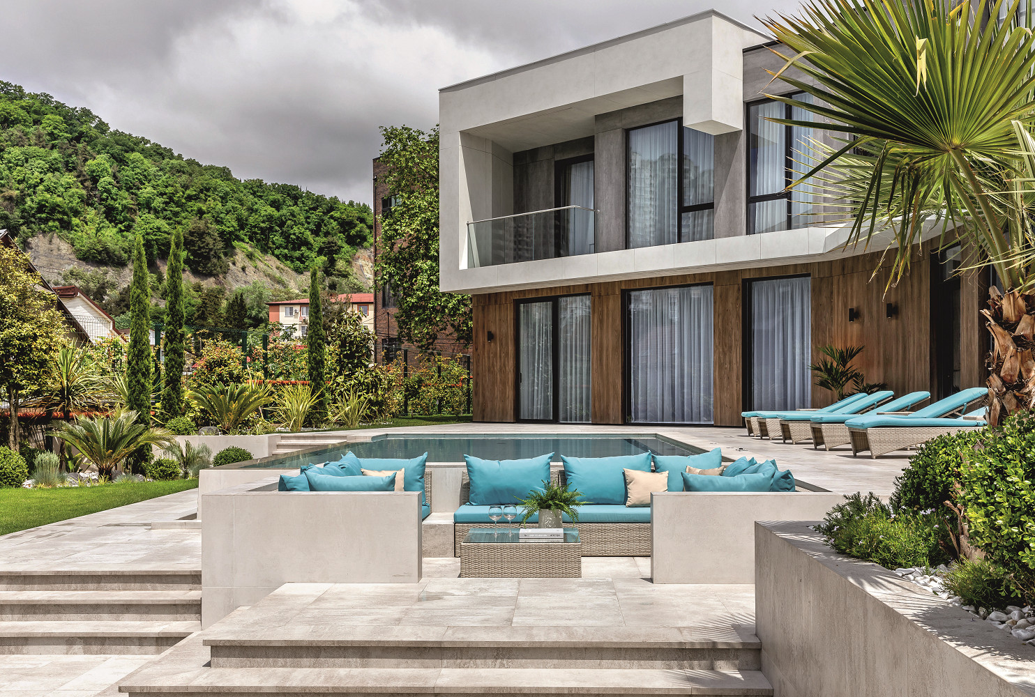 Архитектор Наталья Толмачева присоединилась к проекту в самом начале, когда на 10 сотках в Сочи только шла подготовка к строительству. Форма участка, рельеф земли и расположение соседних коттеджей продиктовали нестандартную архитектурную форму дома — в виде галочки. По желанию заказчика у бассейна разметили тропические растения, а крупномеры в зоне отдыха создают прохладную тень в жаркий день. По периметру дома высажено много вьющихся растений, которые образуют «живые» зеленые изгороди. «Заказчик — солидный бизнесмен — обратился ко мне с пожеланием спроектировать дом для его большой семьи. Он полностью мне доверился и не вносил правки в процессе стройки. Это очень ценно. Практически все, что я предлагала в качестве идей, все материалы и мебель — принималось сразу. Что может быть прекрасней!» — делится общим замыслом архитектор.
