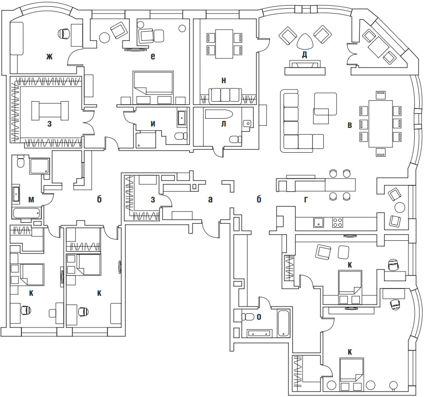 Квартира, над которой работали Елена Куртина и Жанна Тульнова из студии «Шпиль», расположена в центре Санкт-Петербурга, в комплексе, архитектура которого напоминает османовские французские дома. Перед авторами стояла задача привнести в интерьер разнообразие декора и фактур, а также создать пространство, отвечающее потребностям каждого члена семьи. «Заказчики — большая семья с четырьмя детьми разных возрастов. Всем детям хотелось иметь свою комнату с гардеробом и санузлом, — дополняет Елена Куртина. — Это предполагало достаточно большое количество помещений, но нам очень хотелось сохранить ощущение открытого пространства. Поэтому гостиную, кухню и общие холлы мы сделали максимально просторными. Большую роль в достижении нужного ощущения сыграло панорамное остекление в квартире».
