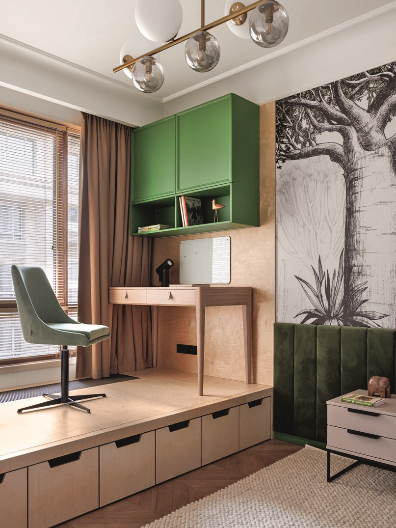 В семье подрастают четверо малышей, и их воспитанию родители уделяют особое внимание. Основной запрос касался именно детских — их оформления и смыслового наполнения. Архитекторам дали четкие инструкции по каждому помещению и его наполнению. Например, относительно цвета: кого‑то надо было немного «успокоить», кого‑то «взбодрить». Одному добавить живое дерево для заботы о нем, а другому дать возможность бросать мяч, скакать и выплескивать энергию. Была организована комната для уроков в общей зоне, чтобы было удобно делать домашнее задание со всеми детьми вместе или заниматься с репетиторами по отдельности. «Взрослым же было важно наличие авторских работ в интерьере, — говорит Елена. — Поэтому у нас сразу родилась концепция большого арт-объекта в гостиной зоне. И, поскольку заказчица увлекается восточными практиками, мы решили создать большое гипсовое панно с восточной символикой, которое выполнила на заказ студия «Талеон».