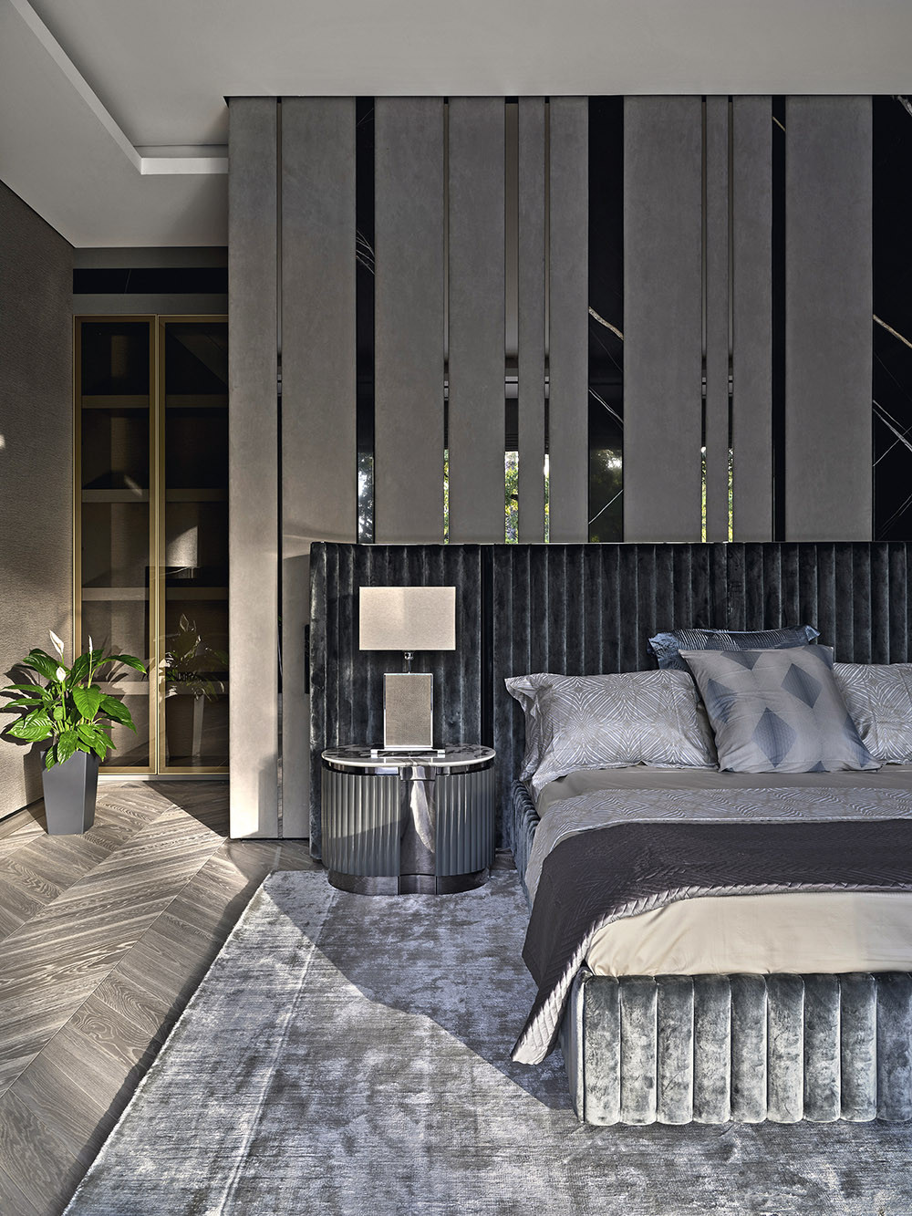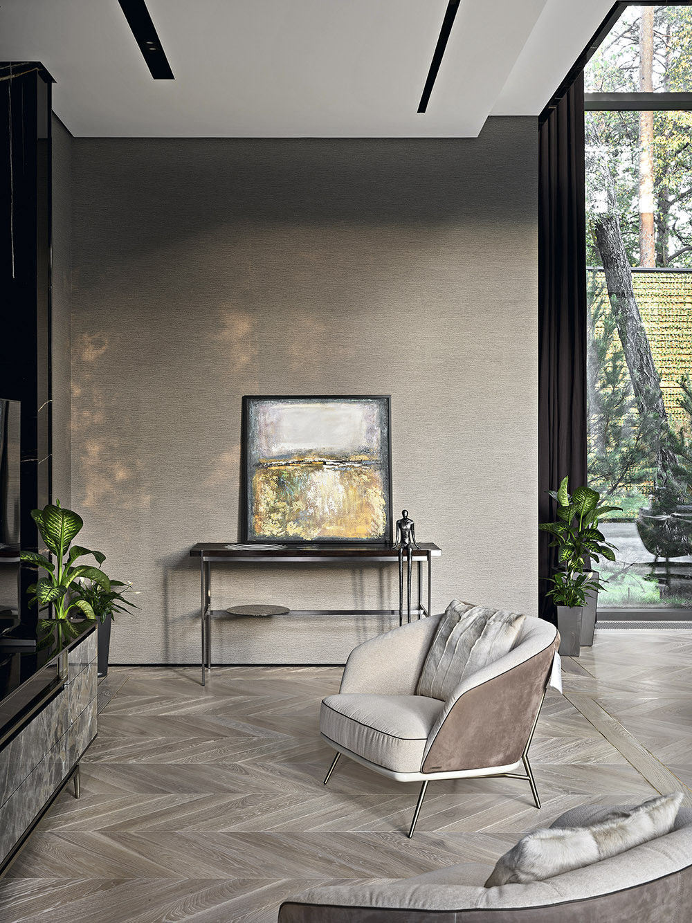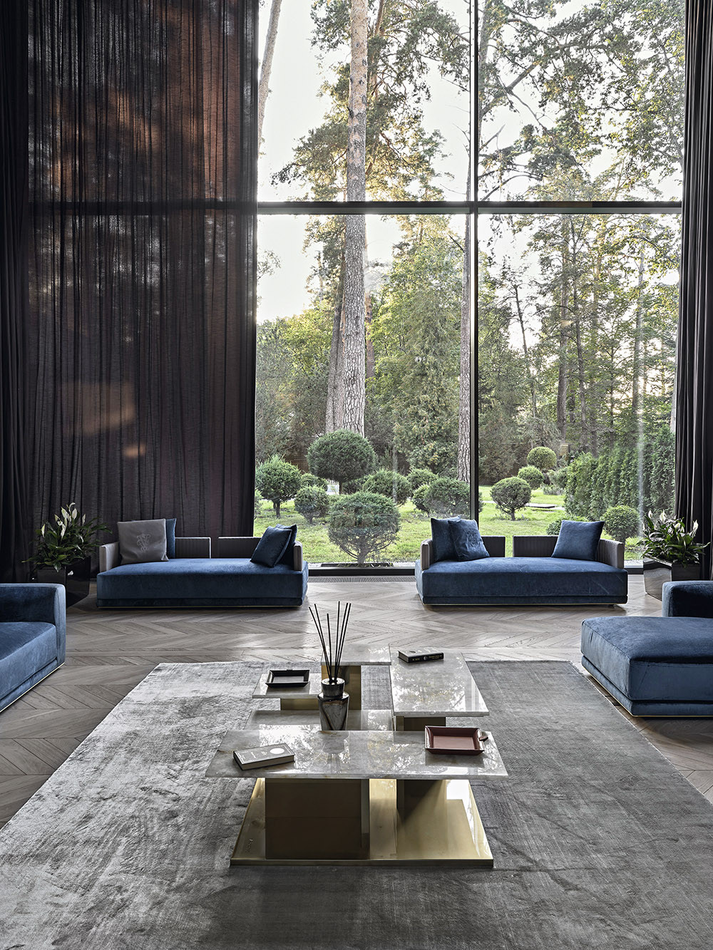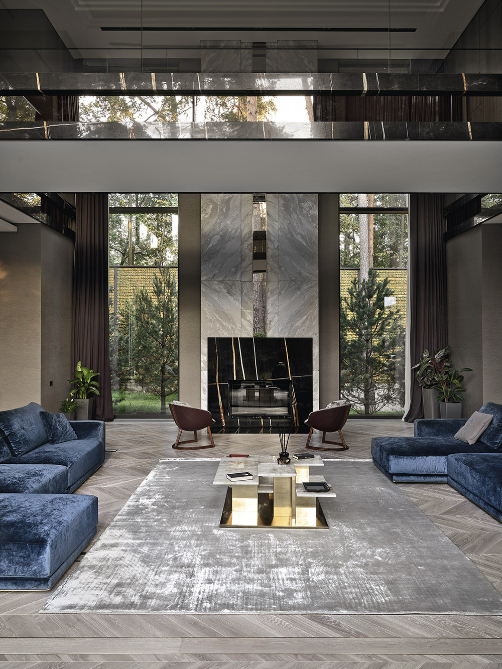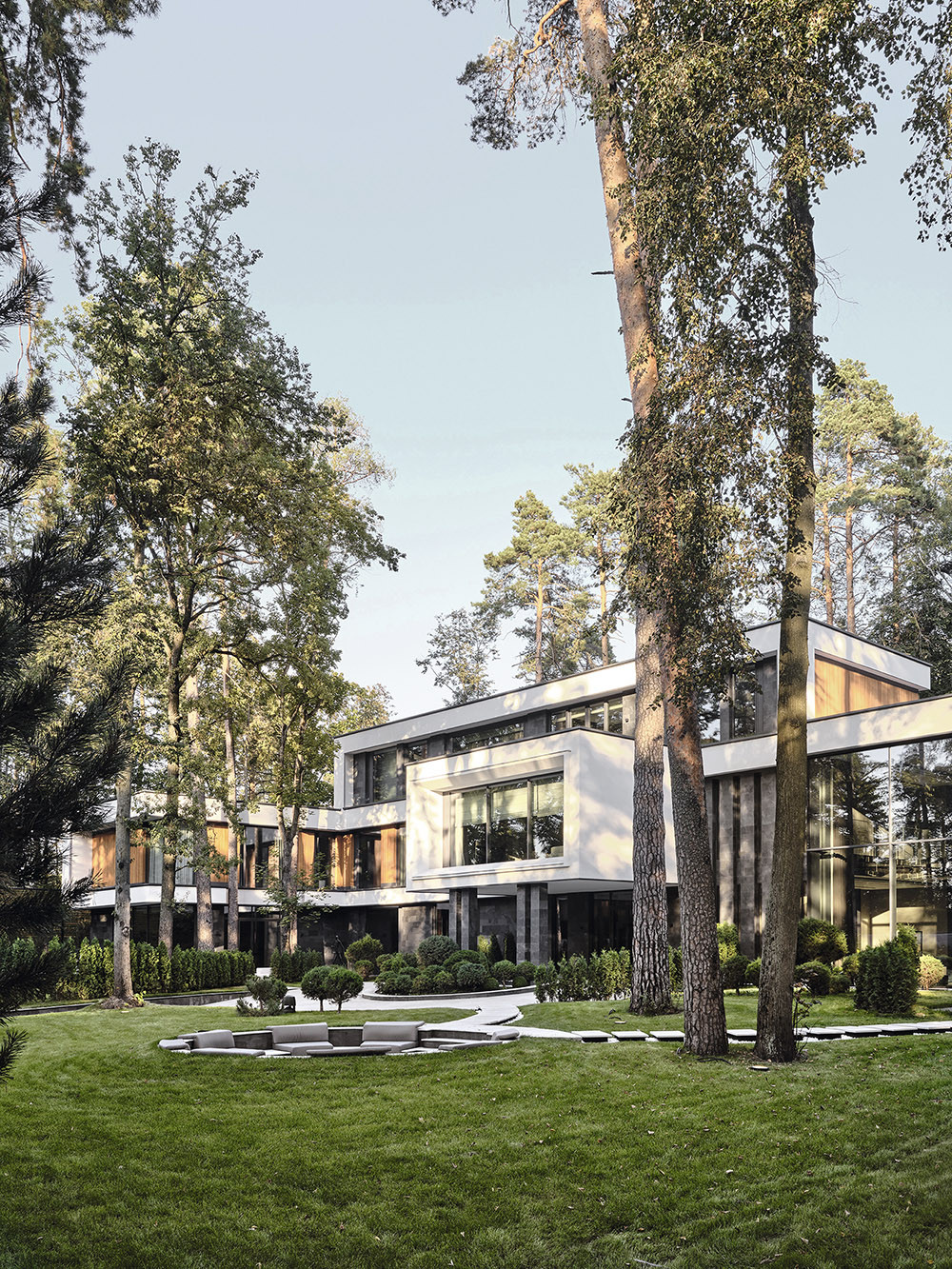 На первом этаже расположилась просторная гостиная с расслабляющей мягкой мебелью Fabio Bonfà. Здесь можно посидеть у дровяного камина и полюбоваться лесом в обрамлении высоких окон. Также внизу находится спа-центр с бассейном, хаммамом и сауной. В нем ключевую роль играет освещение: множество линейных светильников может кардинально преобразить атмосферу в вечерние часы и создать атмосферу утонченной роскоши. Мебель из дерева ироко от m2 atelier, рассчитанная как для интерьера, так и для outdoor-пространств, изысканно смотрится в зоне бассейна с выходом на террасу. На втором этаже — детские спальни и гостиная, а еще выше — блок хозяев с отдельной террасой. Здесь царит приватность — дом спроектирован так, что эту зону нельзя увидеть снаружи или из других помещений. В спальне хозяйки архитектор разместил встроенный в стену камин, а за мягким изголовьем кровати от Alessandro La Spada прячется вход в дополнительную гардеробную. Как и сам дом, участок в 0,42 гектара стал полноправным аспектом проекта. Главная подъездная дорожка с кольцевой развязкой напоминает старинные русские усадьбы. Вокруг раскинулся уединенный сад с деревьями бонсай, углублением для костра и плавно изогнутыми тропинками. Сергей Буринский адаптировал мировые тренды для холодного климата — в зимние месяцы дорожки отапливаются, а вечнозеленые деревья поддерживают зонирование территории.