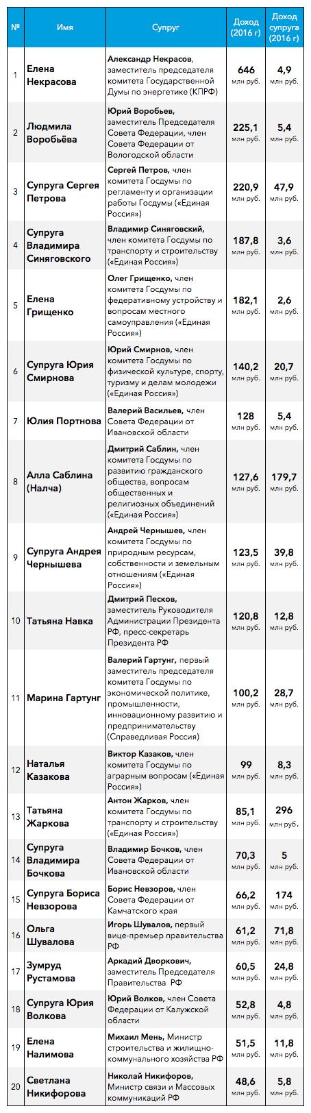 В 2016 году первая десятка богатейших жен чиновников задекларировала доходы на общую сумму 2,1 млрд рублей. Больше всех в топ-10 жен депутатов Государственной думы, преимущественно от фракции «Единая Россия». Но вошли в рейтинг и супруги сенаторов, и только одна «вторая половина» сотрудника Администрации президента – жена пресс-секретаря президента Дмитрия Пескова фигуристка Татьяна Навка заработала почти в 10 раз больше Пескова.