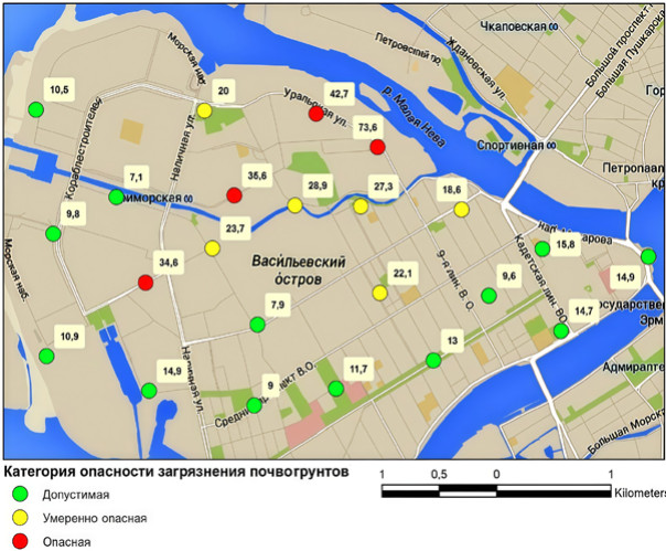 Подробнее с результатами исследования почв и снега на Васильевском острове можно ознакомиться в статье: Лебедев С. В., Агафонова Е. К. Экологогеохимическая оценка загрязнения окружающей среды по данным мониторинга содержания тяжелых металлов в почвогрунтах и снежном покрове (на примере Василеостровского района Санкт-Петербурга) // Вестник СПбГУ. Науки о Земле. 2017. Т. 62. ВЫП. 4. С. 357–369. https://doi.org/10.21638/11701/ spbu07.2017.403