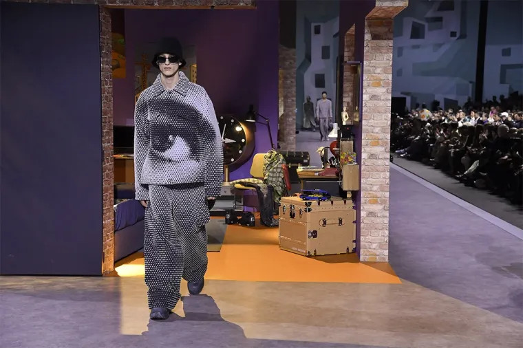 Показ коллекции Louis Vuitton в Париже, в специально выстроенном павильоне во дворе Лувра, проходил в декорациях, которые придумали братья-клипмейкеры и кинорежиссеры Мишель и Оливье Гондри, известные сюрреалисты и выдумщики. По их замыслу на сцене взору открывалась проекция эволюции комнаты мальчика: от детских кубиков и качалок-лошадок в одном пространстве, через подростковые игры и первые учебники в другом, и, наконец, до взрослой кровати, пластинок и плакатов на стене в юности абстрактного героя. Модели проходили насквозь этот маршрут «взросления» и представали перед публикой на подиуме в спортивно-элегантной одежде сложного кроя с многораммами, аппликациями, стеганными элементами и без них.. После скоропостижной кончины креативного директора мужских коллекций Вирджила Абло автором нынешней стала сборная команда Louis Vuitton Studio Prêt-à-Porter Homme. Правда, впервые в этом процессе участвовала и приглашенная творческая единица — 30-летний американский дизайнер Колм Диллейн, основатель бренда уличной одежды KidSuper. Возник он в этом качестве не случайно, а потому что в 2021 году стал финалистом конкурса LVMH Designer Prize и вообще прославился многими успешными коллаборациями — от Puma до Dover Street Market. Гондри утверждают, что наполнили этот неожиданный для модного шоу кинематографичный мир собственными ностальгическими воспоминаниями. Был ли в их юношестве желтый кадиллак, который сейчас стоял по центру подиума как чья-то реализованная мечта, режиссеры умолчали. Но именно на крыше этого «олдкара» в финале шоу спела свое поп-фламенко Розалия, четырехкратная лауреатка Latin Grammy Awards 2022 и первая испанская певица, получившая награду MTV.