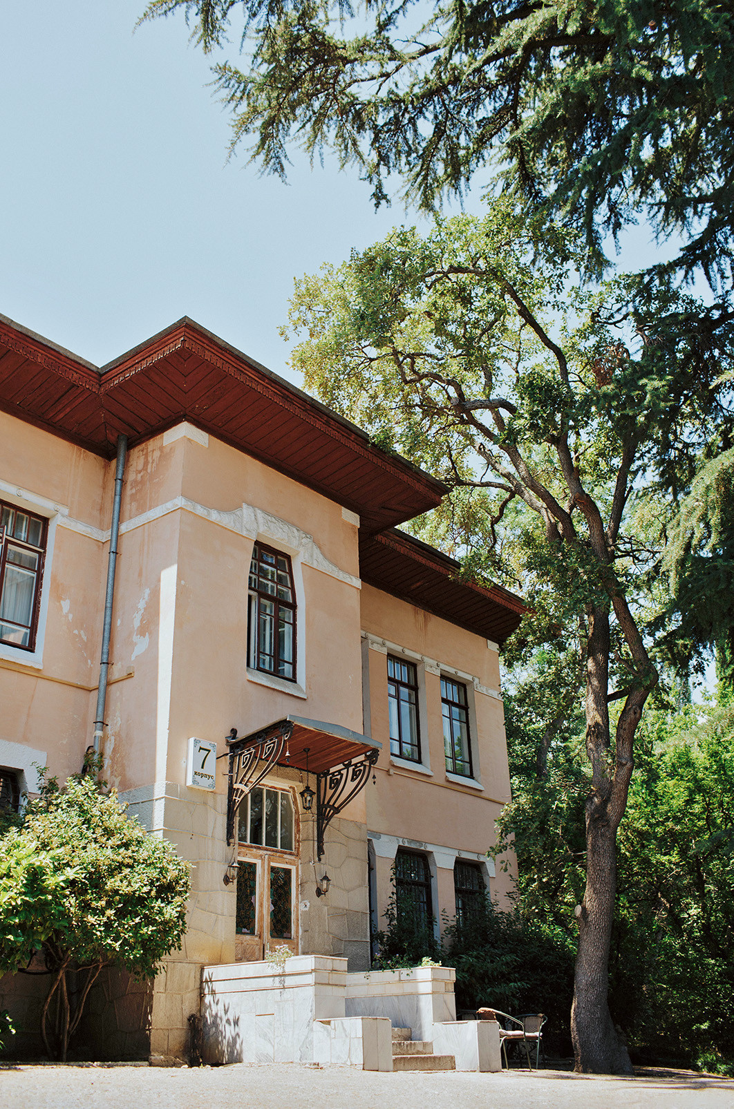Двухсотлетний дом, где находится гостевой дом Villa 7, помнит польского графа Потоцкого — он был хозяином ливадийских земель до того, как Александр II подарил их супруге Марии Александровне. Помнит, как модный московский архитектор Монигетти приехал к правящей чете и построил Большой дворец, а гостевому дому, тогда «дому для старших слуг», нарастил второй этаж и добавил укрепительные арки, противостоящие сползанию по крутым склонам южного берега Крыма. Помнит, как в советское санаторно-дачное время его стали звать «корпусом» и присвоили номер — седьмой.