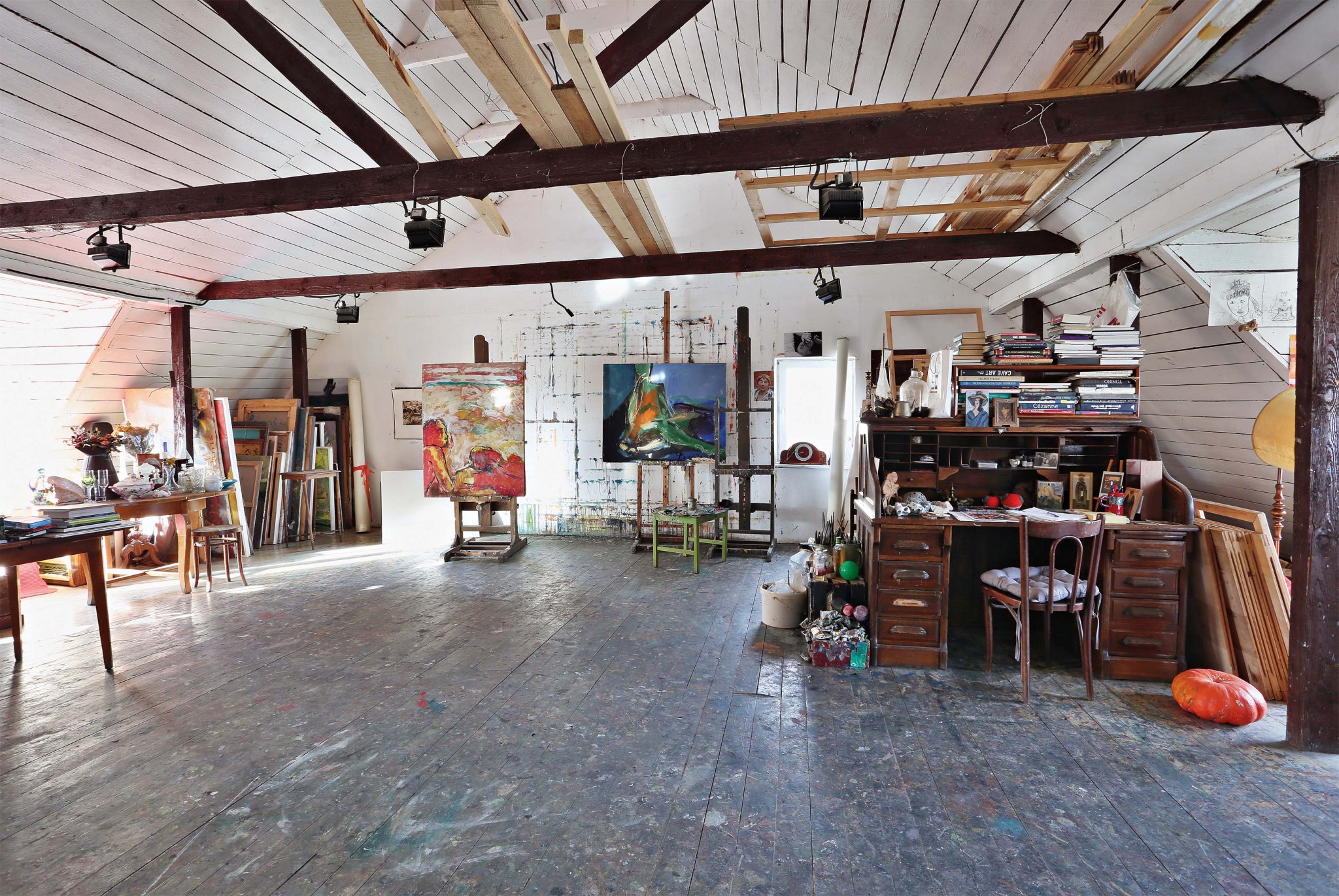 Дальше — покупка, сломанные стены, открывшееся пространство и вырытый подвальный этаж, которого изначально не было: «Я как‑то почувствовала, что галерея получится интереснее, если пространство будет развиваться, уходить вниз. На первом этаже живопись, а внизу я выставляю графику и мелкую пластику». Для любой работы нужно уединение. Как его найти маме пятерых детей? «Трудно было с маленькими, там не про работу мысли были, а просто, если тишина вдруг, если все уснули — лежишь и не шевелишься. Сейчас я ухожу в мастерскую, закрываю дверь, и никто ко мне не входит. Мне нужно полнейшее сосредоточение, внутренняя собранность, которая не всегда наступает. Часто перед тем, как подойти к холсту, я сижу часа два-три — договариваюсь сама с собой. Конечно, это все сложно. Для меня живопись — такая пытка постоянная».