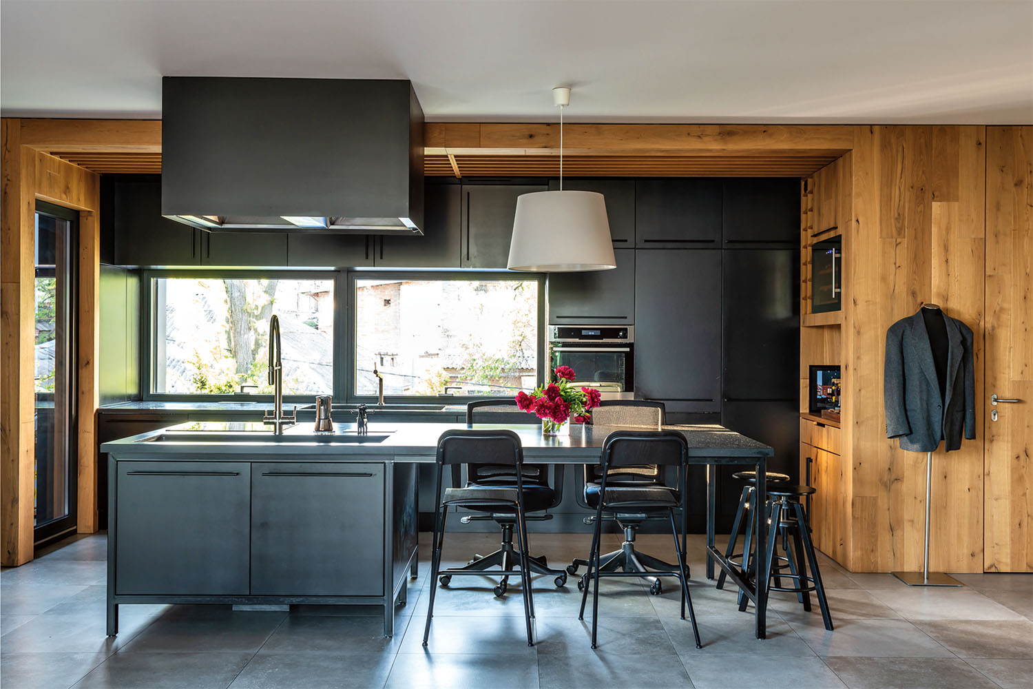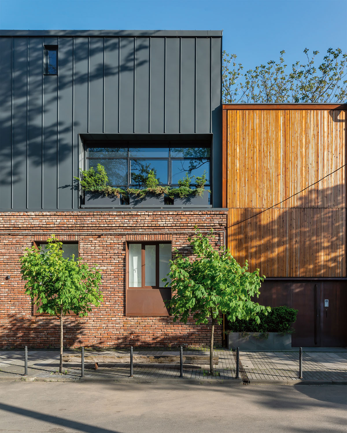 Я построил дом в центре Ростова. Внизу расположена моя архитектурная мастерская, а наверху живет наша семья. На этом месте раньше была советская промышленная постройка в полтора этажа. Я не стал ее сносить, а решил реконструировать и надстроить. Тонкие стены мы облицевали кирпичом, оставшимся после разбора старых зданий. Благодаря особой кирпичной кладке и удлиненным оконным проемам нижняя часть дома стилистически отвечает историческому кварталу города. А верхняя, надстроенная, часть сделана на контрасте, в современном скандинавском стиле — это легкий лаконичный фасад, обшитый черным металлом.