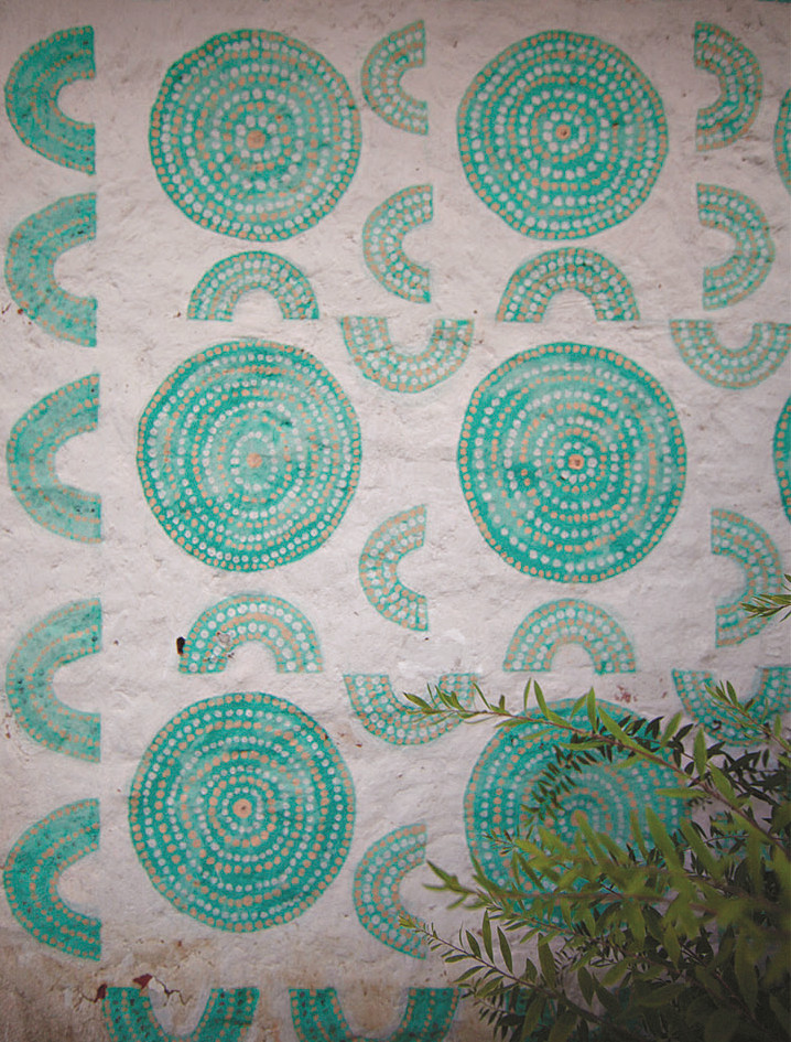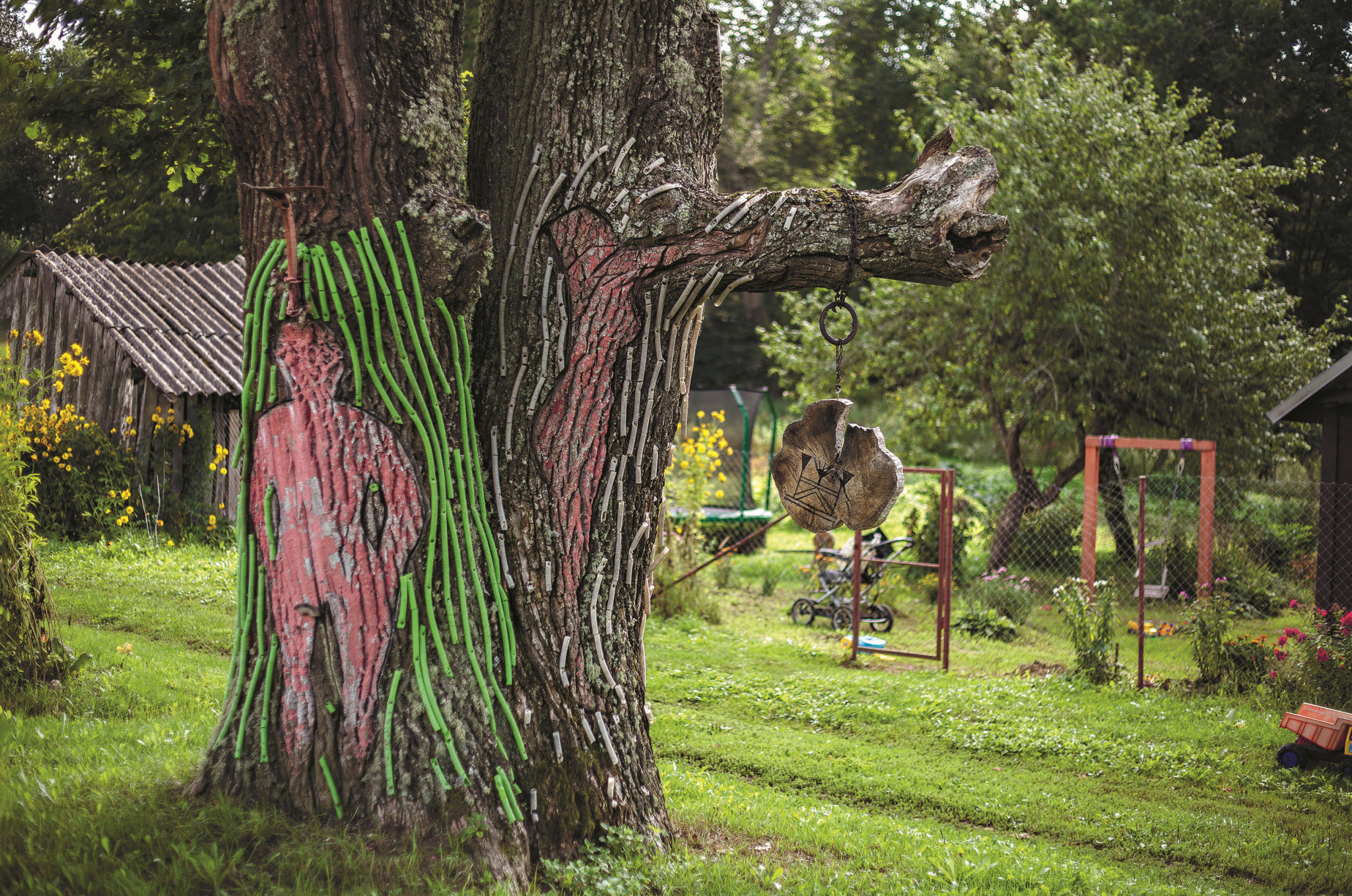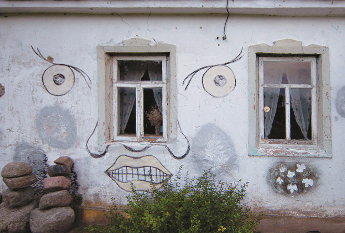 Галина ждет нас возле яблони, за ветви которой зацеплена леска, и на ней качается тоненькая занавеска. Ныряем под нее — бахрома легонько касается лба, будто рука. Чудеса начинаются. Вот стоит белый мазаный дом, здесь и жили хозяева. Глазастый дом, с характером. Рядом бывший хлев — домик поменьше, тоже расписанный Анатолием. Архаичные сюжеты снаружи, лопаты, грабли, ведра и другой садовый скарб — внутри. К египетским фигурам, пишущим что-то на папирусе, прислоняются доверчивые флоксы. К африканским маскам тянется малина. Жук, похожий на синего скарабея, застыл рядом с аккуратными капустными грядками.