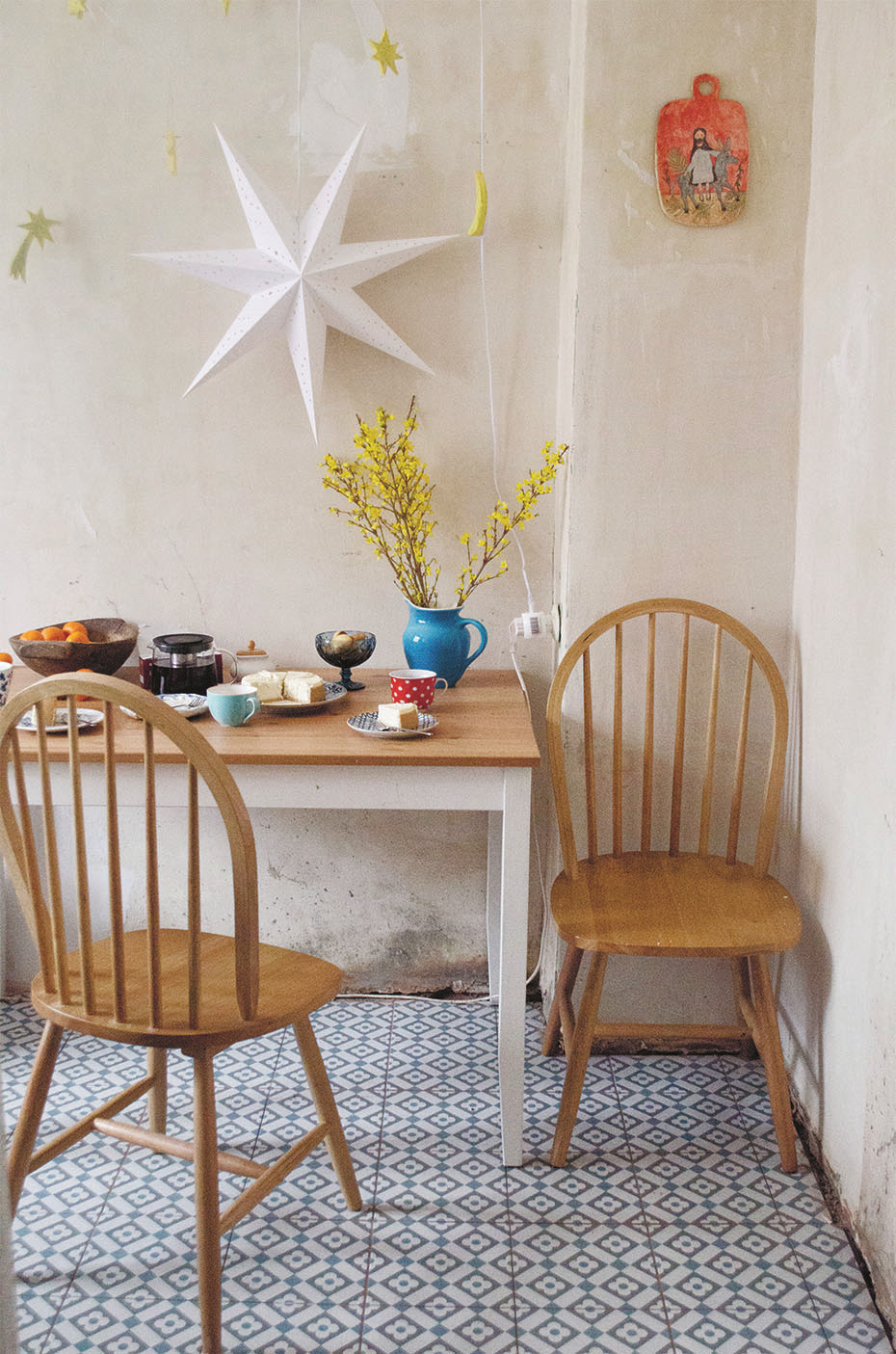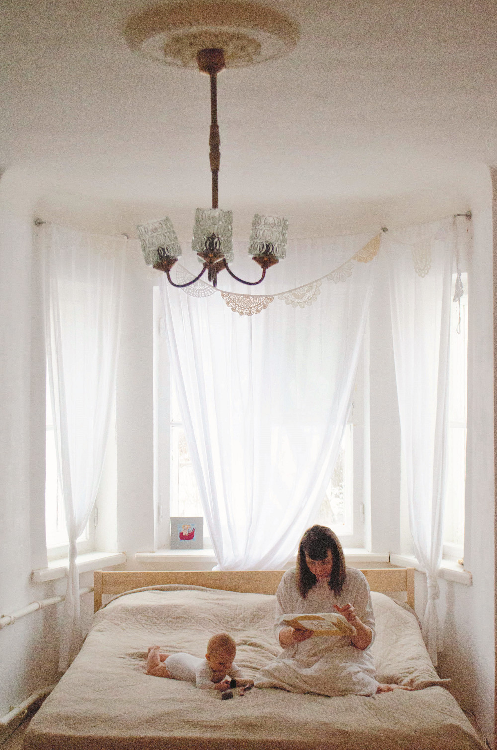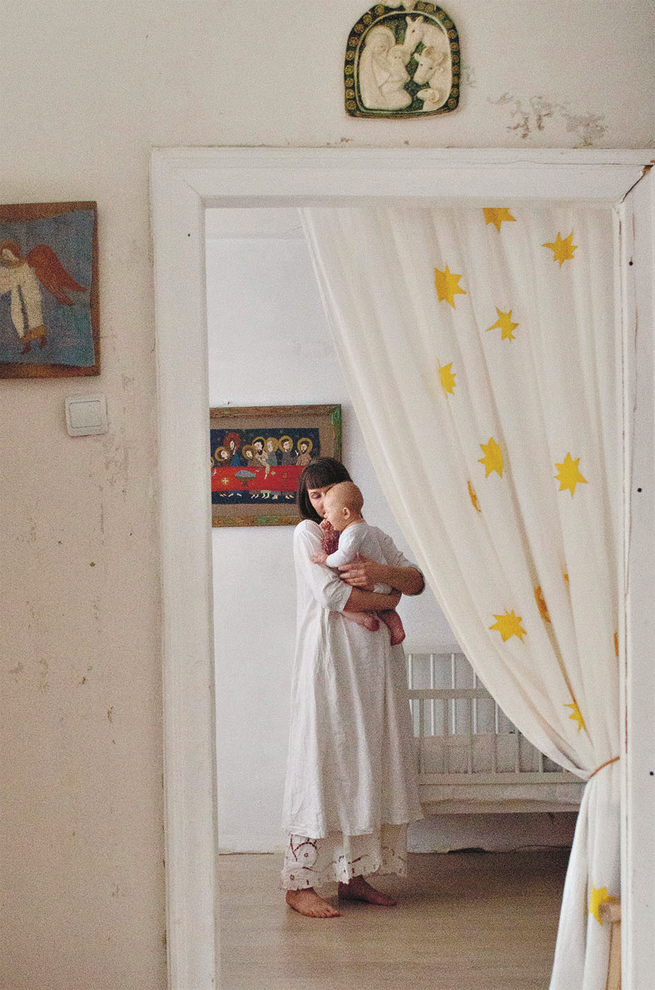 С вышивальщицей Верой Керинской мы знакомы давно и ждали, когда журнал и картины Веры — нежные, чуть наивные, живые — соединятся. Наконец нити сплелись: мы заходим в светлую квартиру Веры в Калуге, она встречает нас с дочкой на руках — та смотрит на нас с такими же удивлением и радостью в голубых глазах, как мы — на неоконченное метровое настенное панно, на котором вышит лик Христа.