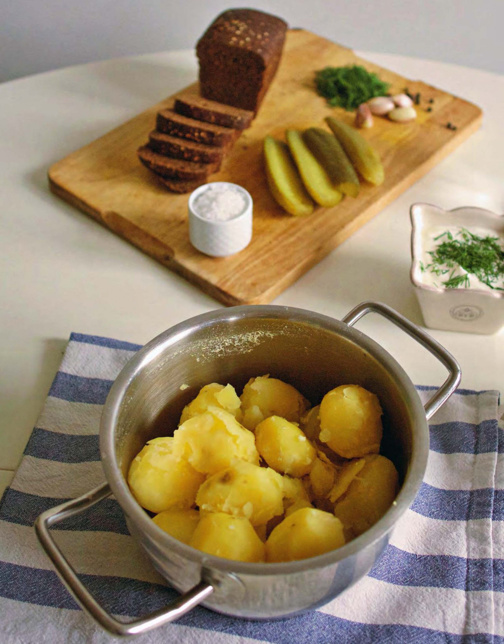 Вареная картошка, сметана, соленые огурчики, черный хлеб — такая еда отсылает к определенному времени, это, как мне кажется, образ Москвы 60-х годов: плавное и постепенное налаживание частной жизни, появление идеи некого домашнего и семейного уюта, который, тем не менее, еще несет на себе отпечаток тягот прошлых лет. Не просто вареная картошка на всю семью (как раньше), но «картошечка» и к ней скромные и недорогие дополнения: черный хлеб, сметана, укроп, соленья, шпроты, у кого-то,