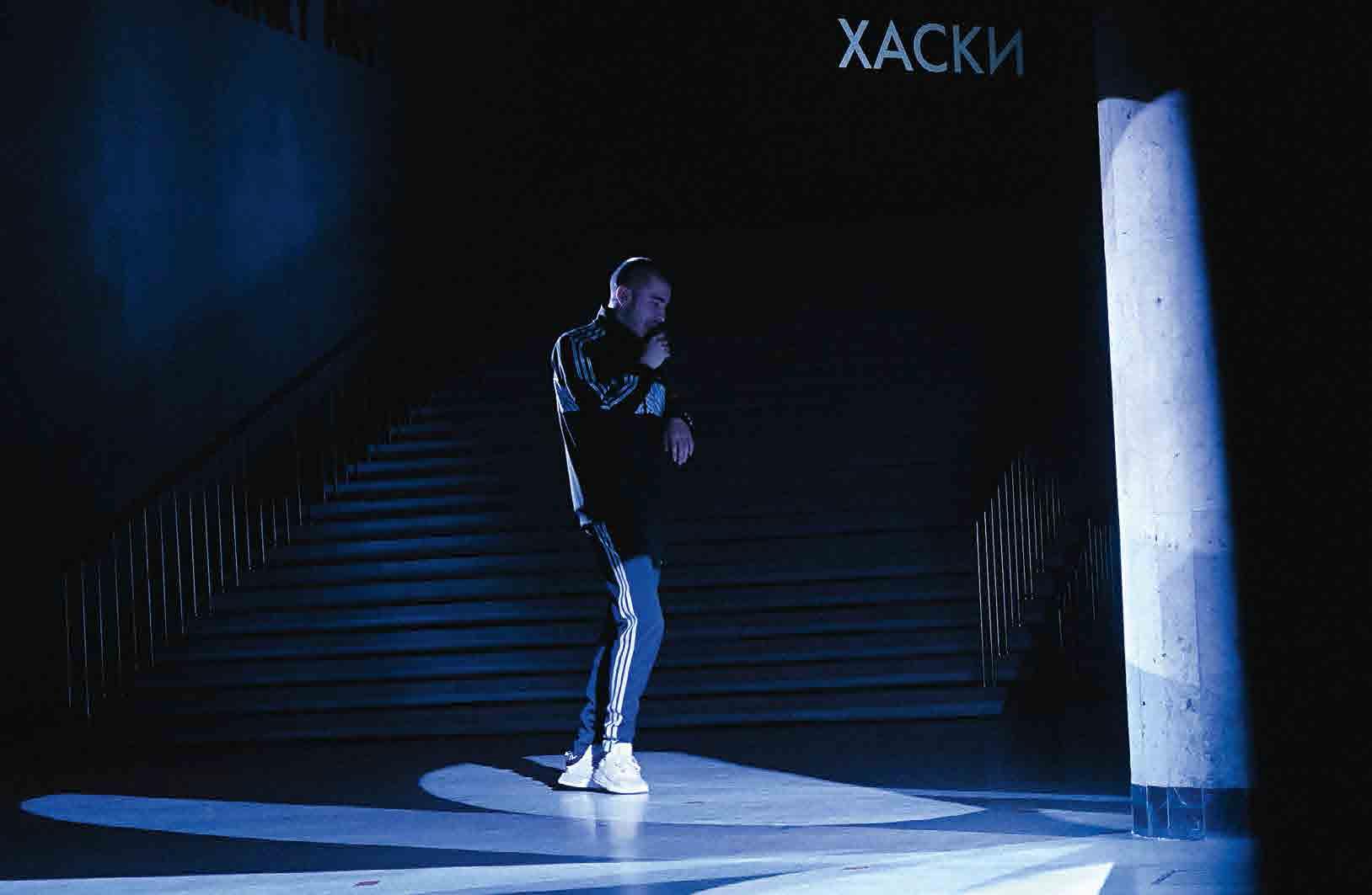 И вот забили куранты, зазвучала «Рабочая Марсельеза», и гости отправились через живой коридор актеров по парадной лестнице занимать места по периметру атриума. На сцене в пятне прожектора появился рэпер Хаски, как обычно, в костюме «Адидас» – бродя кругами вокруг колонны в центре зала, он исполнял песню «Бэнг бэнг», которая тоже наполовину состоит из лозунгов – но постсоветских, рекламно-газетных.