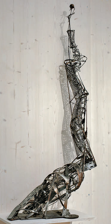 «Временные монументы» — серия проектных моделей, посвященных героям русского авангарда. Это своего рода оксюмороны — монументы, собранные из временных строительных конструкций. В работе, о которой вы спрашиваете, все началось со скелетов «Рабочего и колхозницы». Они довольно комичны, и я давно думал как-то их использовать. Почти случайно сделал набросок будущей модели, окруженной строительными лесами, и рисунок лесов оказался похож на татлинскую башню. Получилась скульптура внутри конструкции (и наоборот), конструктивизм внутри соцреализма (и наоборот). Эту модель я посвятил Вере Мухиной.