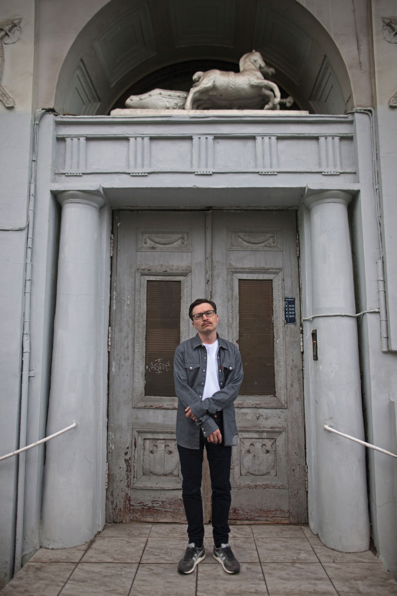 Спрей на поверхности стены в центре Петербурга — для меня слишком грубый прием. Для стрит-арта важно гармонично встраиваться в пространство мегаполиса, а в таком городе, как наш, вторгаться нужно особенно этично и тактично. Поэтому появилась идея делать проекции на стены домов — это антивандальное и одновременно заметное решение. Например, на одной из моих проекций человек пишет «главное не повторяться», затем приходит дворник, закрашивает фразу, и так по кругу. Это бесконечная история вокруг стрит-арта: ребята рисуют, потом муниципальные службы закрашивают. Проекции на фасады не попадают в обычную практику уличного искусства, потому что для этого нужна электрическая сеть, нужен мощный проектор — это не трафарет или просто рисование. Да, проекции живут всего несколько часов, но недолговечность — сама суть стрит-арта. Еще один вид мягкой интервенции — это маскароны с моими портретами. Cмотришь на них и не понимаешь: так должно быть или нет, это настоящее или кто-то сам повесил, почему у него очки, корона на голове? Это подвешенное состояние зрителя очень ценно для меня.